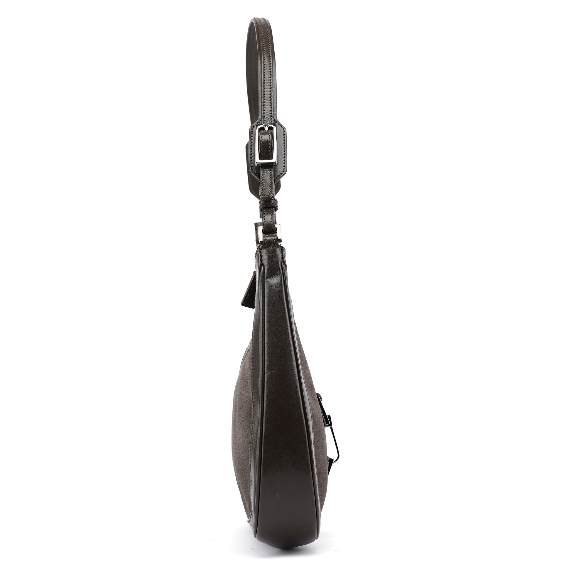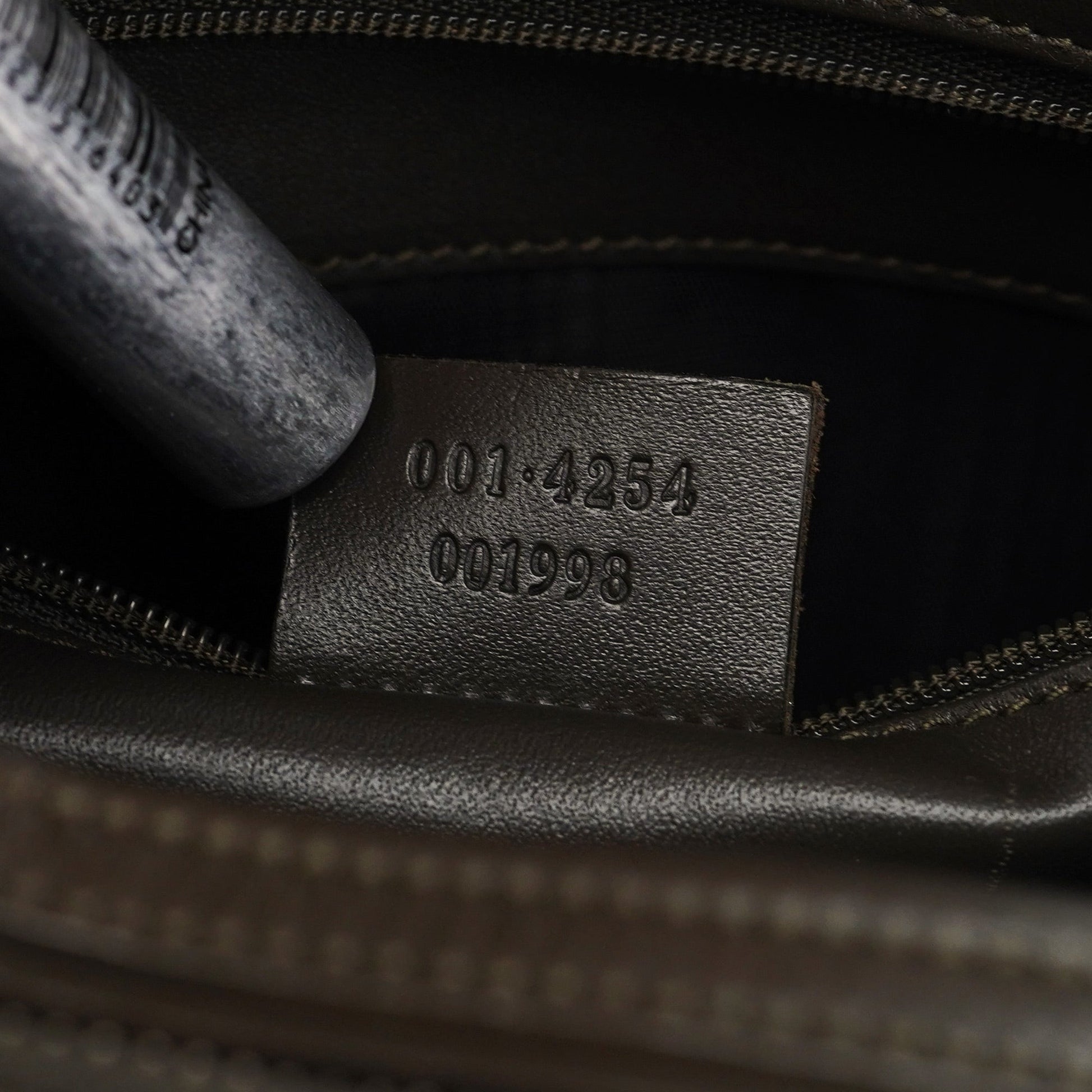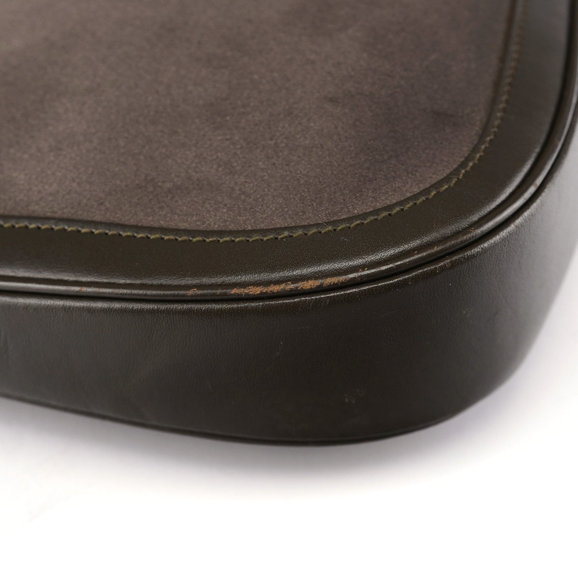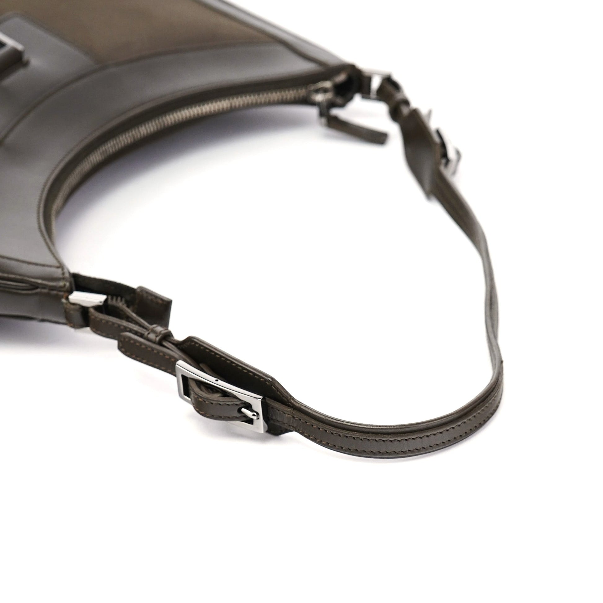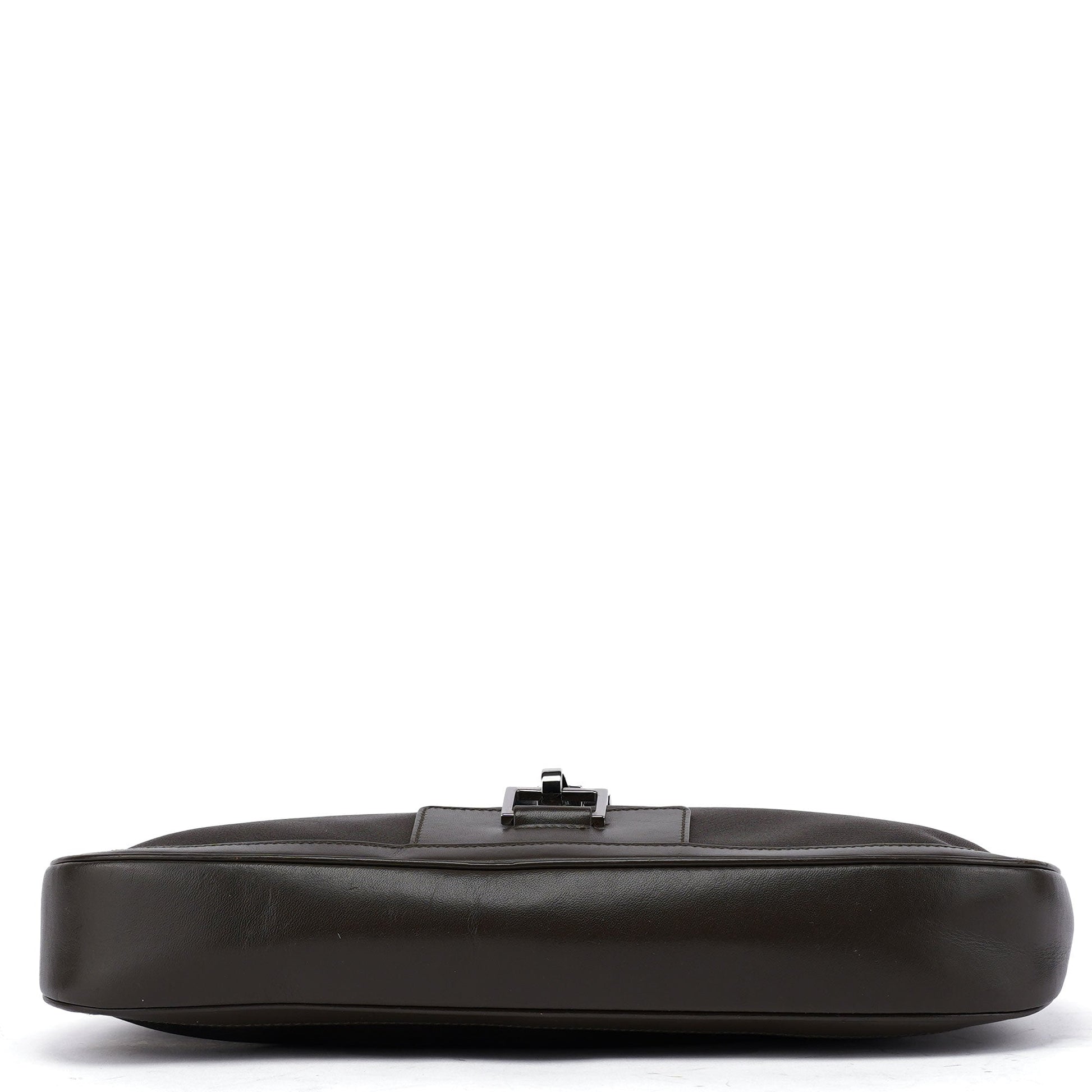 Designed by Tom Ford in the late 1990s, this Gucci Jackie shoulder bag combines olive green satin with tonal calfskin leather trim. Silver-tone hardware engraved with the Gucci logo highlights the design, featuring the iconic Jackie clasp alongside a practical zipper closure. The calfskin-lined interior includes a zipper pocket, blending timeless elegance with functional sophistication.