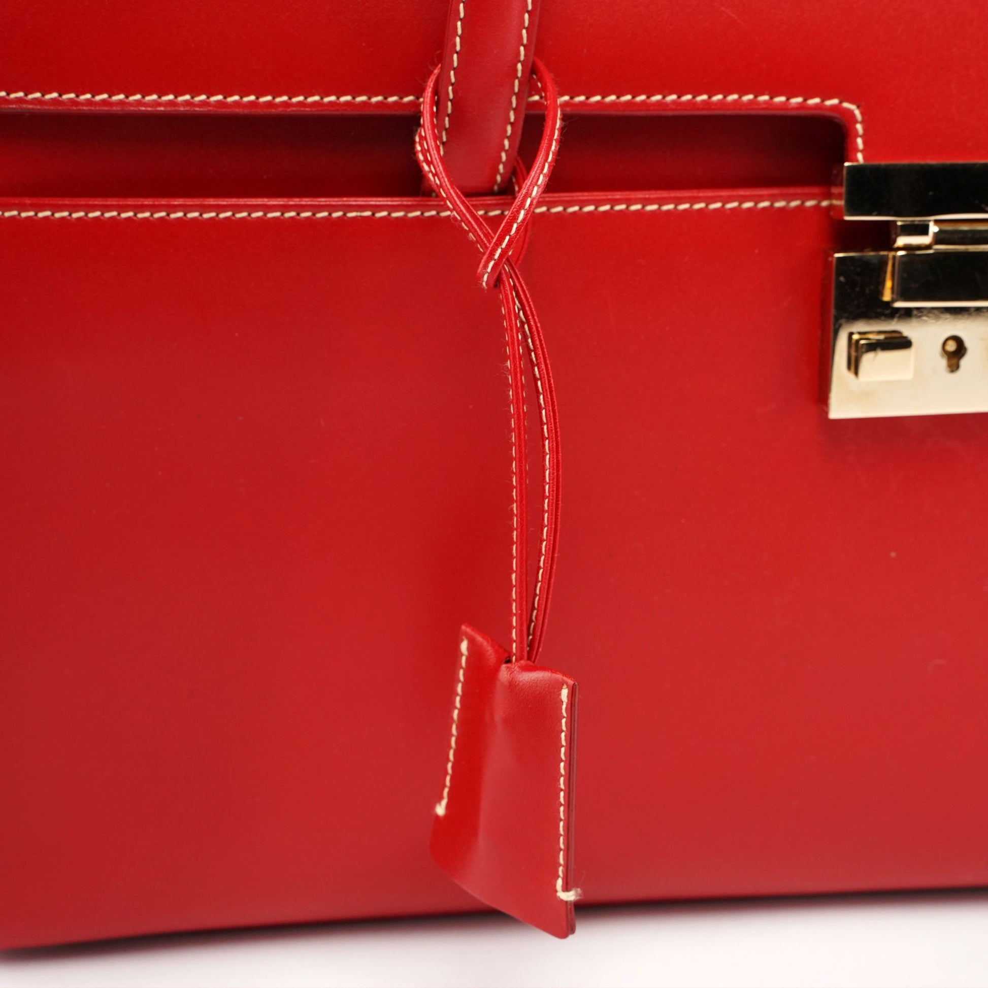 This early 2000s Gucci tote bag, designed by Tom Ford, is crafted in sumptuous red calfskin leather, complemented by elegant gold-tone hardware. It features a secure key lock closure with two keys, lock engraved with the Gucci logo, ensuring your belongings are safely stowed. The interior boasts multiple compartments for organization, while a Gucci logo plaque on the backside adds a touch of luxury. Two leather handles complete this exquisite design, making it a timeless piece for any collection.