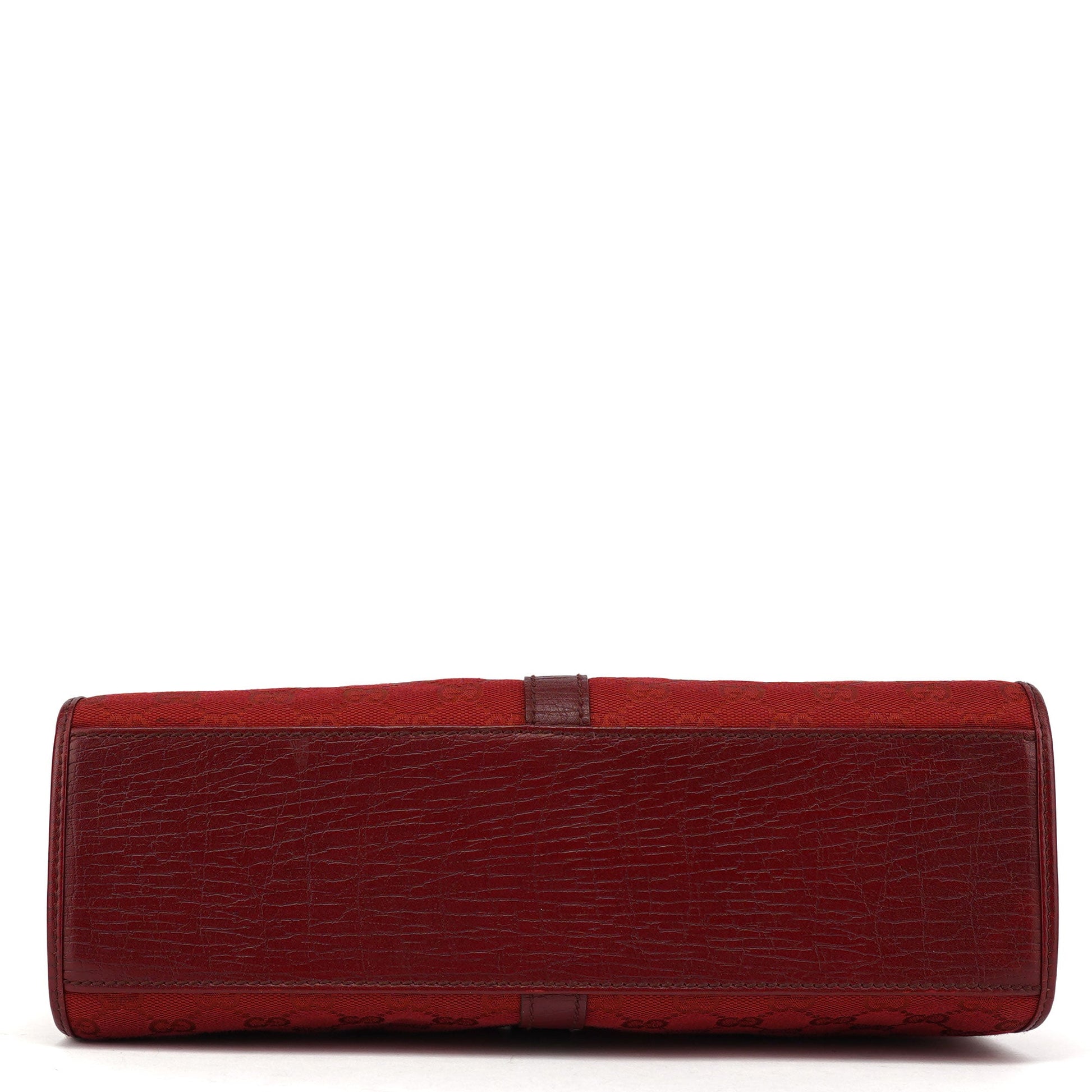 Designed by Tom Ford in the early 2000s, this iconic Gucci Jackie shoulder bag is handcrafted from red GG monogram canvas with tonal calfskin leather trim. It features silver-tone hardware engraved with the Gucci logo and the classic Jackie closure. The satin-lined interior includes a zipper pocket, adding to its refined design.