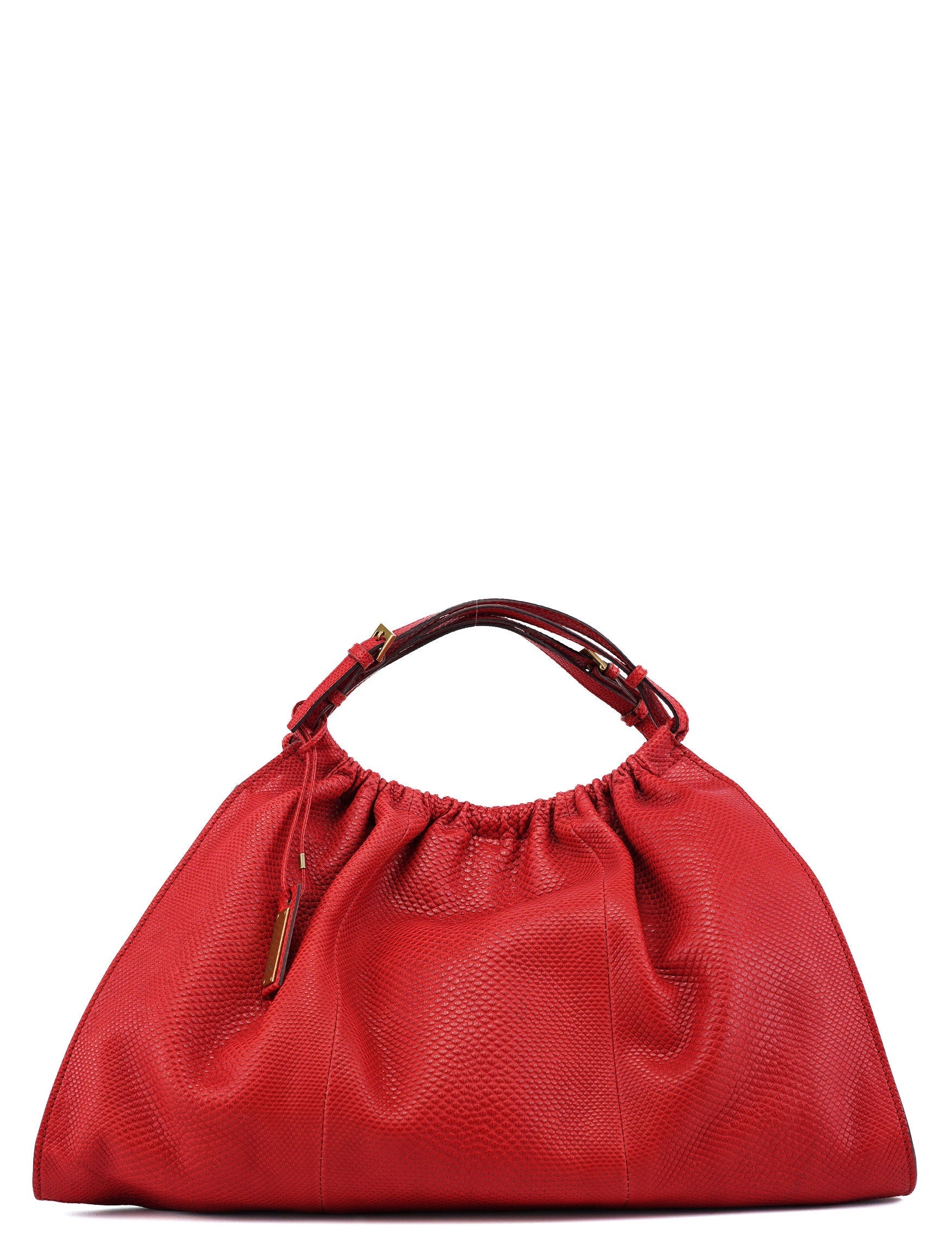 Designed by Tom Ford in the late 1990s, the Gucci dual handle bag is crafted in striking red lizard-embossed leather with gold-tone hardware. A magnetic closure secures the satin-lined interior, which includes a zipper pocket for added functionality. Finished with a Gucci logo tag, this piece elegantly combines signature style with timeless sophistication.