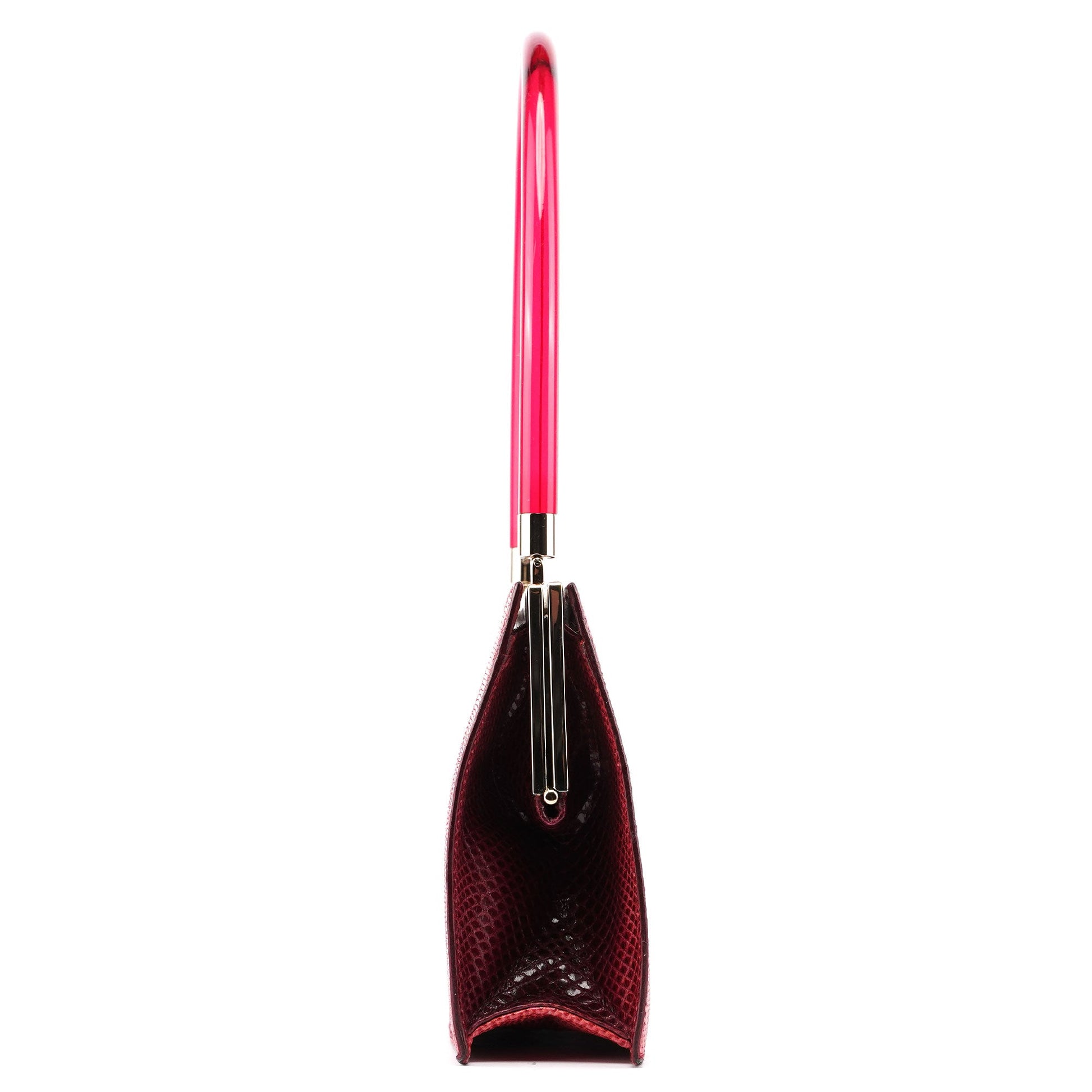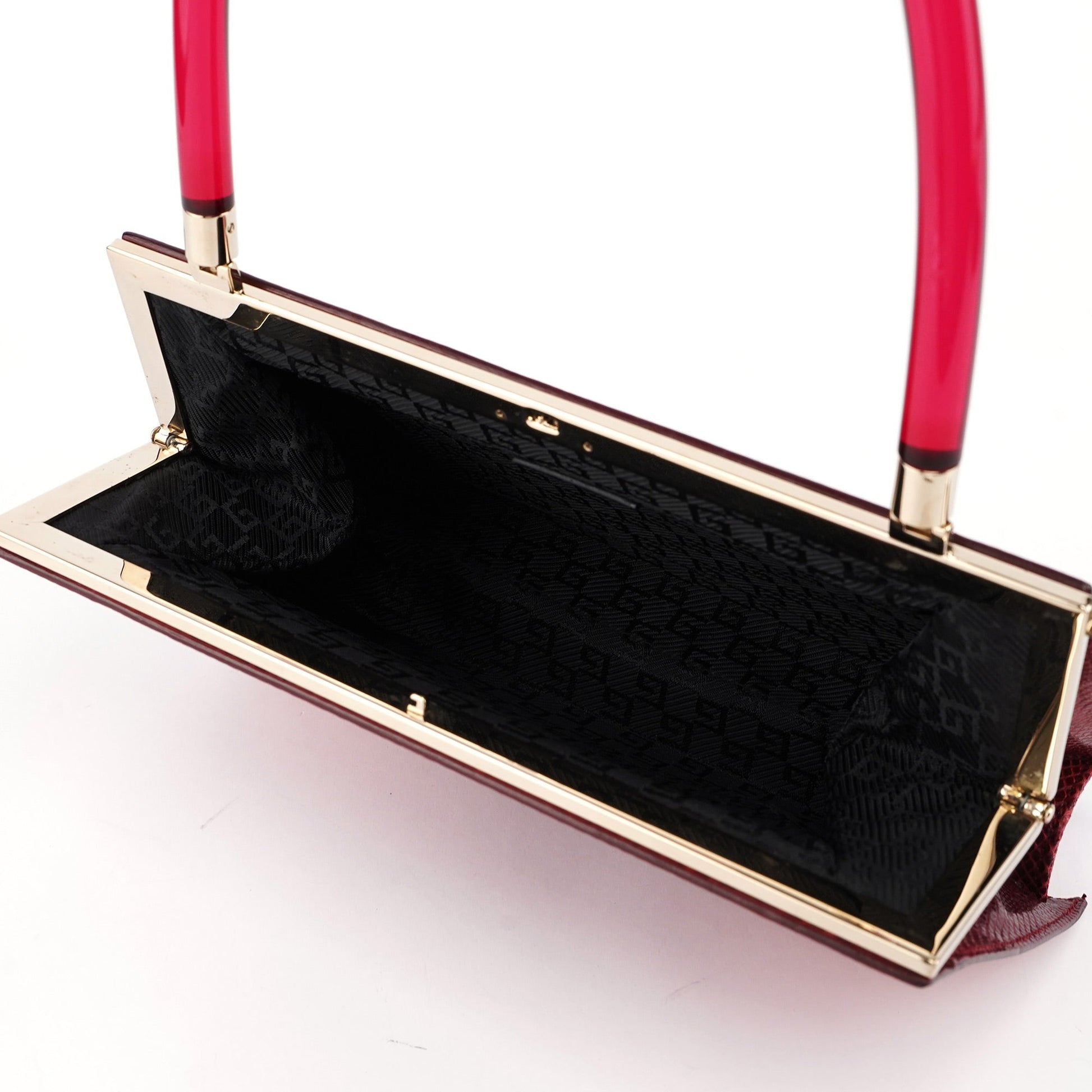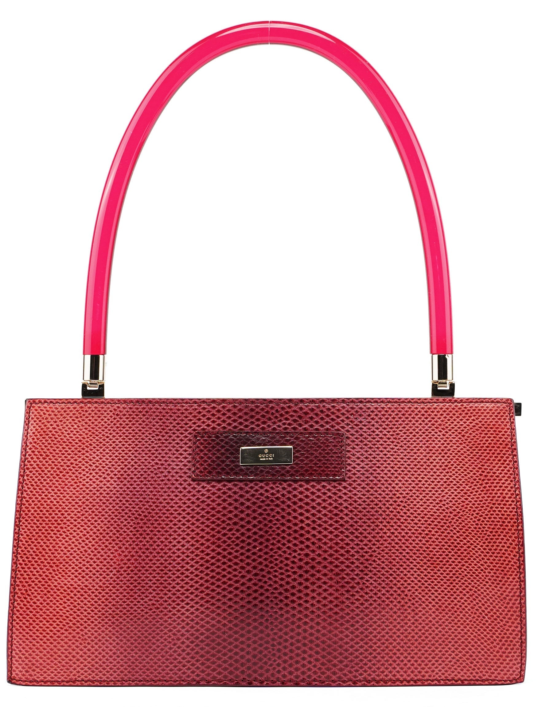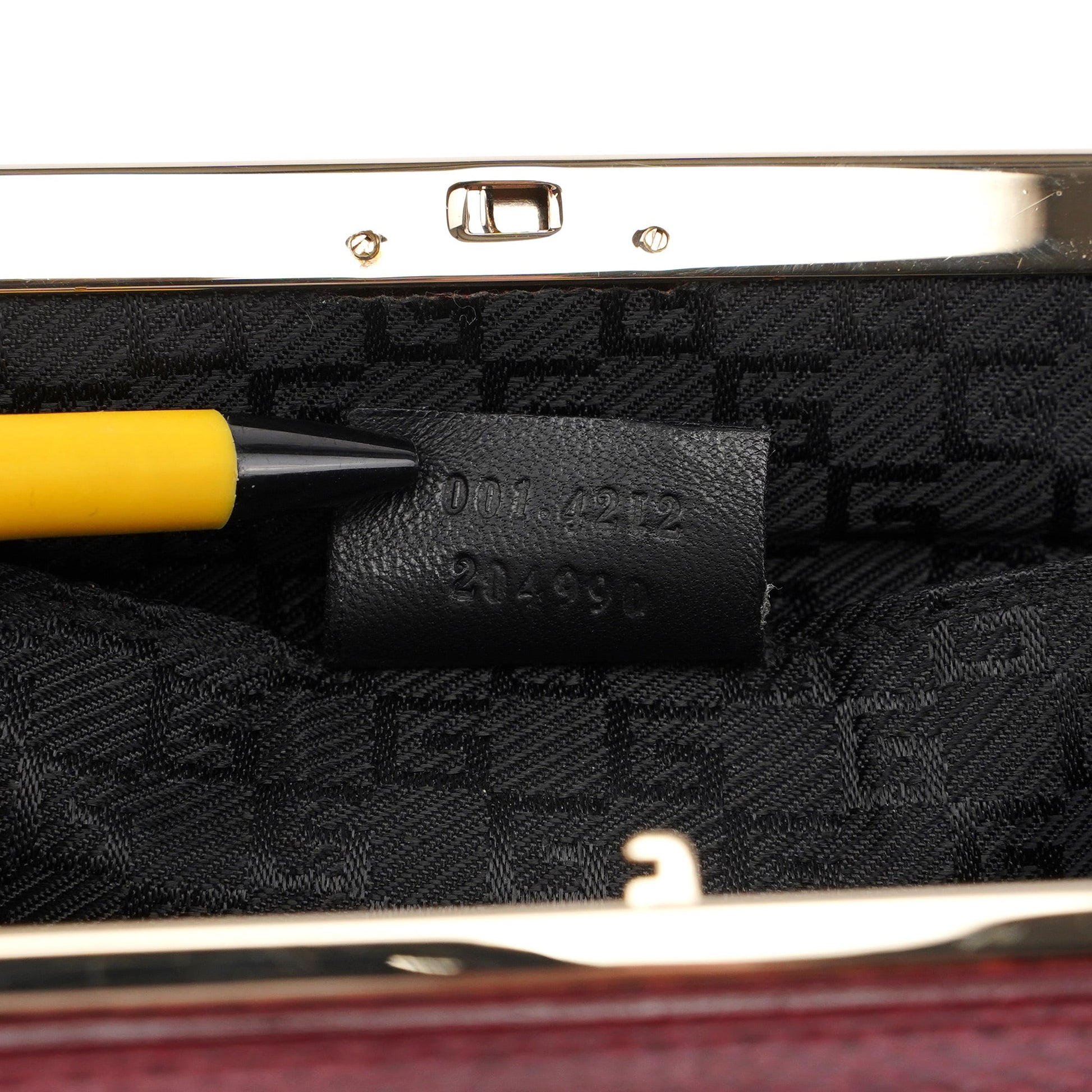 Handcrafted from Karung snakeskin leather, this incredibly rare Gucci handbag by Tom Ford from the late 1990s features gold-tone hardware, a translucent red handle, and a clutch closure. The interior is lined in satin with a Gucci logo plate at the front, showcasing timeless elegance.