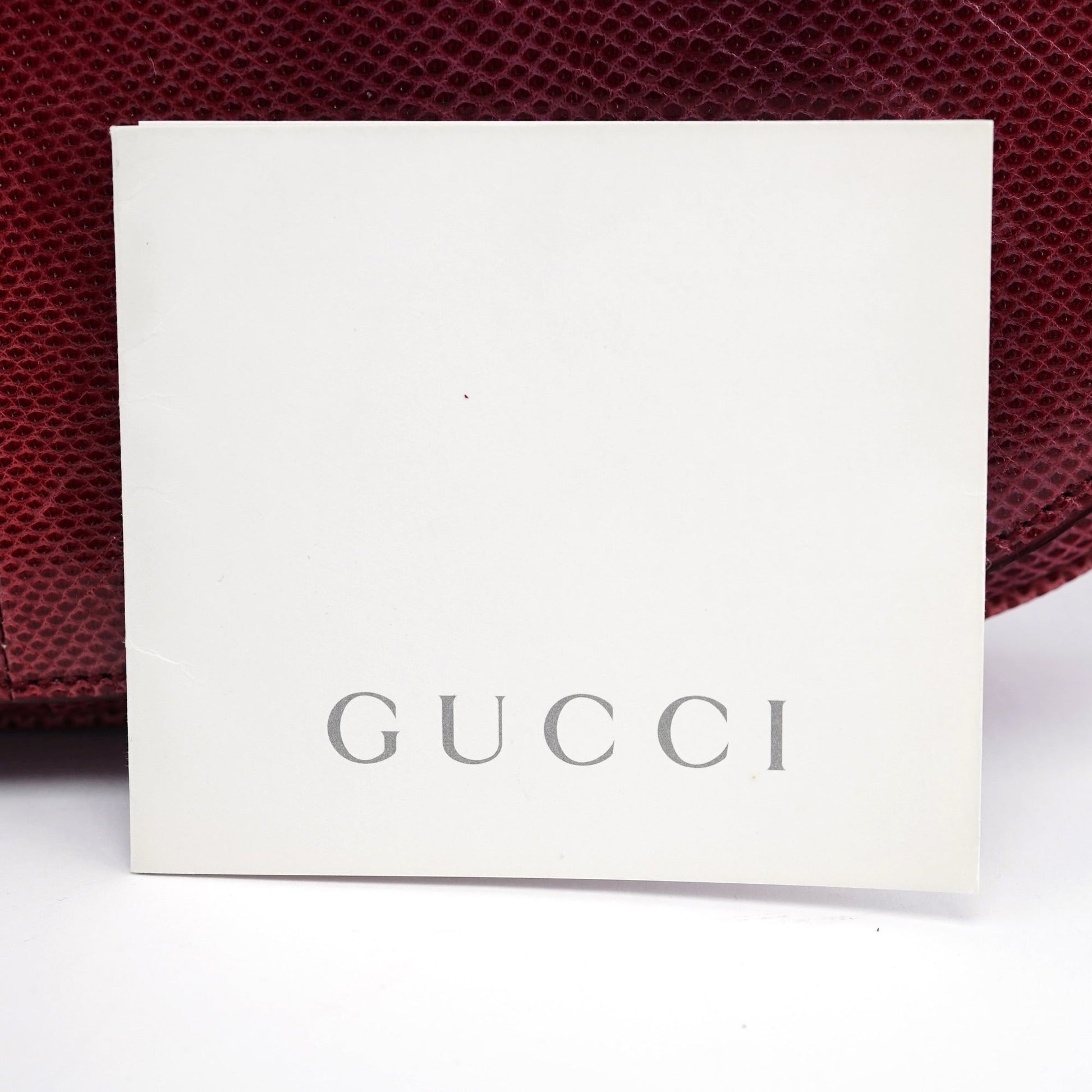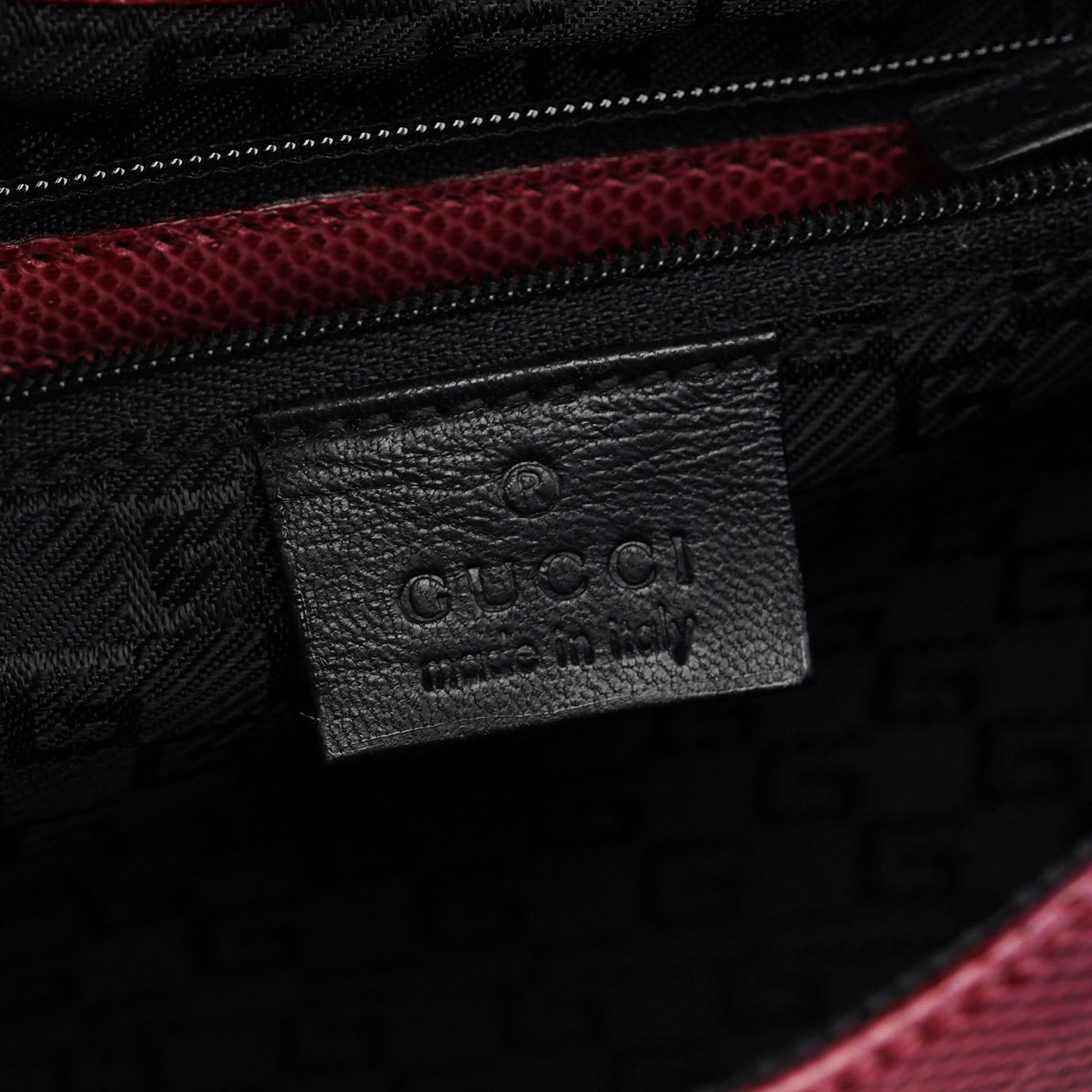Designed by Tom Ford in the late 1990s, this Gucci shoulder bag is handcrafted from red lizardskin leather, featuring a sleek gloss black plastic handle and gold-tone hardware. The satin-lined interior includes a pocket for organization, while a Gucci logo plate at the front adds a refined touch to this modern yet timeless design.