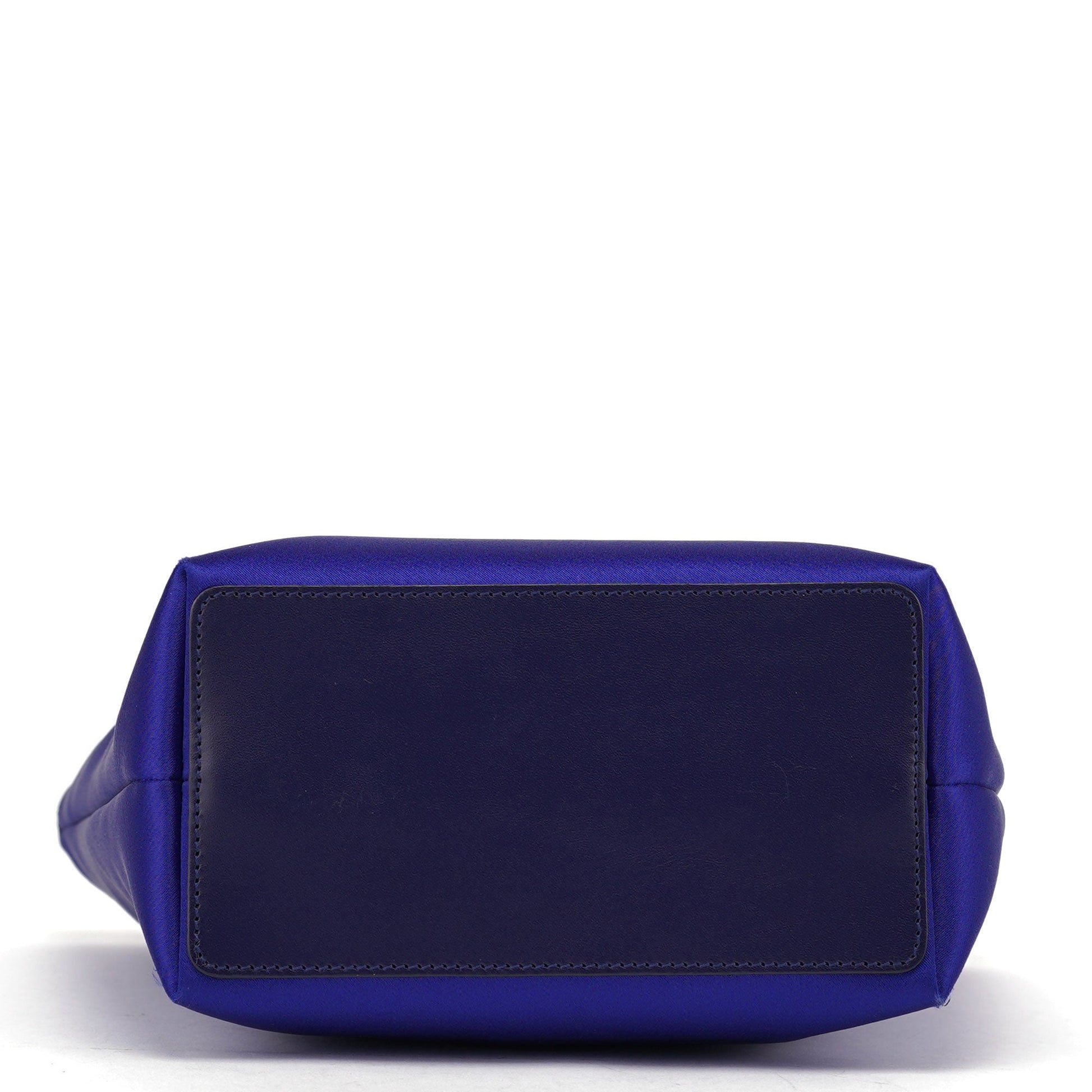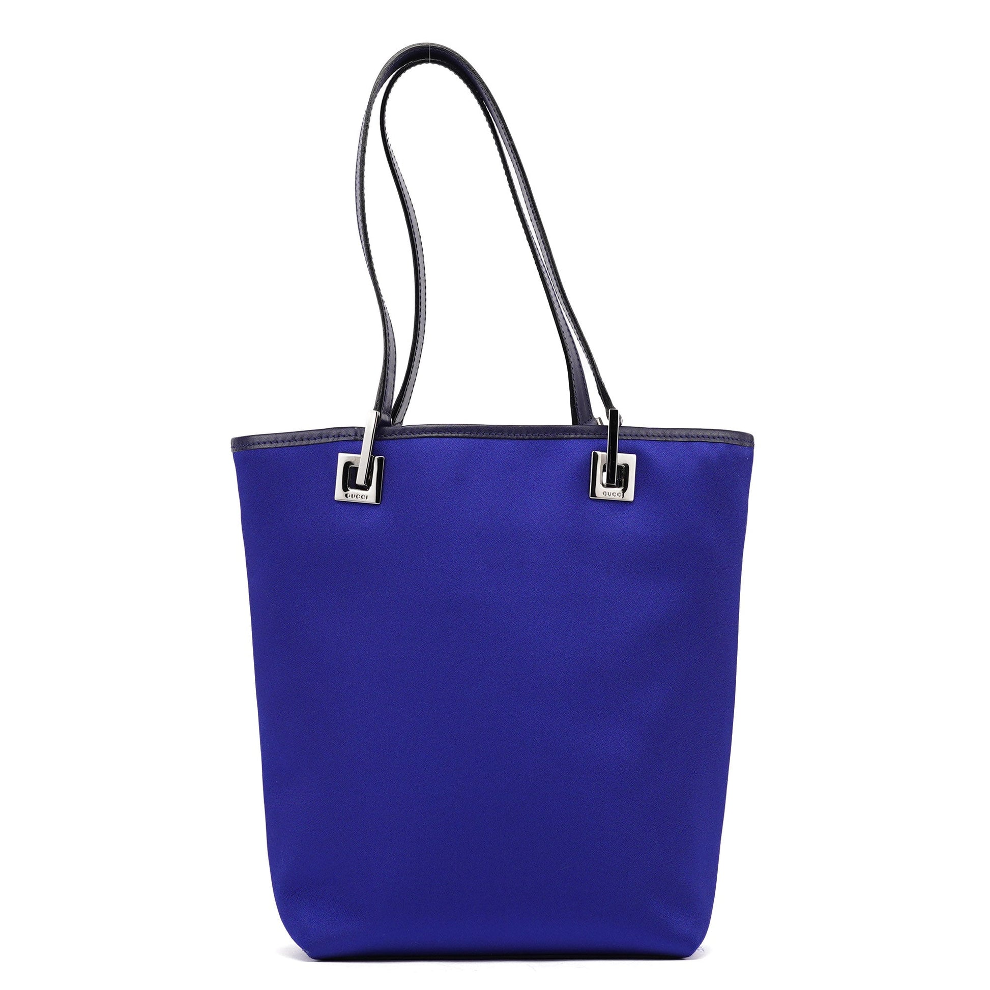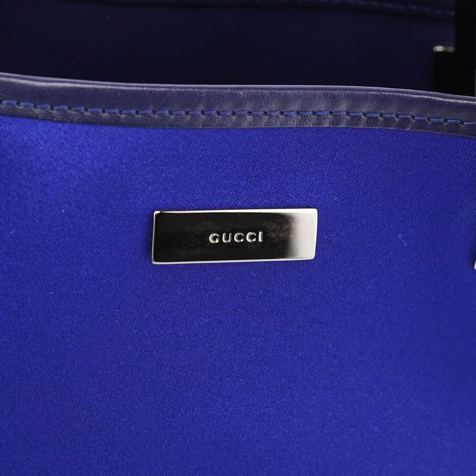 Designed by Tom Ford in the early 2000s, this Gucci tote bag is handcrafted from royal blue satin with dark blue calfskin leather trim. It features silver-tone hardware engraved with the Gucci logo, a satin-lined interior with a pocket, and a Gucci logo plate at the front for a refined finish.