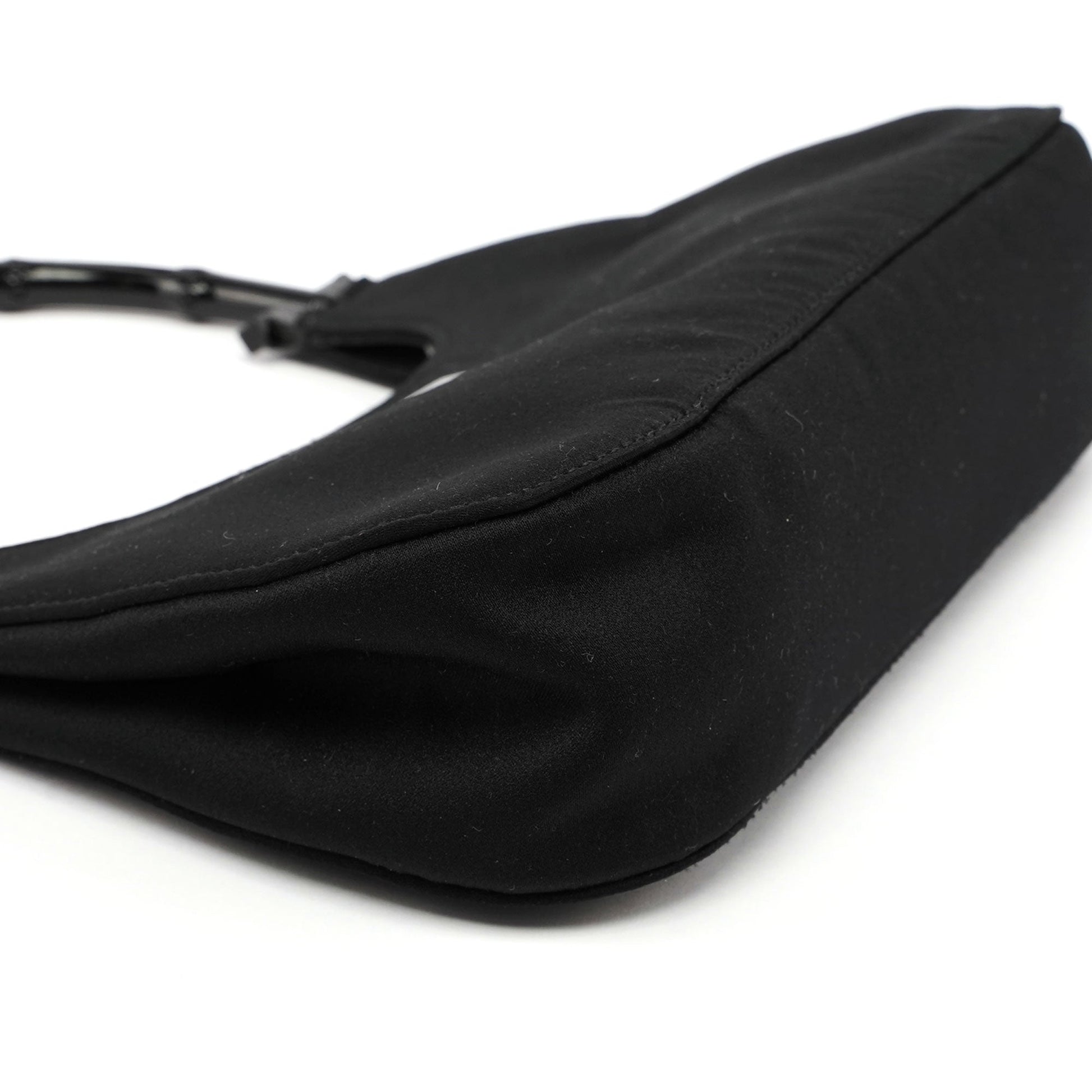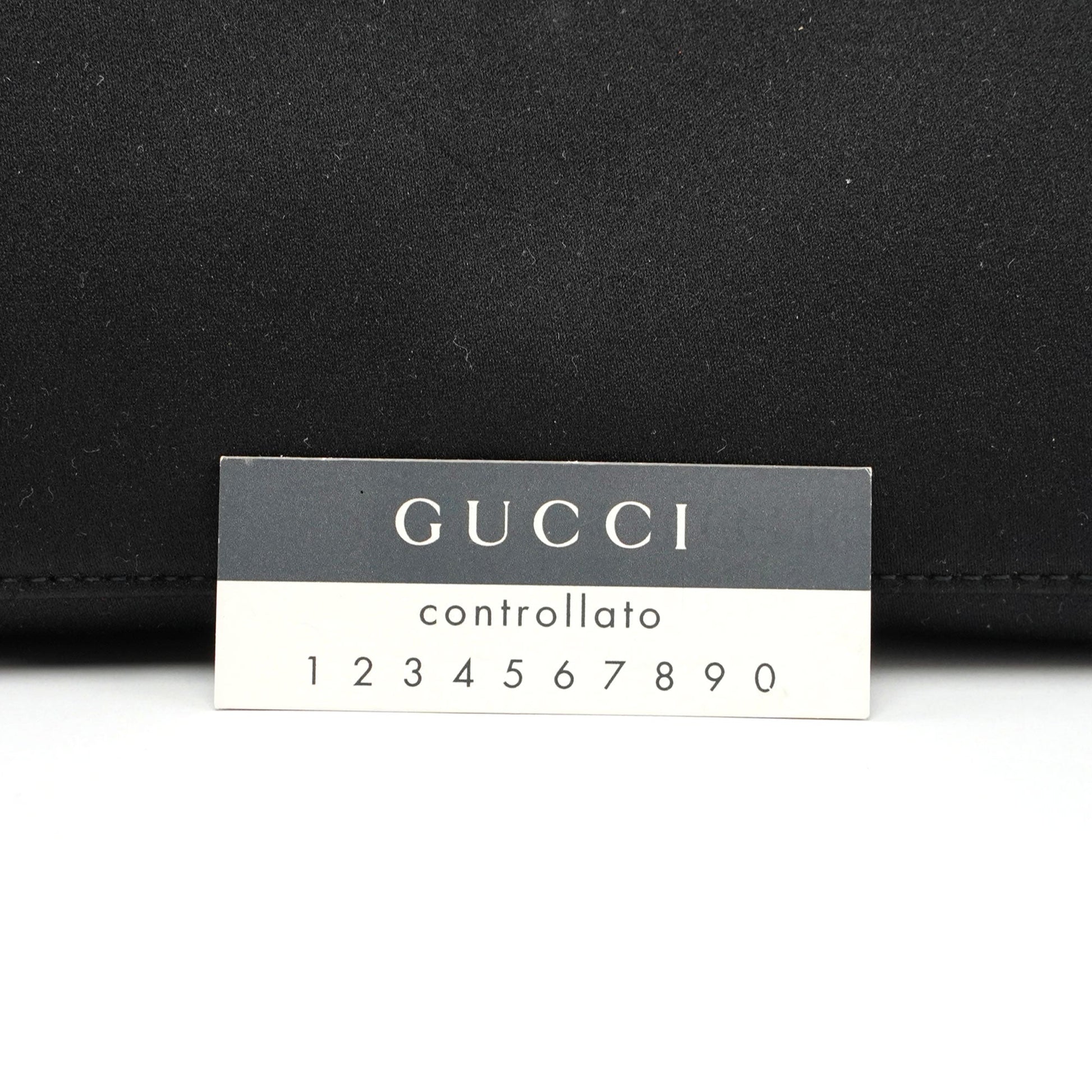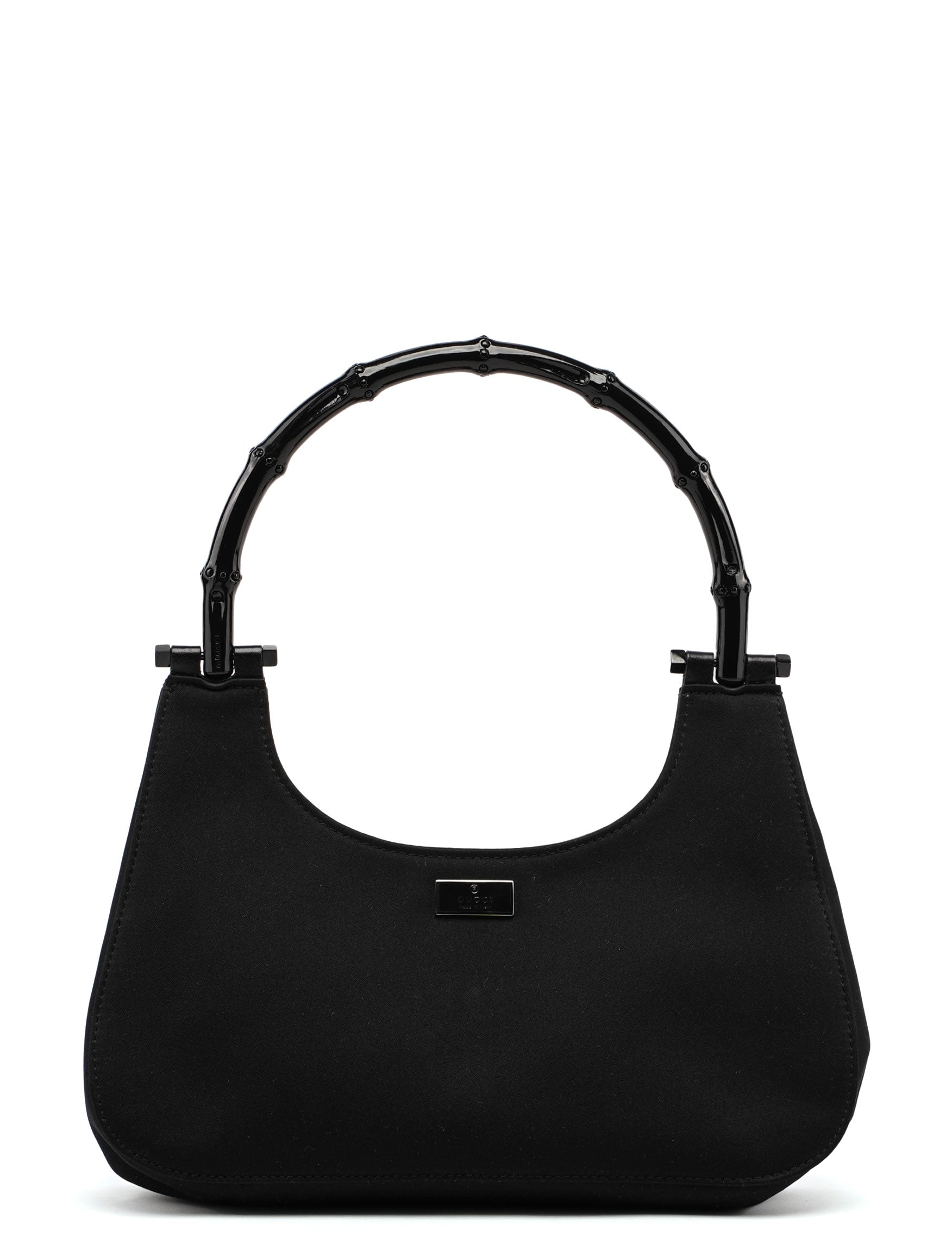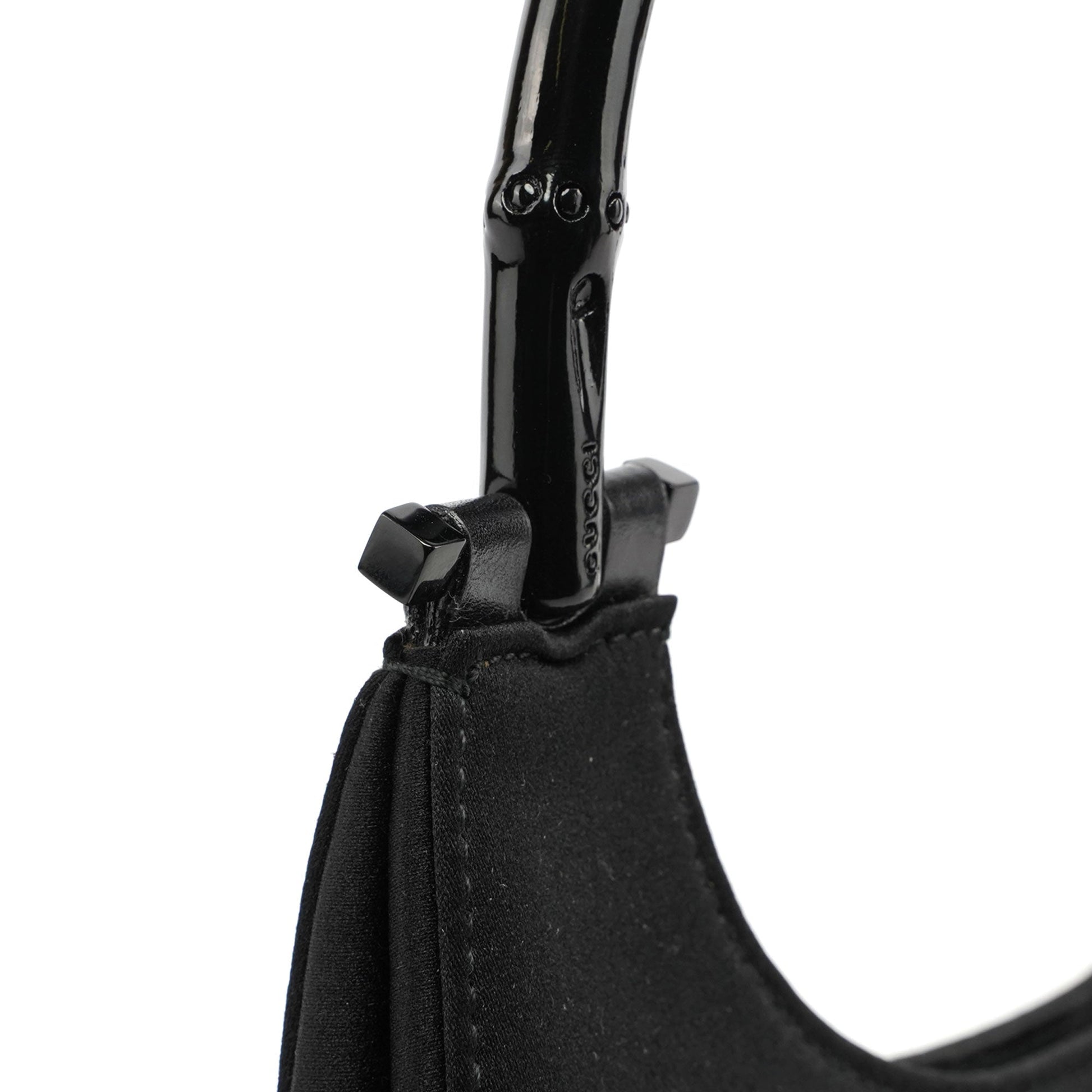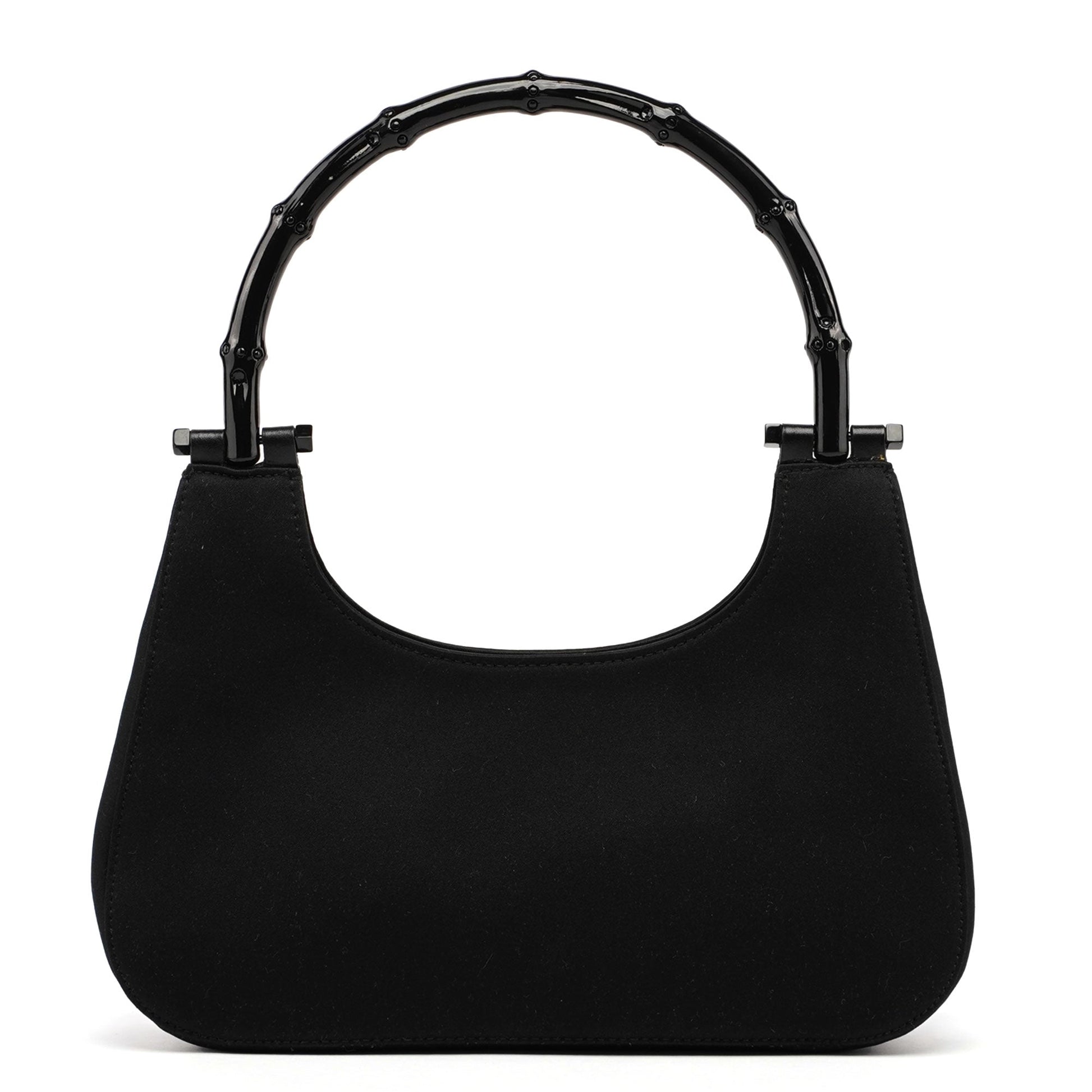 Crafted under Tom Ford's visionary design, this Gucci Bamboo bag showcases a satin body paired with a glossy black bamboo handle, elegantly engraved with the Gucci logo. The bag secures with a magnetic closure and is designed in a compact, easy-to-carry size. Its sophistication is further accentuated by a Gucci logo plaque on the front, making it a timeless piece for any collection.