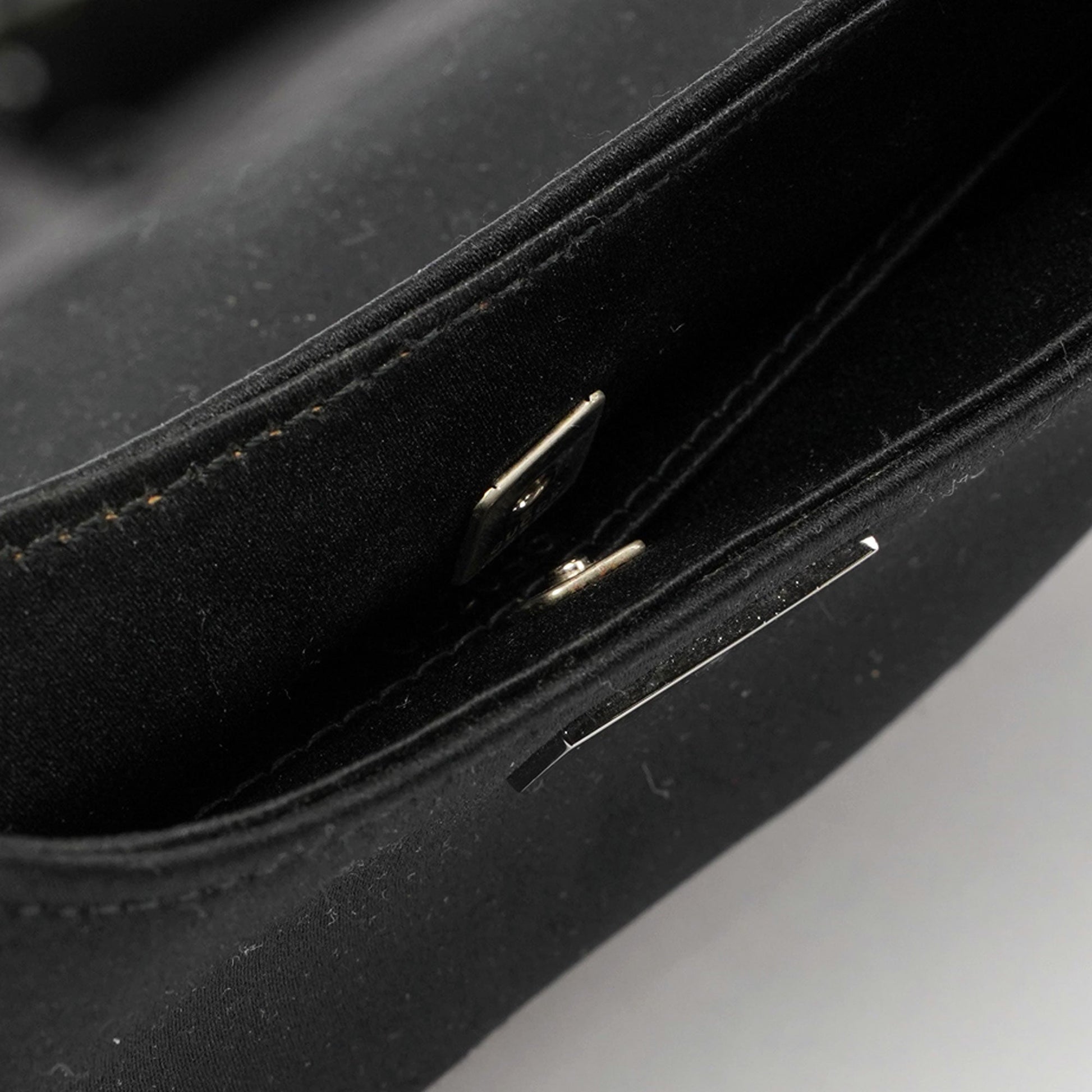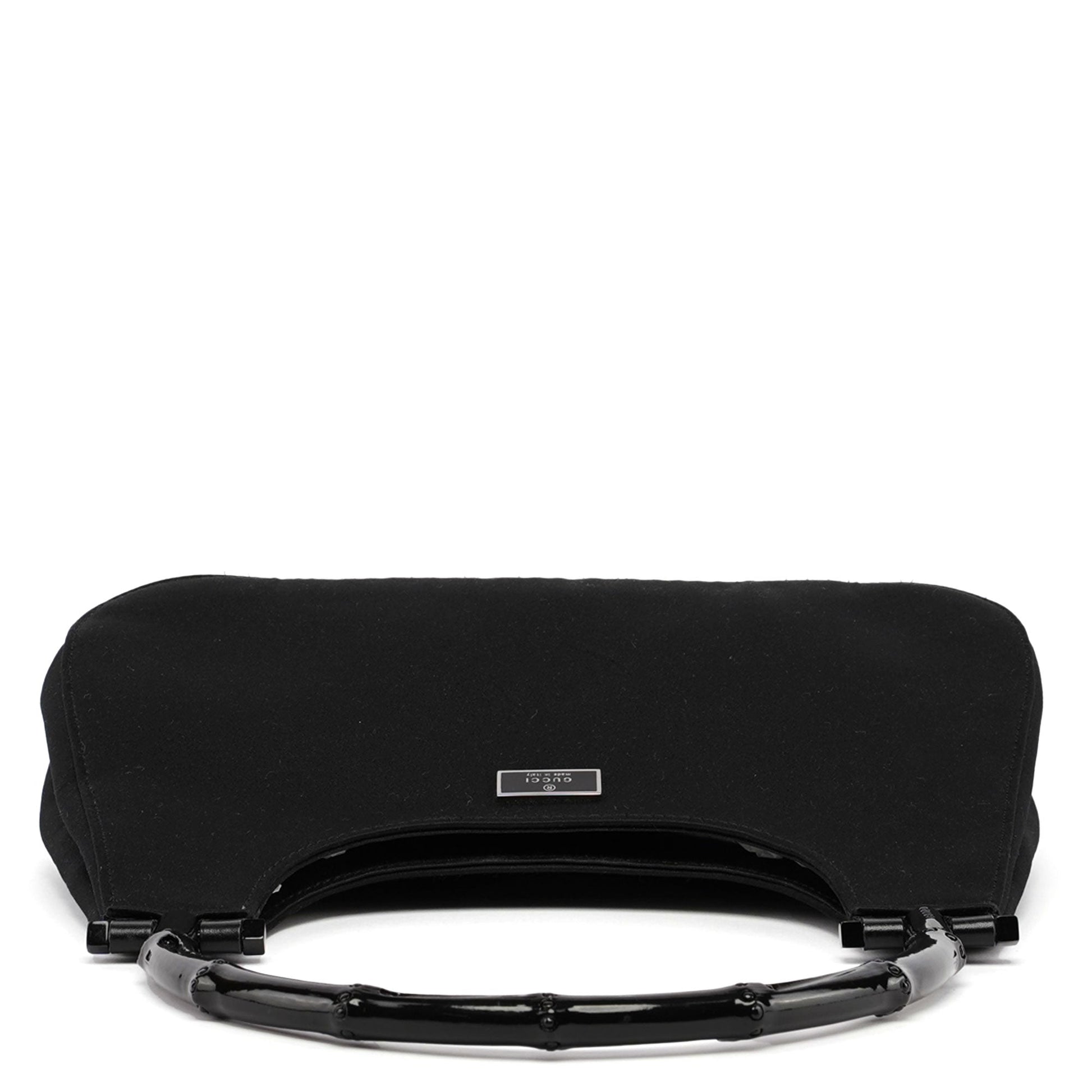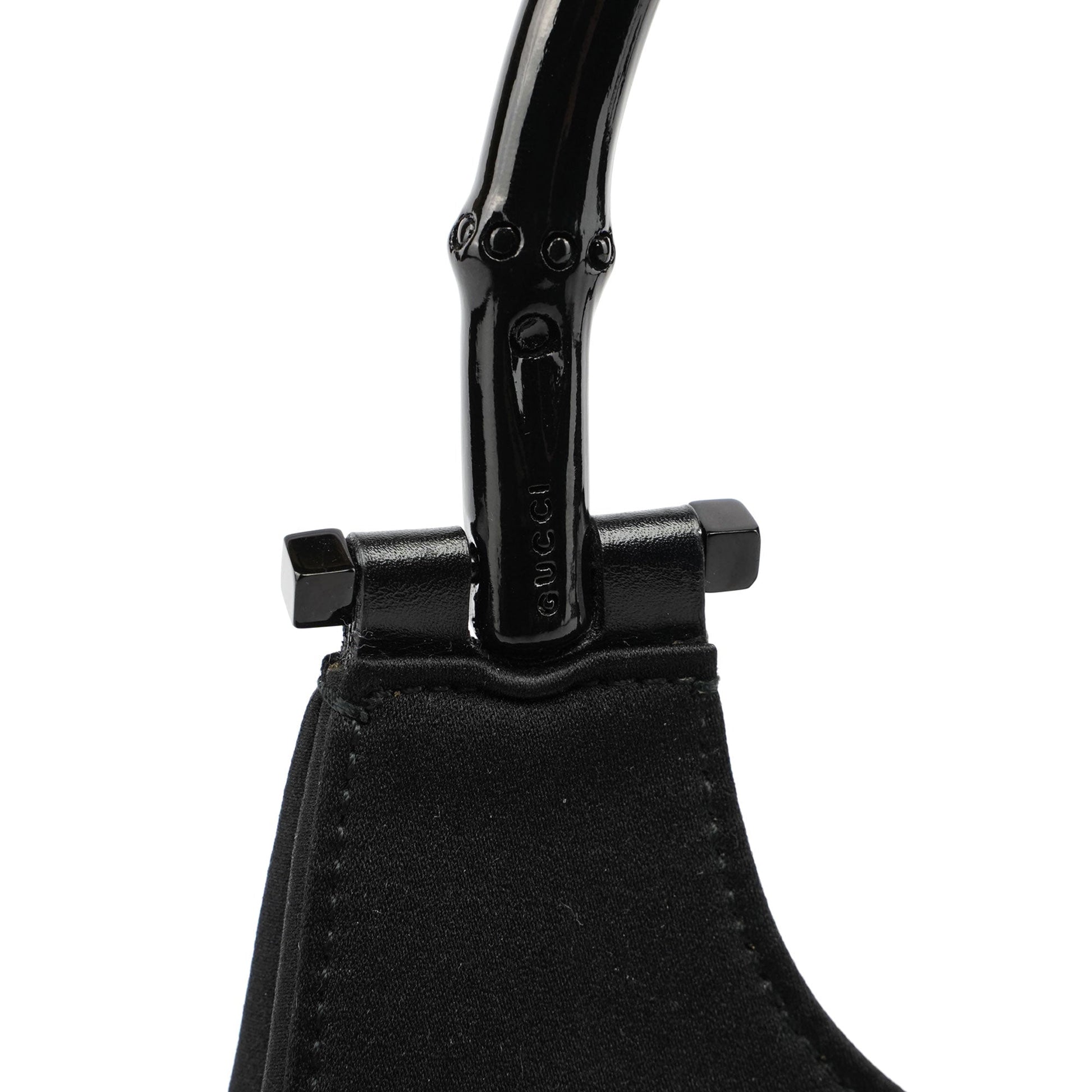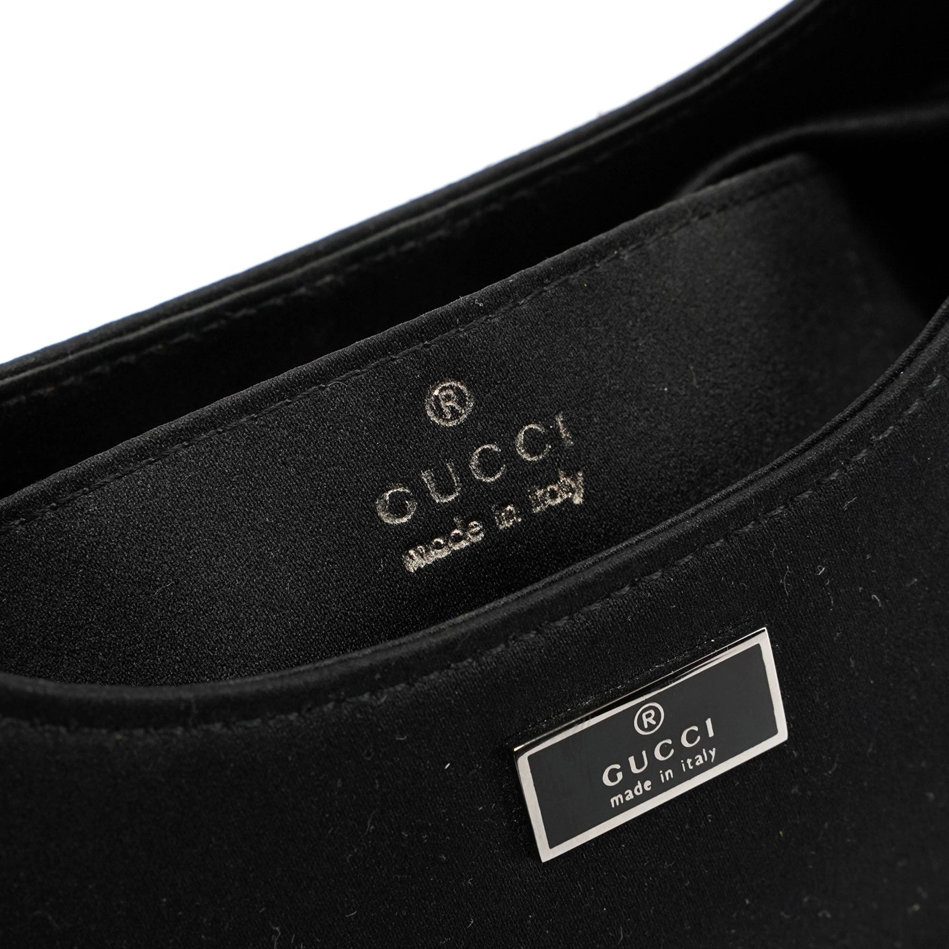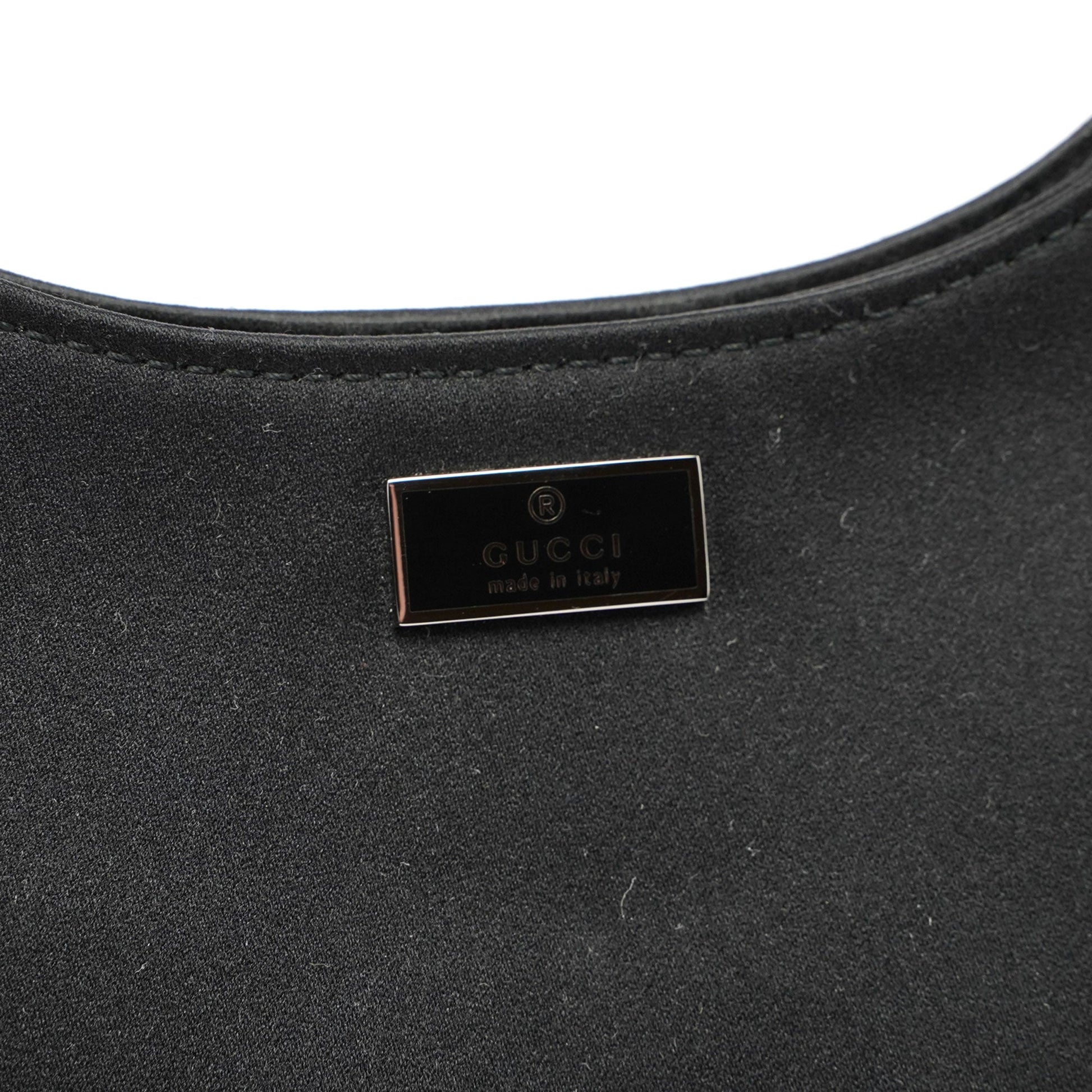Crafted under Tom Ford's visionary design, this Gucci Bamboo bag showcases a satin body paired with a glossy black bamboo handle, elegantly engraved with the Gucci logo. The bag secures with a magnetic closure and is designed in a compact, easy-to-carry size. Its sophistication is further accentuated by a Gucci logo plaque on the front, making it a timeless piece for any collection.