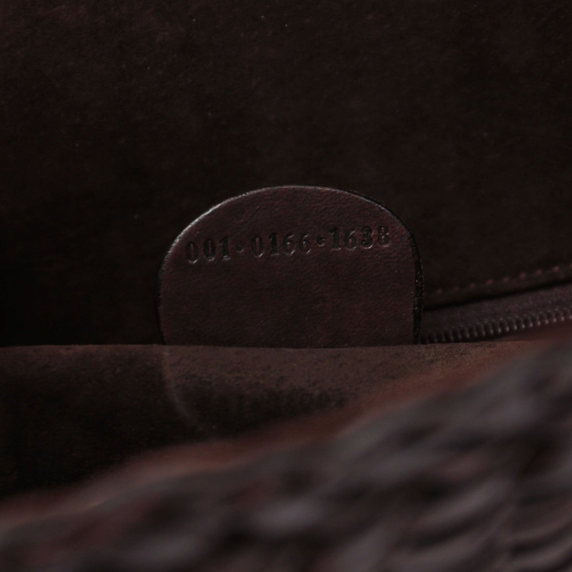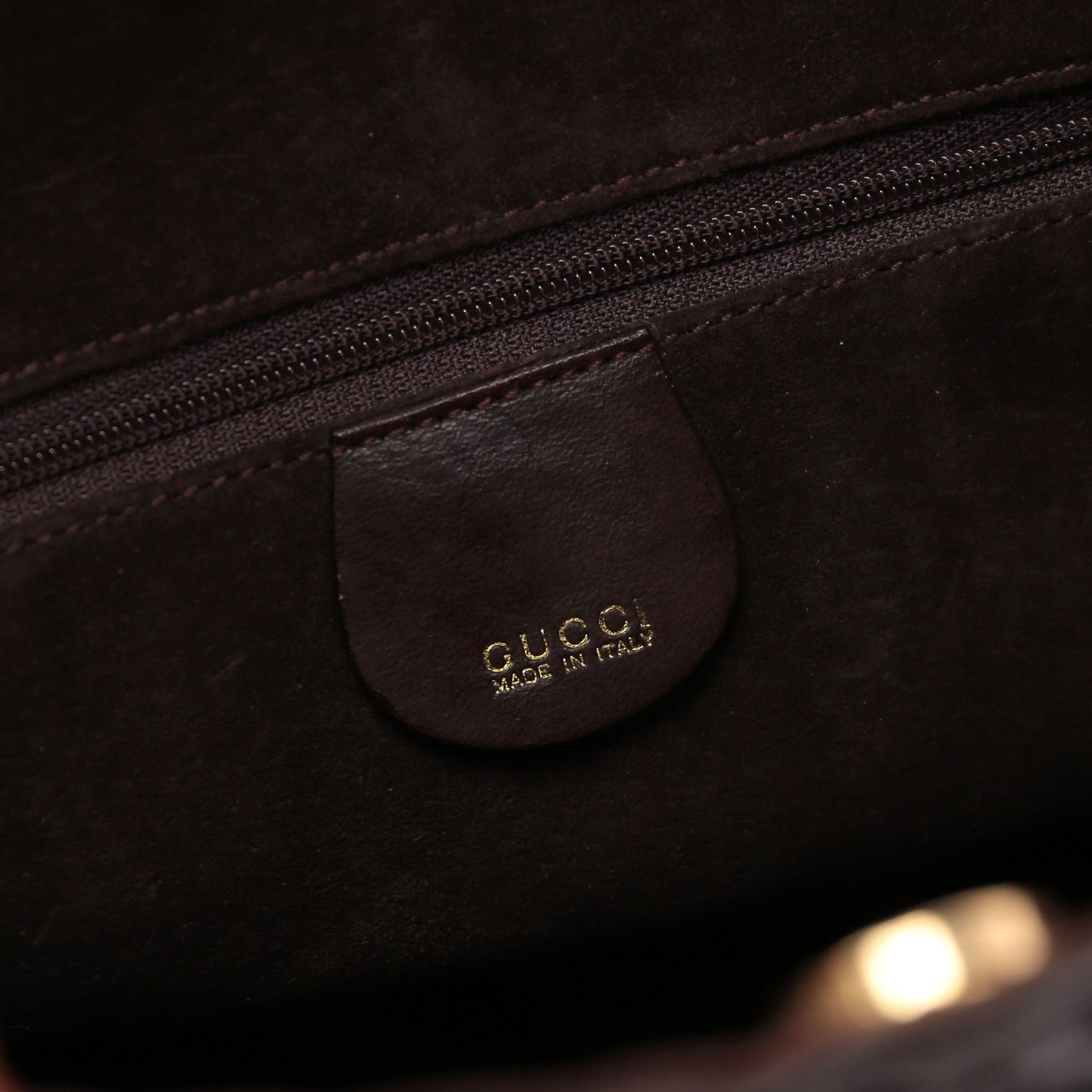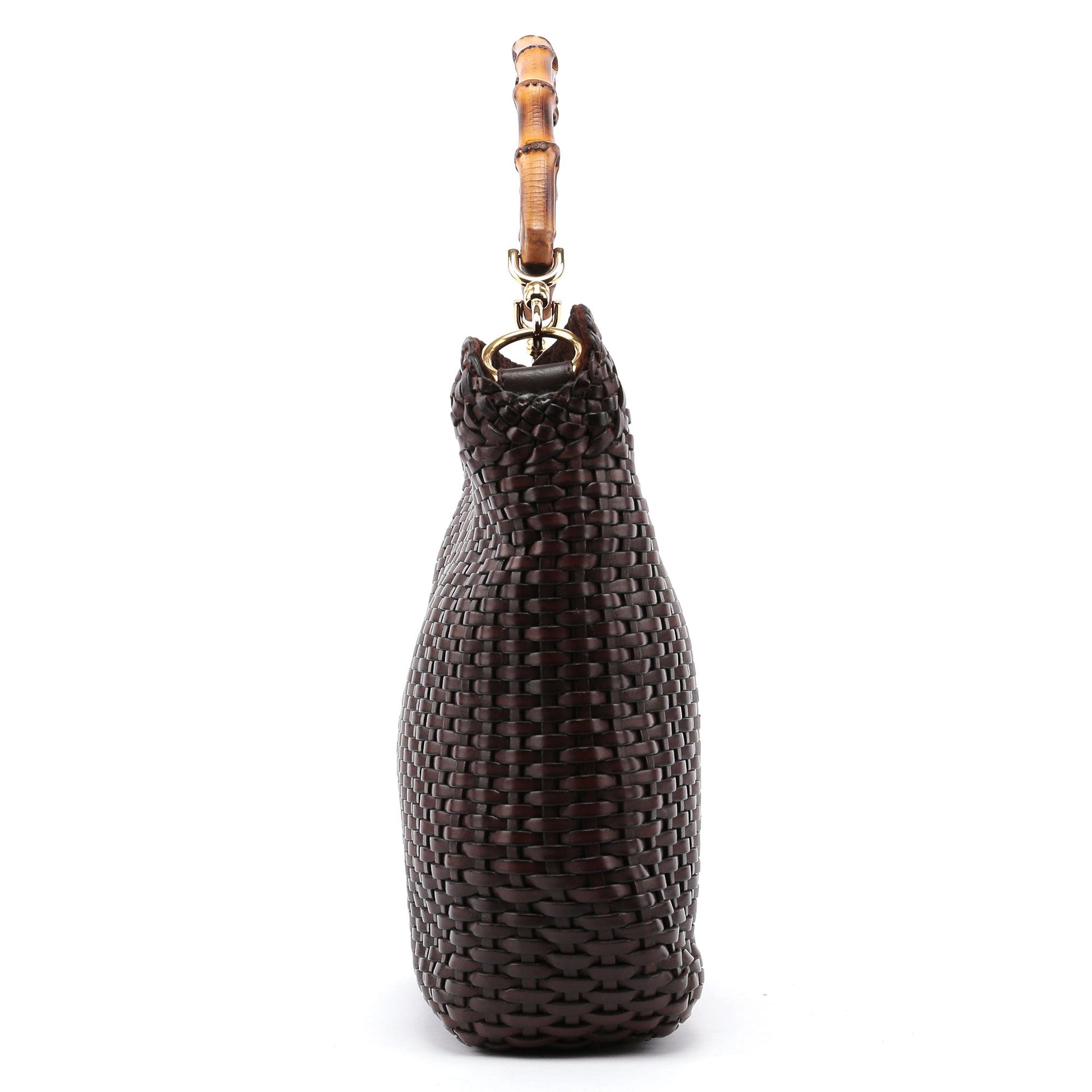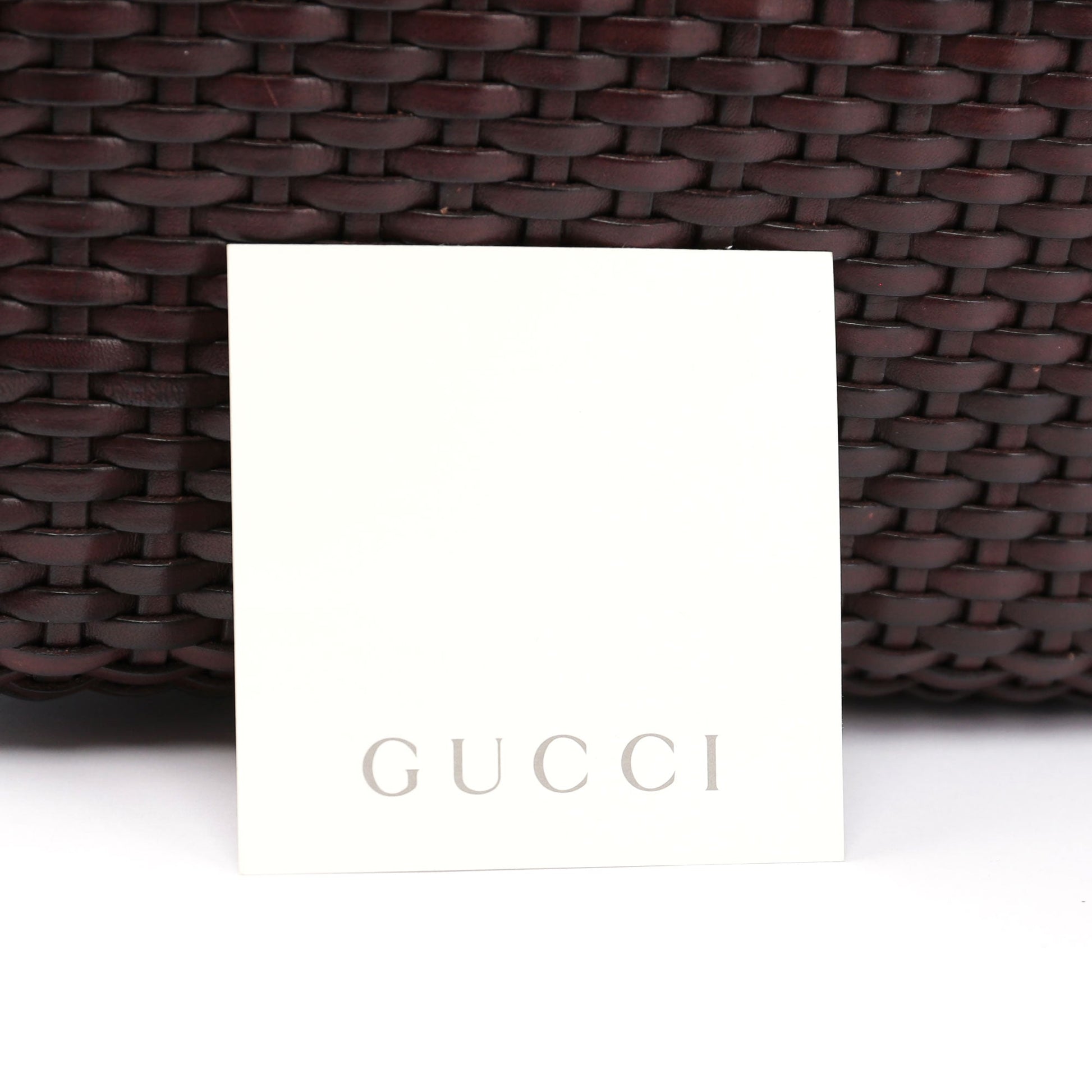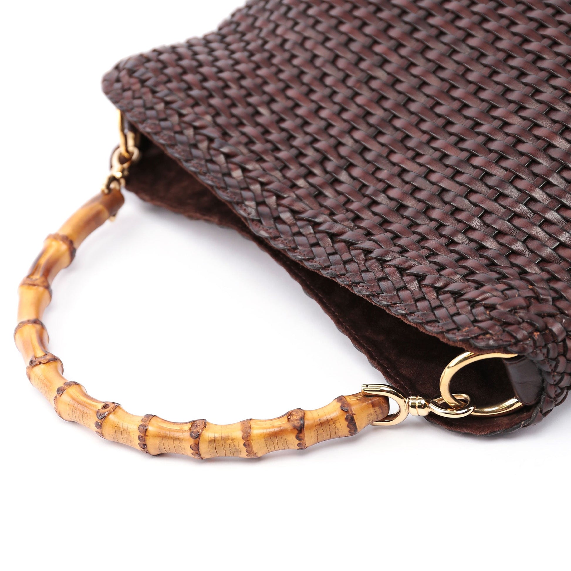 Designed by Tom Ford for Gucci's 1996 collection, this Bamboo 2-Way bag is a testament to artisanal craftsmanship, handwoven in rich brown leather. It features a bamboo handle and luxurious gold-tone hardware, complemented by a magnetic closure for secure storage. A detachable leather handle offers versatile styling options. The interior, elegantly lined with suede, includes an interior zipper pocket, blending functionality with Gucci's iconic elegance.