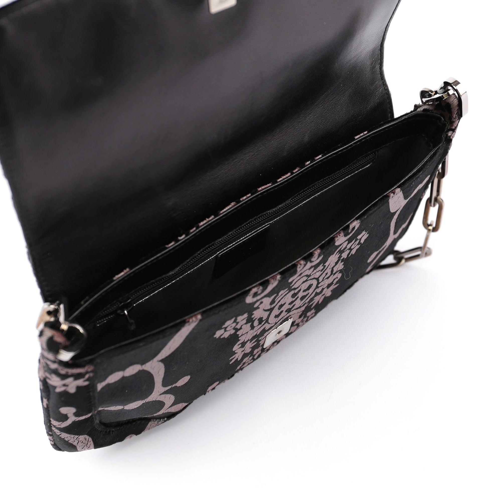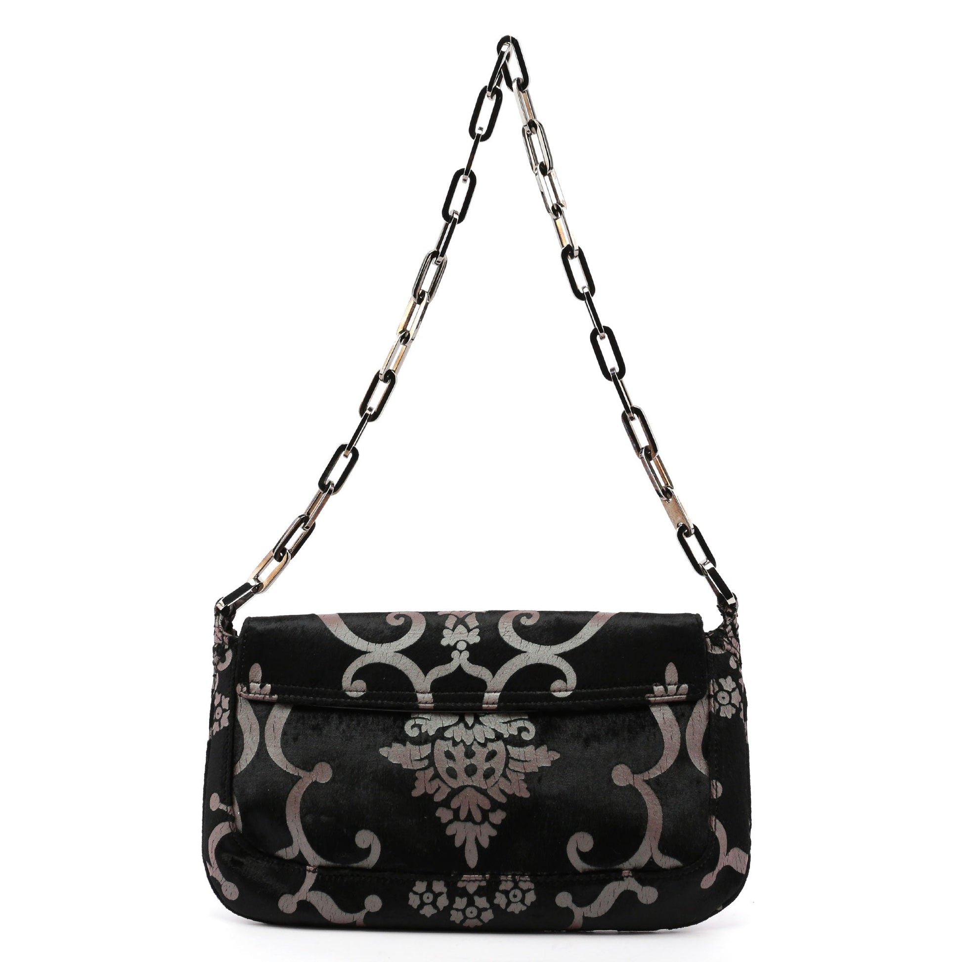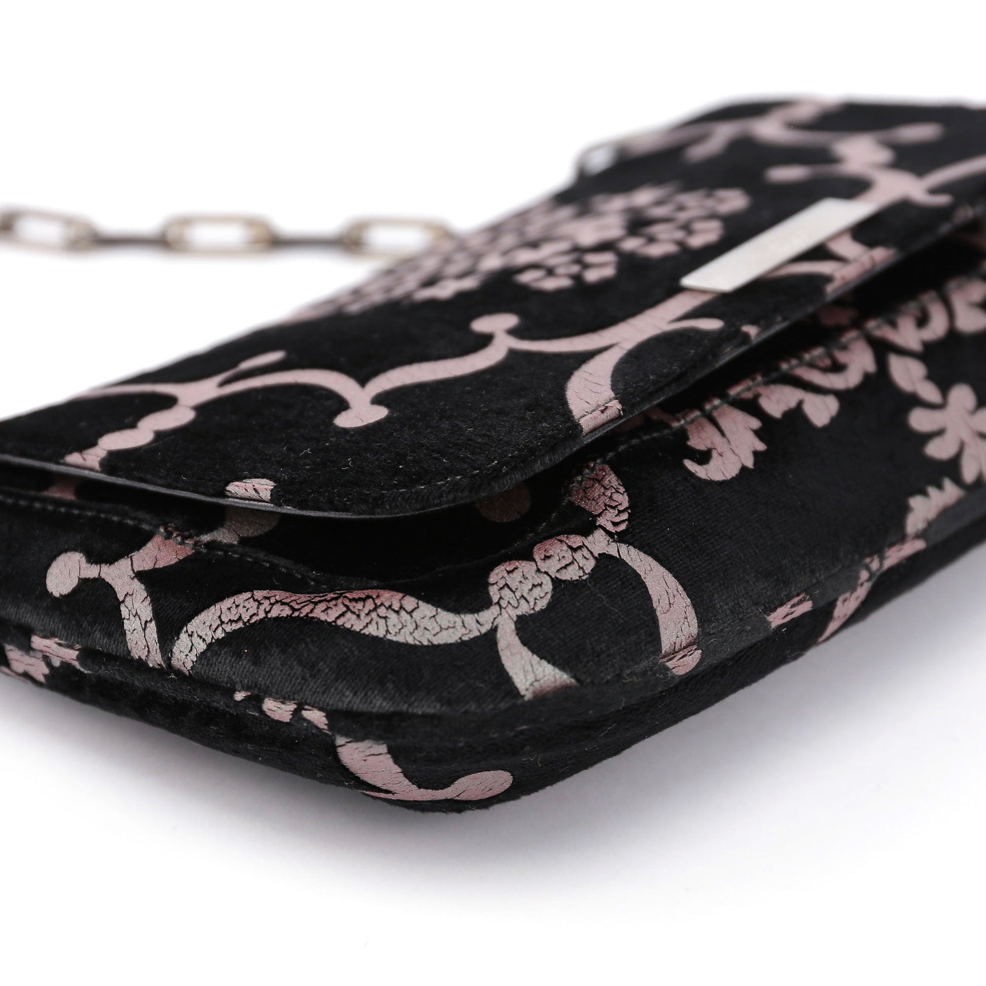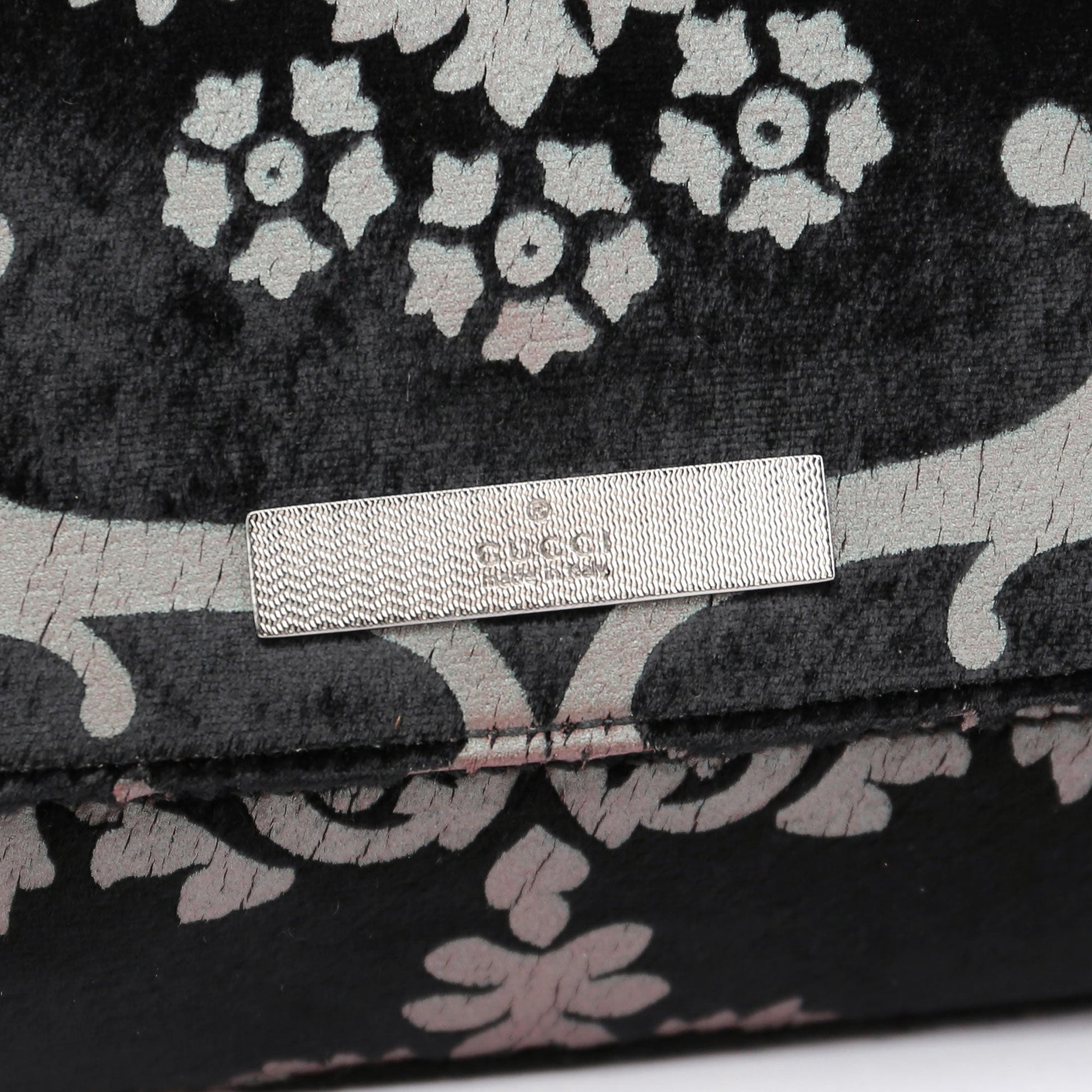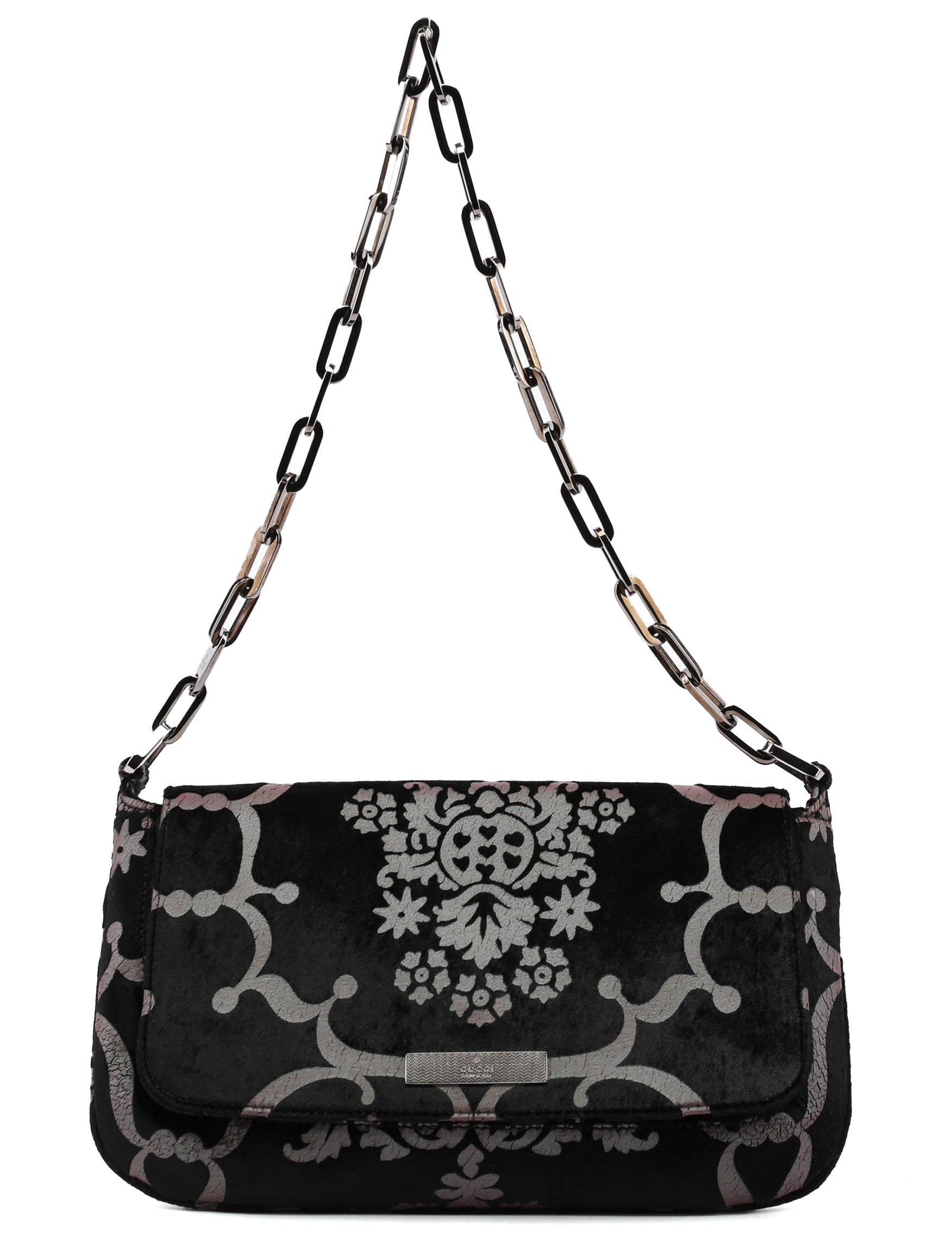 Designed by Tom Ford for the 1997 collection, this Gucci Baroque Chain bag features black velvet adorned with white baroque illustrations, silver-tone hardware with logo engraving, and a metallic chain strap. The interior, lined in satin and including a zipper pocket. The bag is finished with a Gucci logo plate at the front, combining luxurious design with functionality.