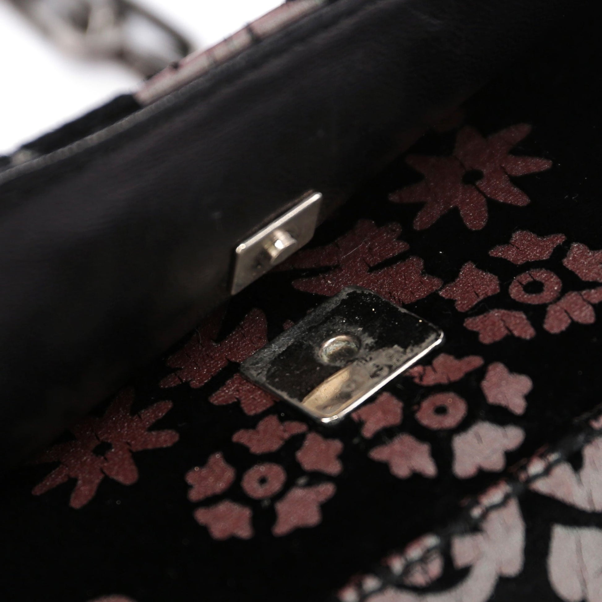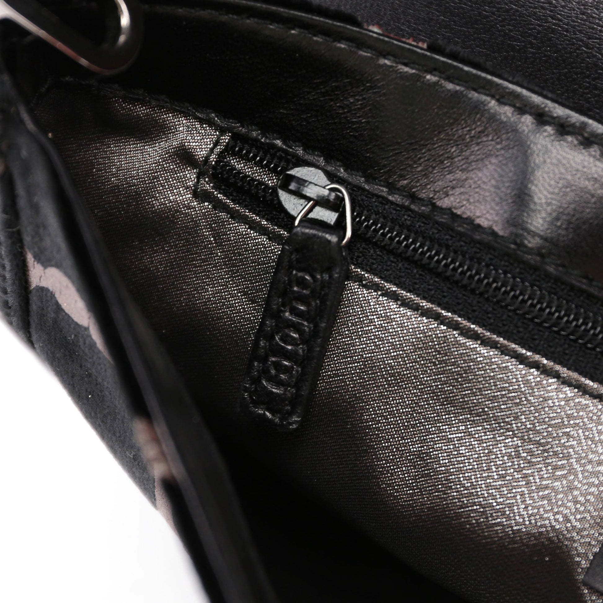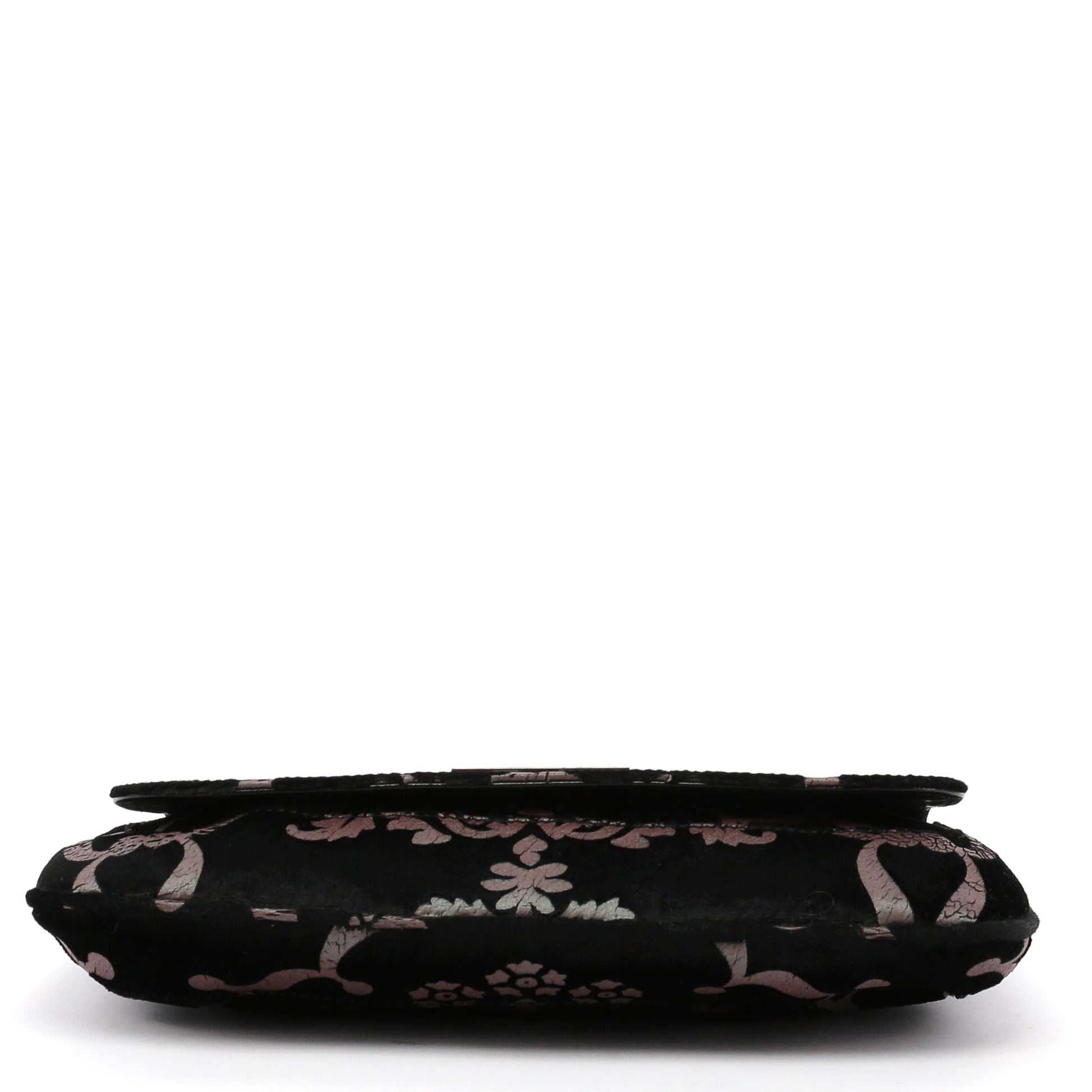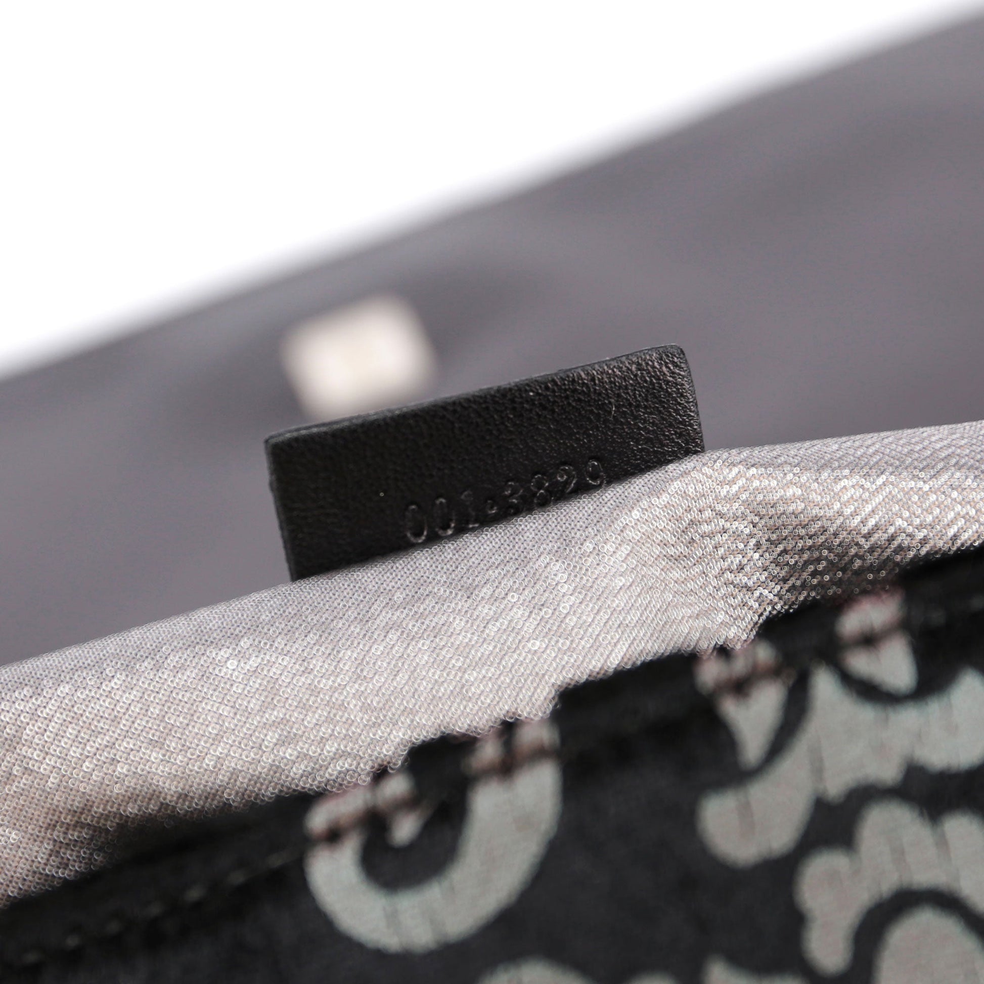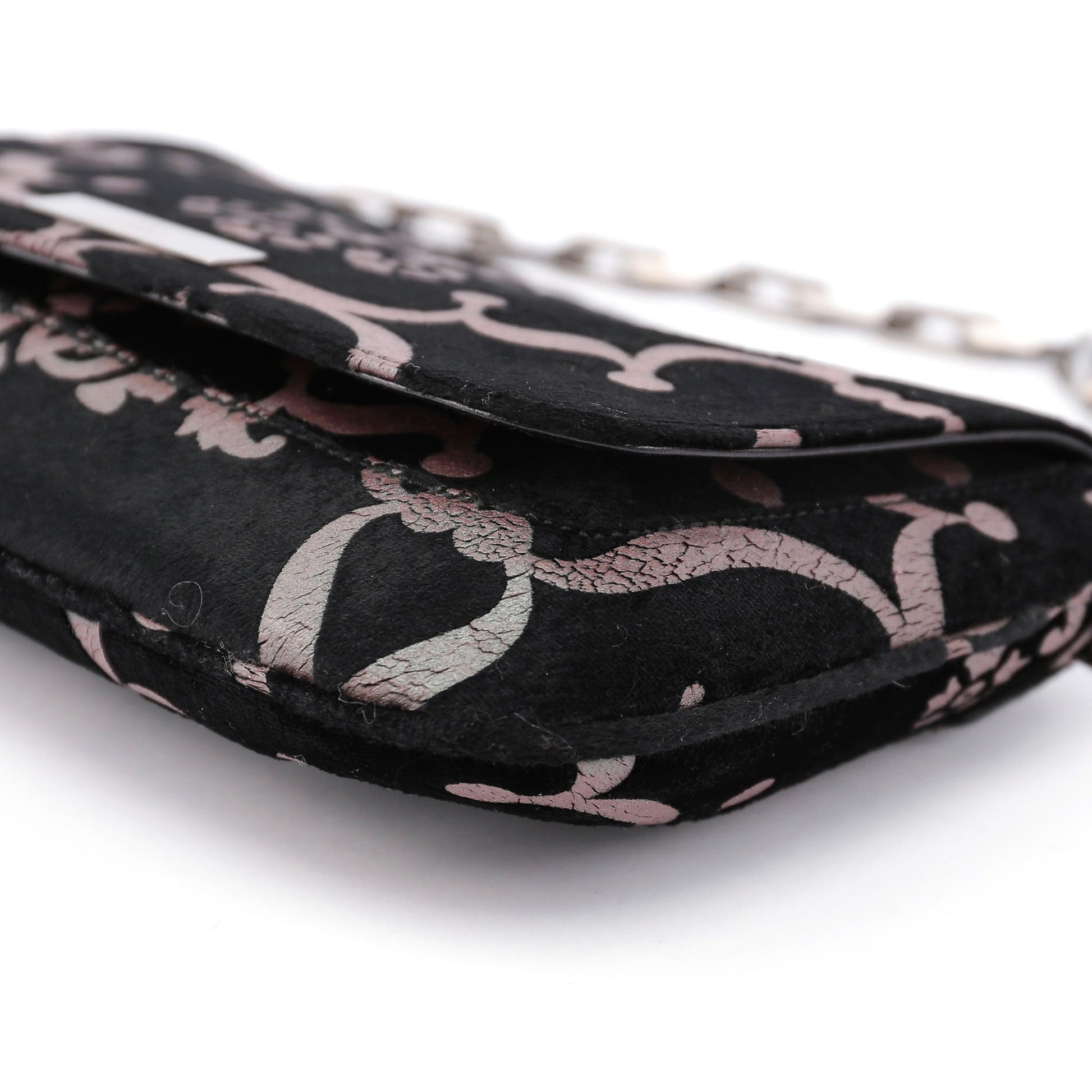 Designed by Tom Ford for the 1997 collection, this Gucci Baroque Chain bag features black velvet adorned with white baroque illustrations, silver-tone hardware with logo engraving, and a metallic chain strap. The interior, lined in satin and including a zipper pocket. The bag is finished with a Gucci logo plate at the front, combining luxurious design with functionality.