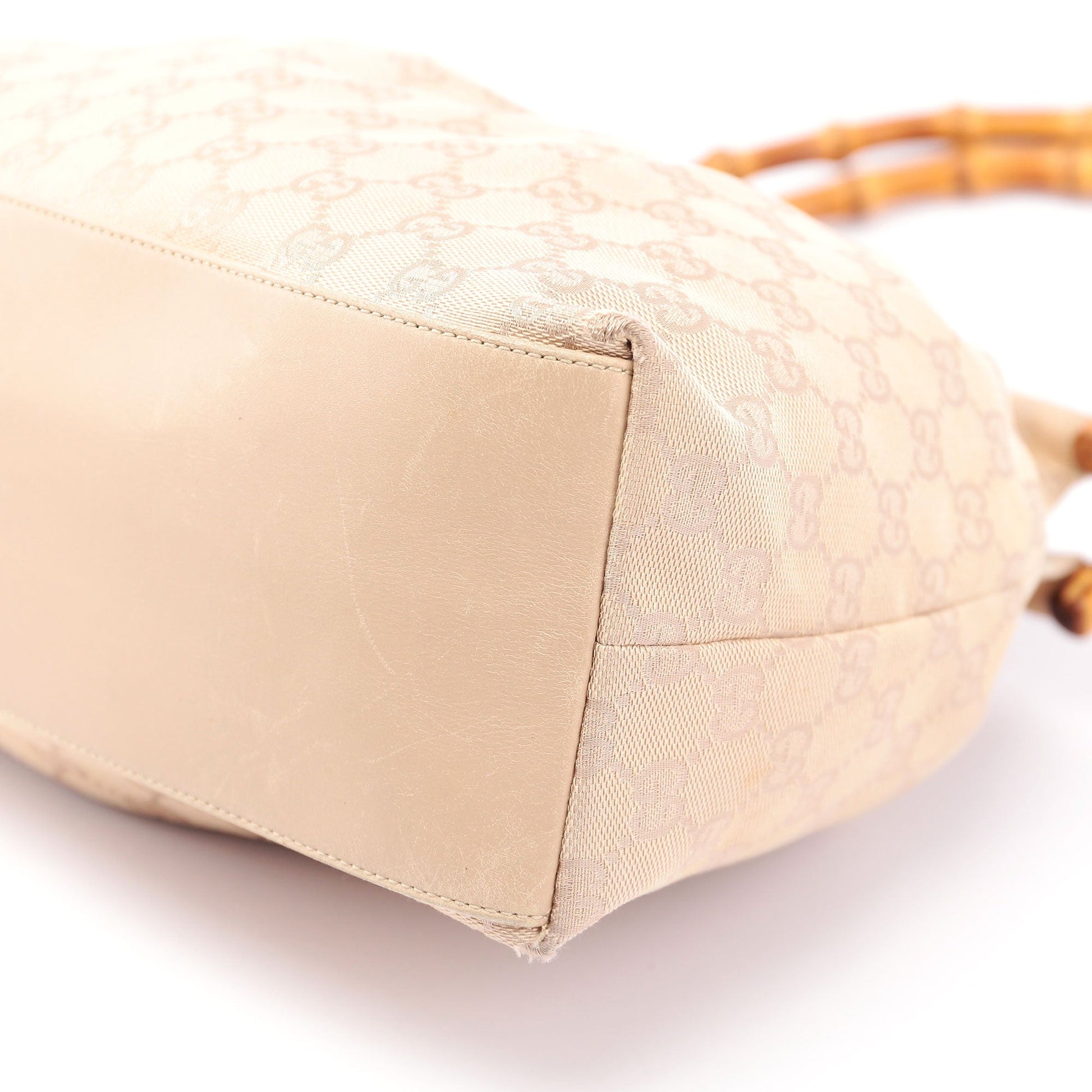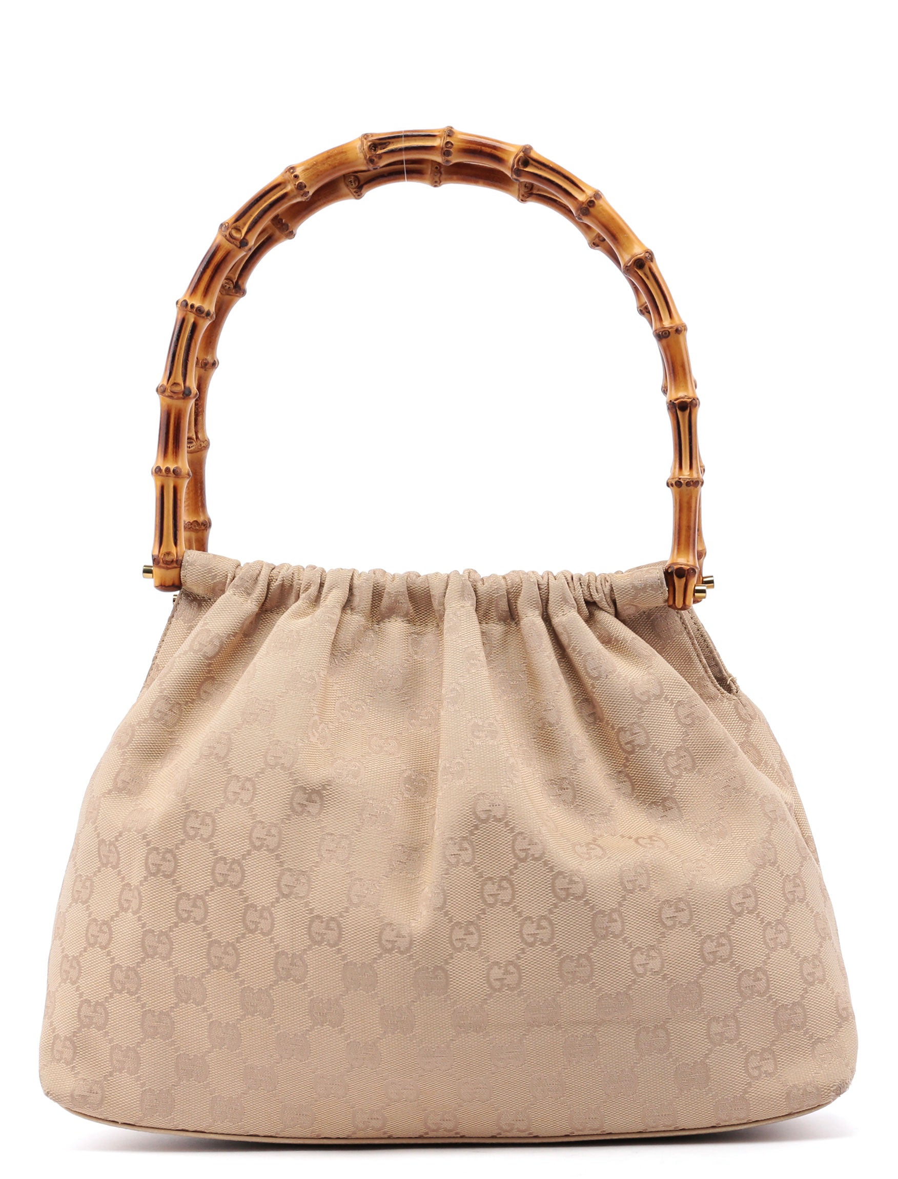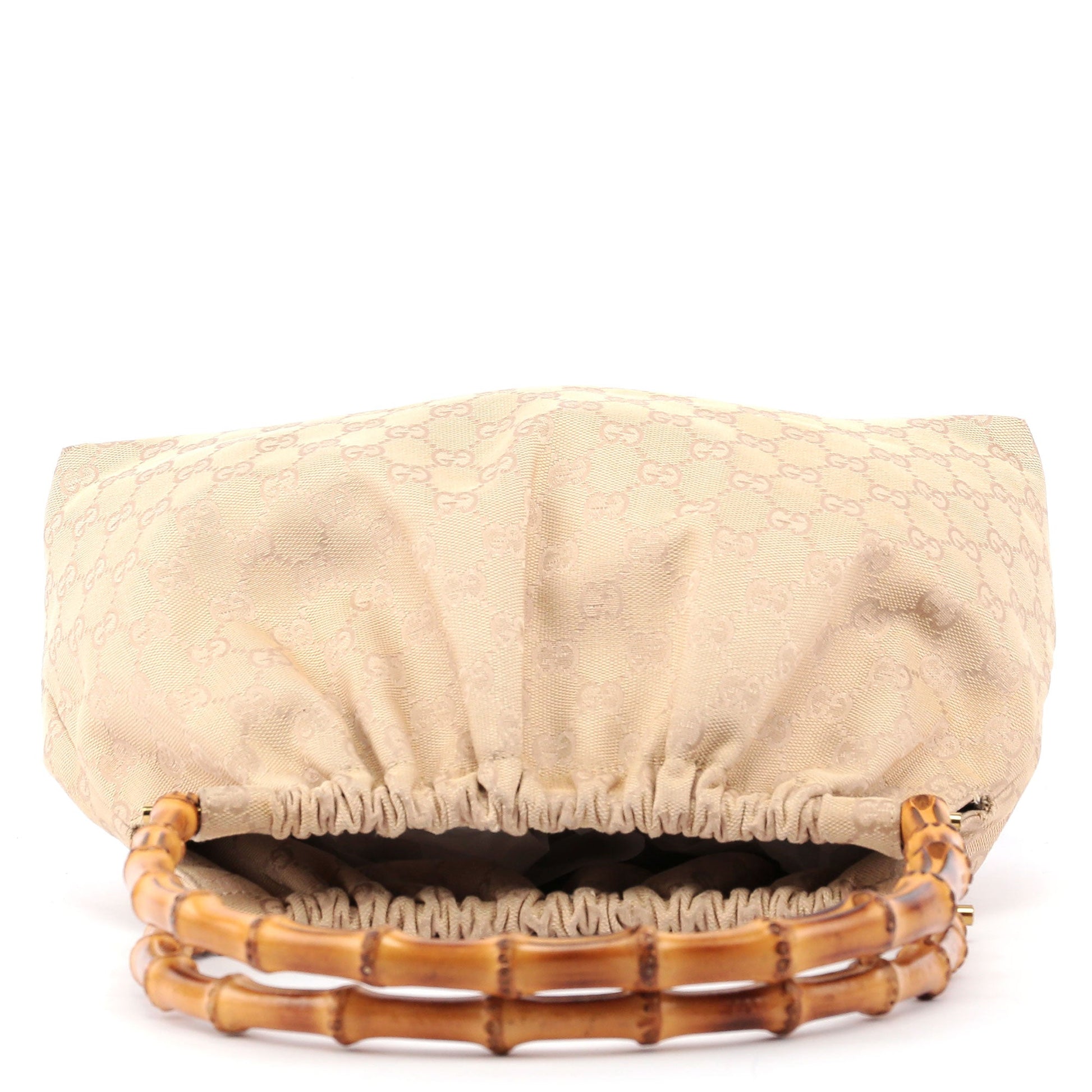 Designed by Tom Ford in the late '90s, this Gucci Bamboo bag features beige GG monogram canvas with a tonal leather bottom panel and gold-tone hardware. It boasts two iconic bamboo handles and a cotton-lined interior with a pocket, merging classic style with everyday functionality.