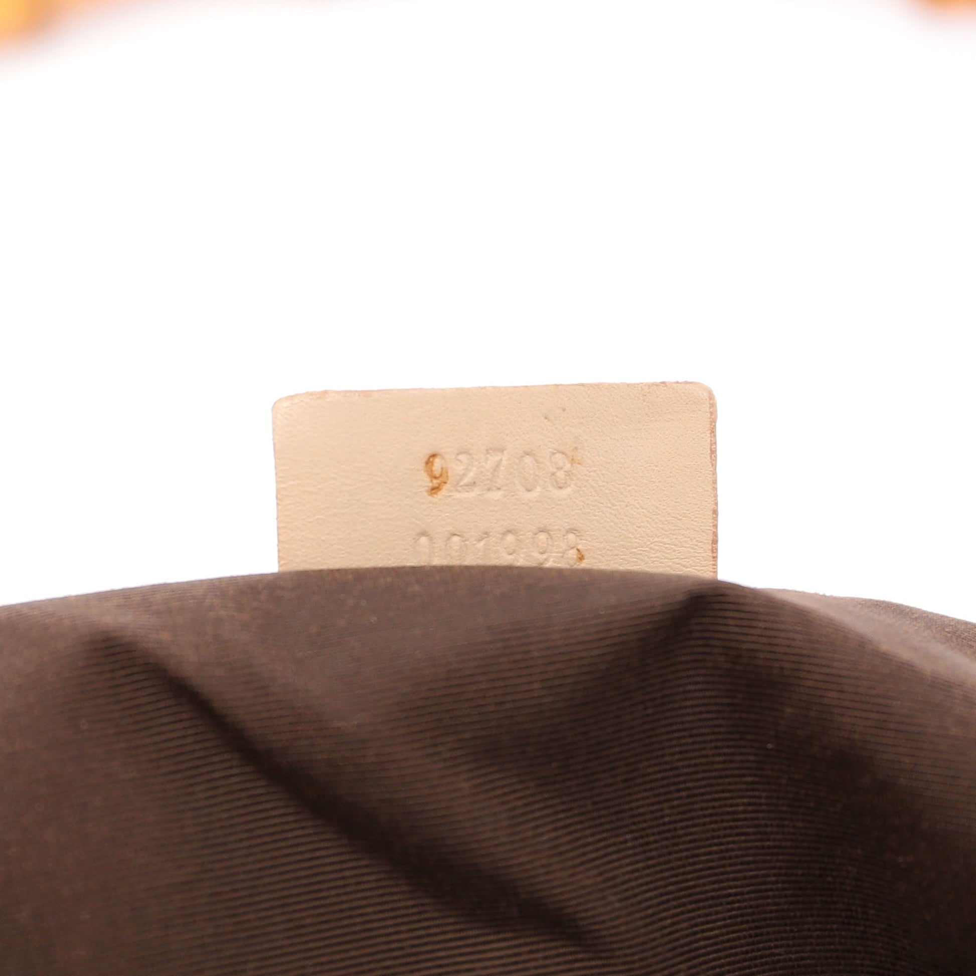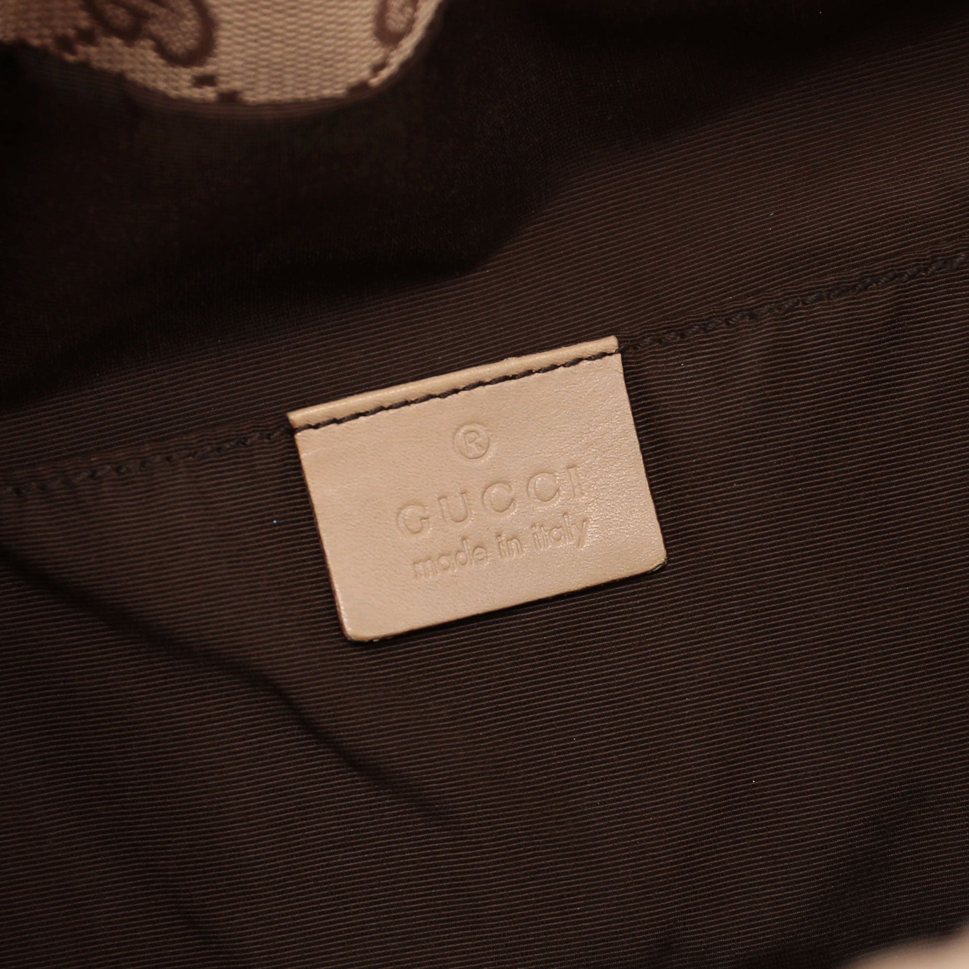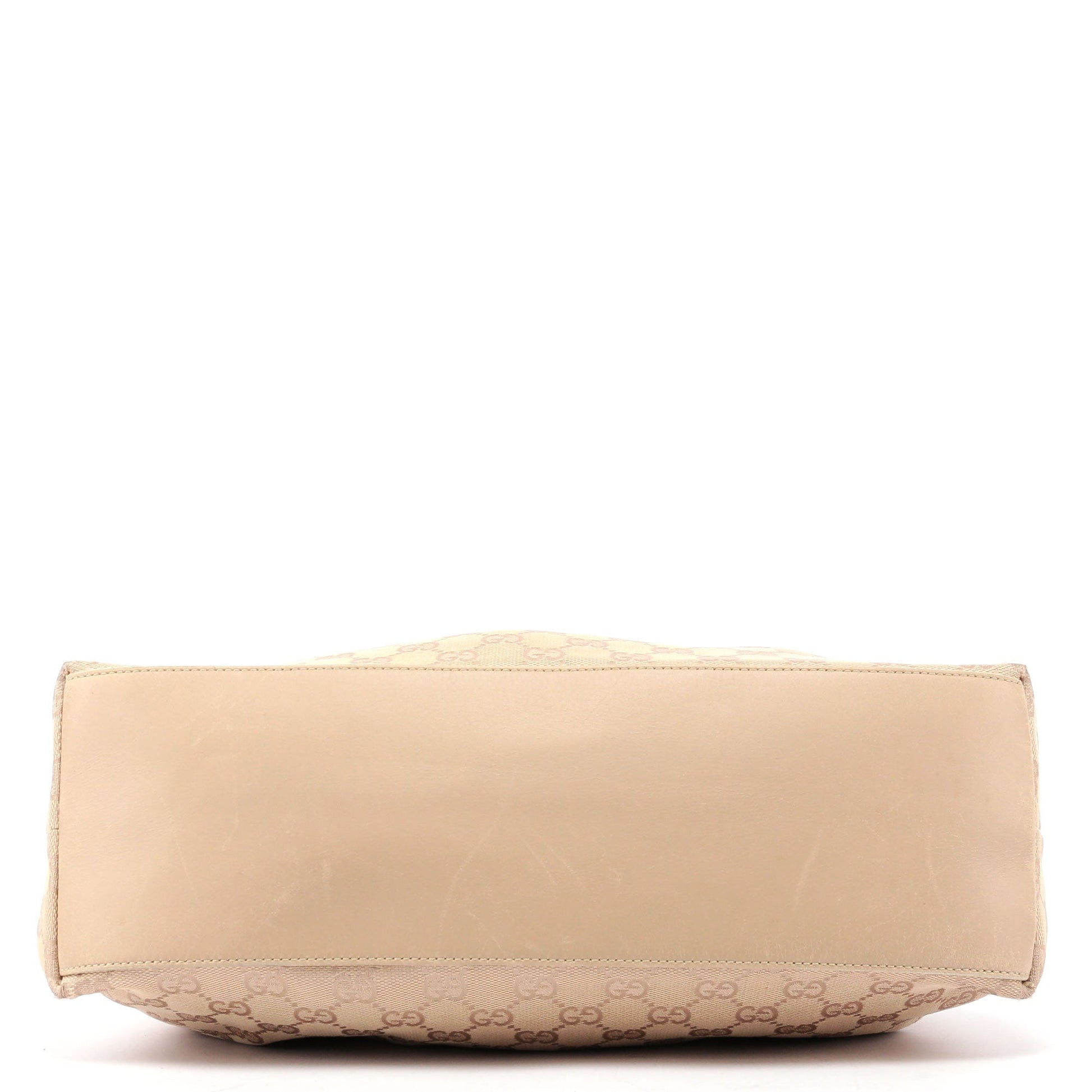 Designed by Tom Ford in the late '90s, this Gucci Bamboo bag features beige GG monogram canvas with a tonal leather bottom panel and gold-tone hardware. It boasts two iconic bamboo handles and a cotton-lined interior with a pocket, merging classic style with everyday functionality.