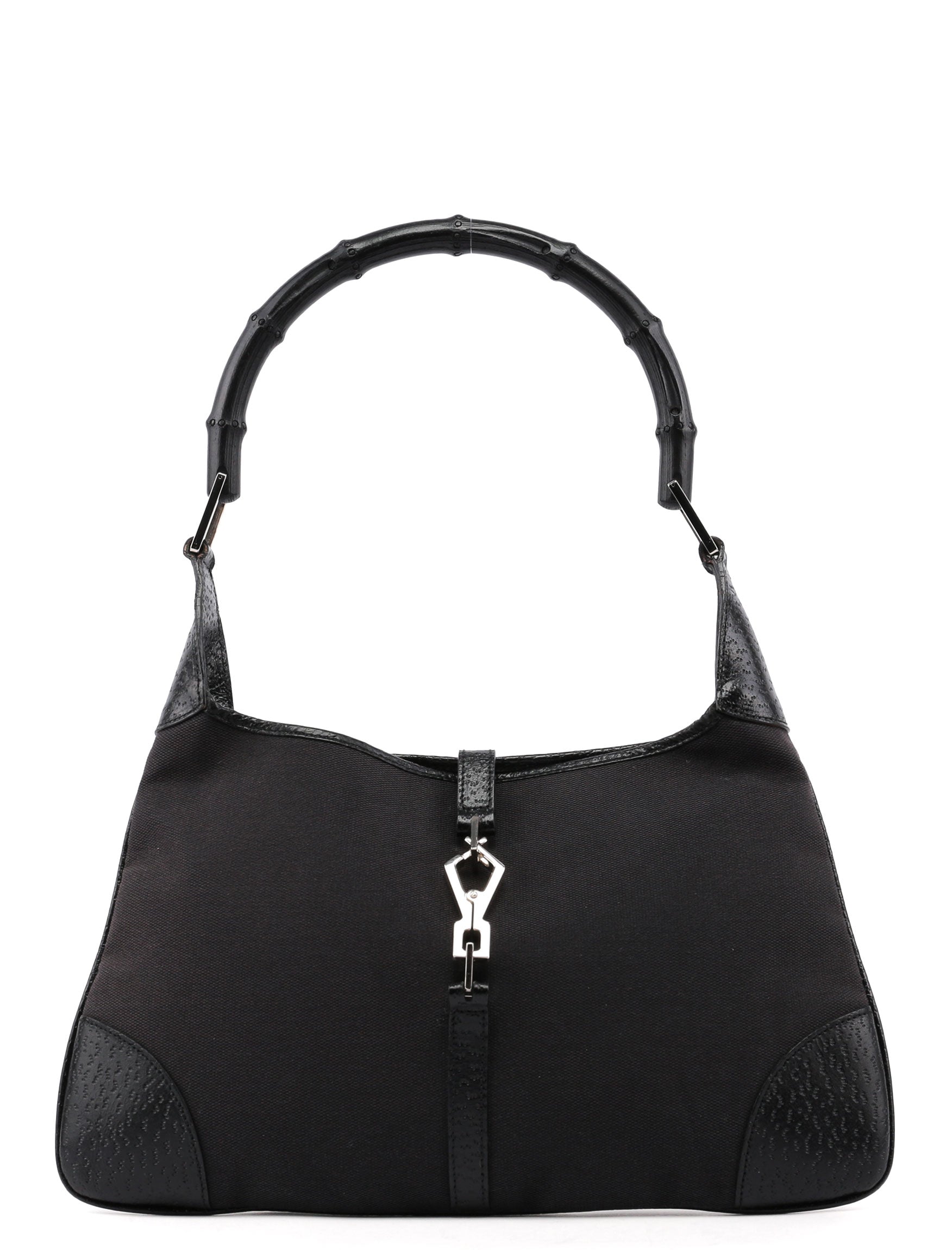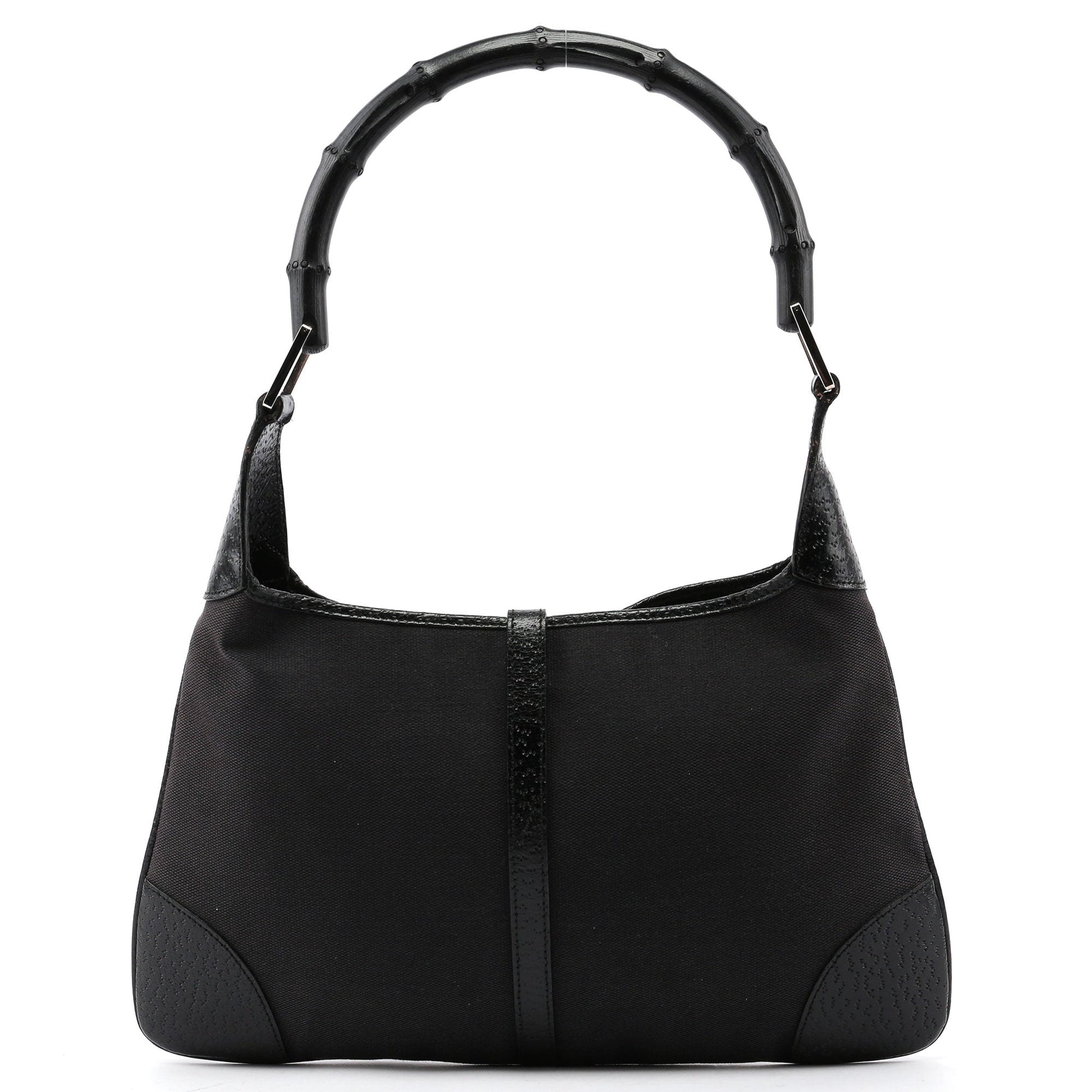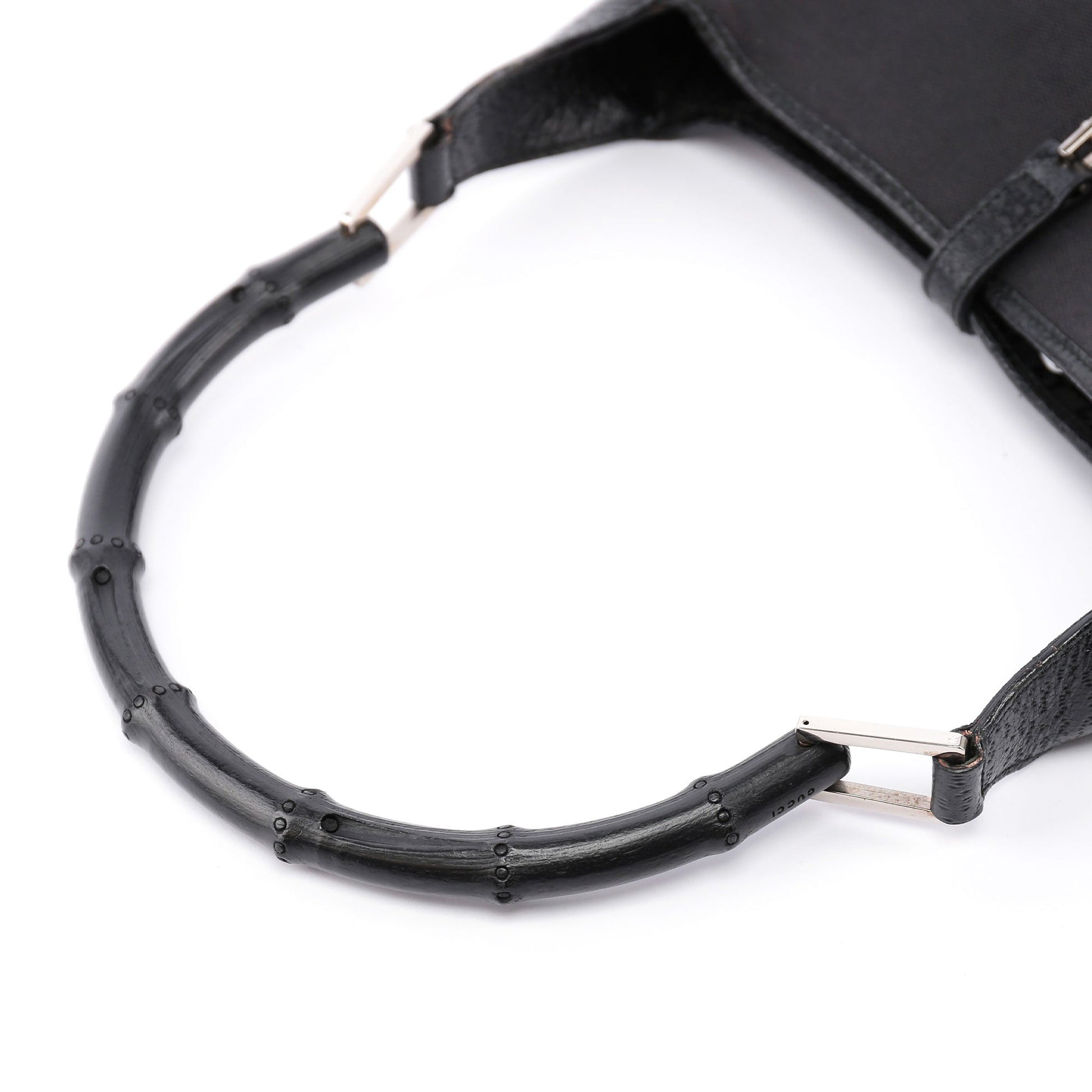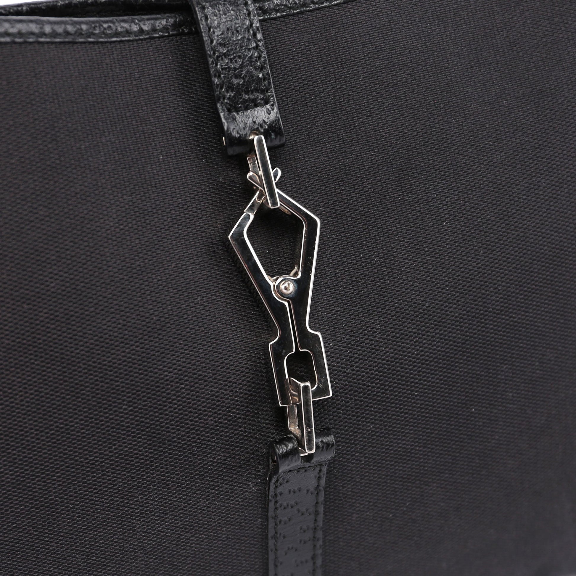 Designed by Tom Ford in the late 1990s, this Gucci Jackie Bamboo bag is handcrafted in black cotton canvas with black leather trim, accented by silver-tone hardware. It features a black bamboo handle with Gucci logo engraving and a classic silver-tone Jackie style closure. The interior, lined with square GG monogram satin and including an interior zipper pocket, marries functional design with Gucci's timeless aesthetic.