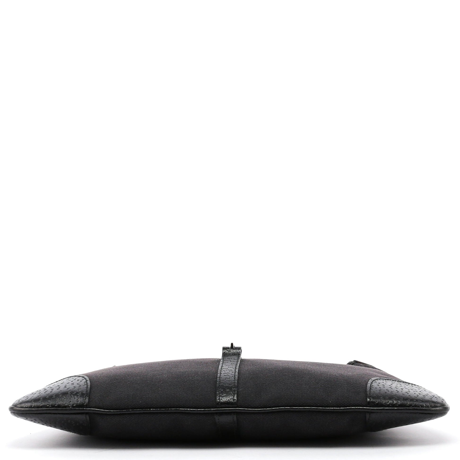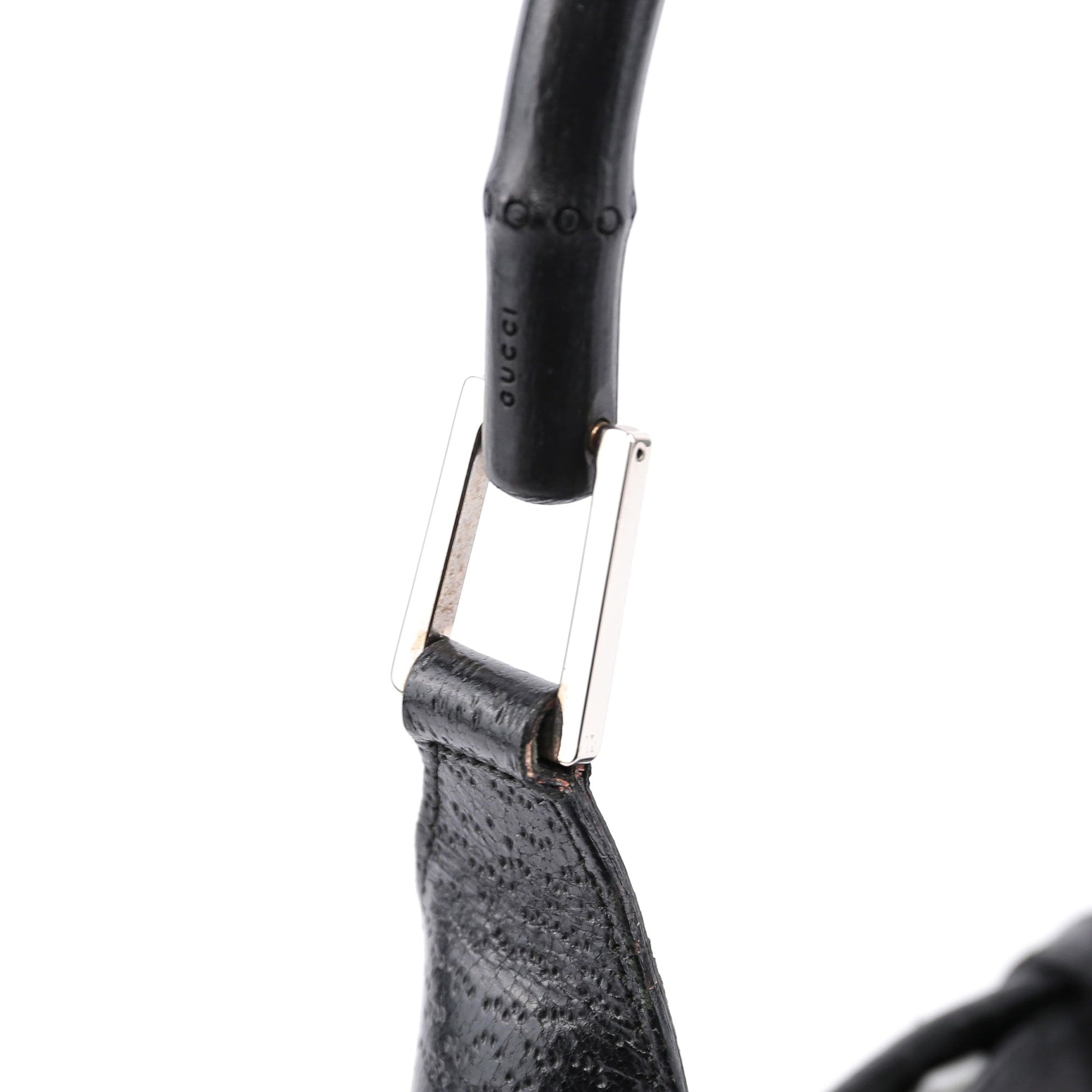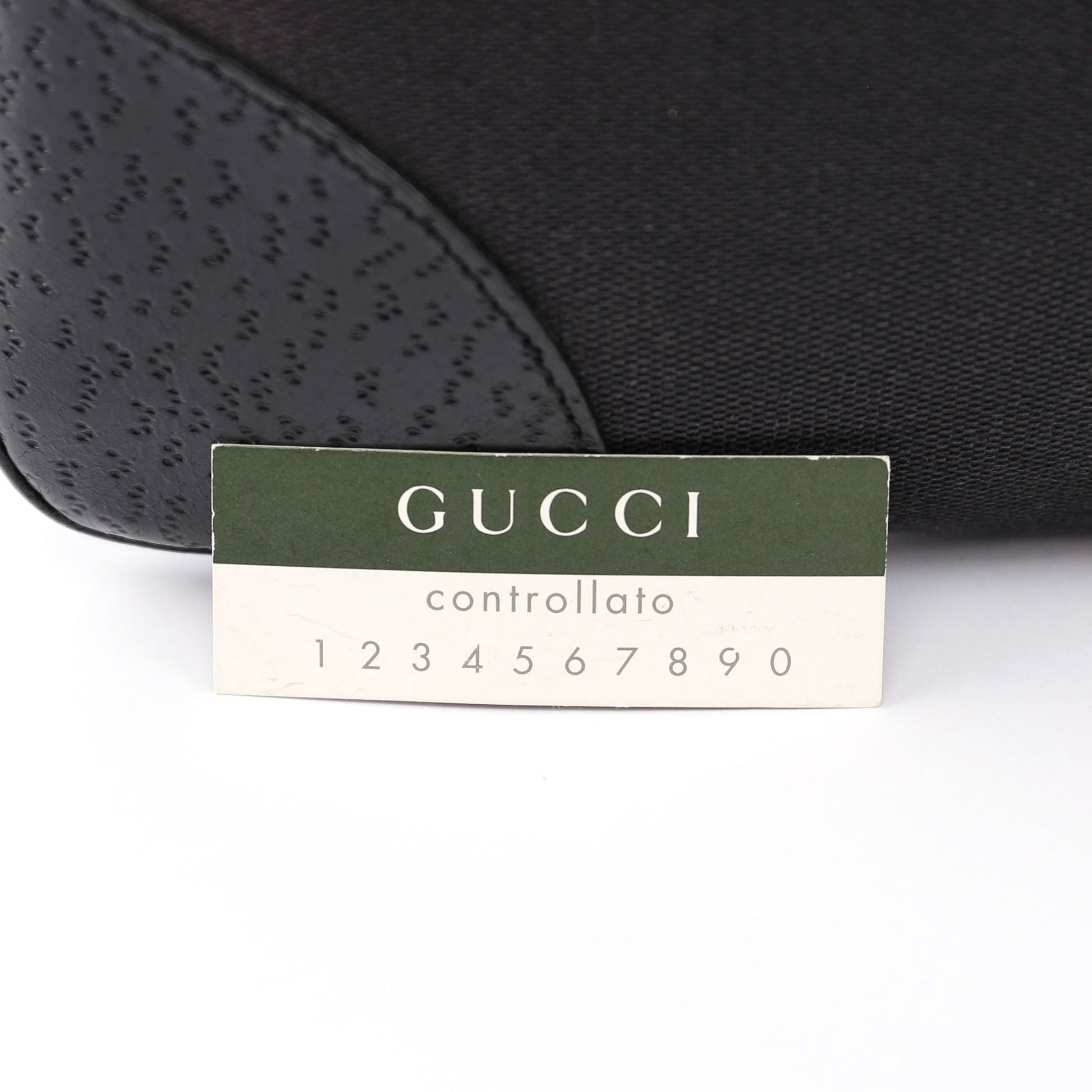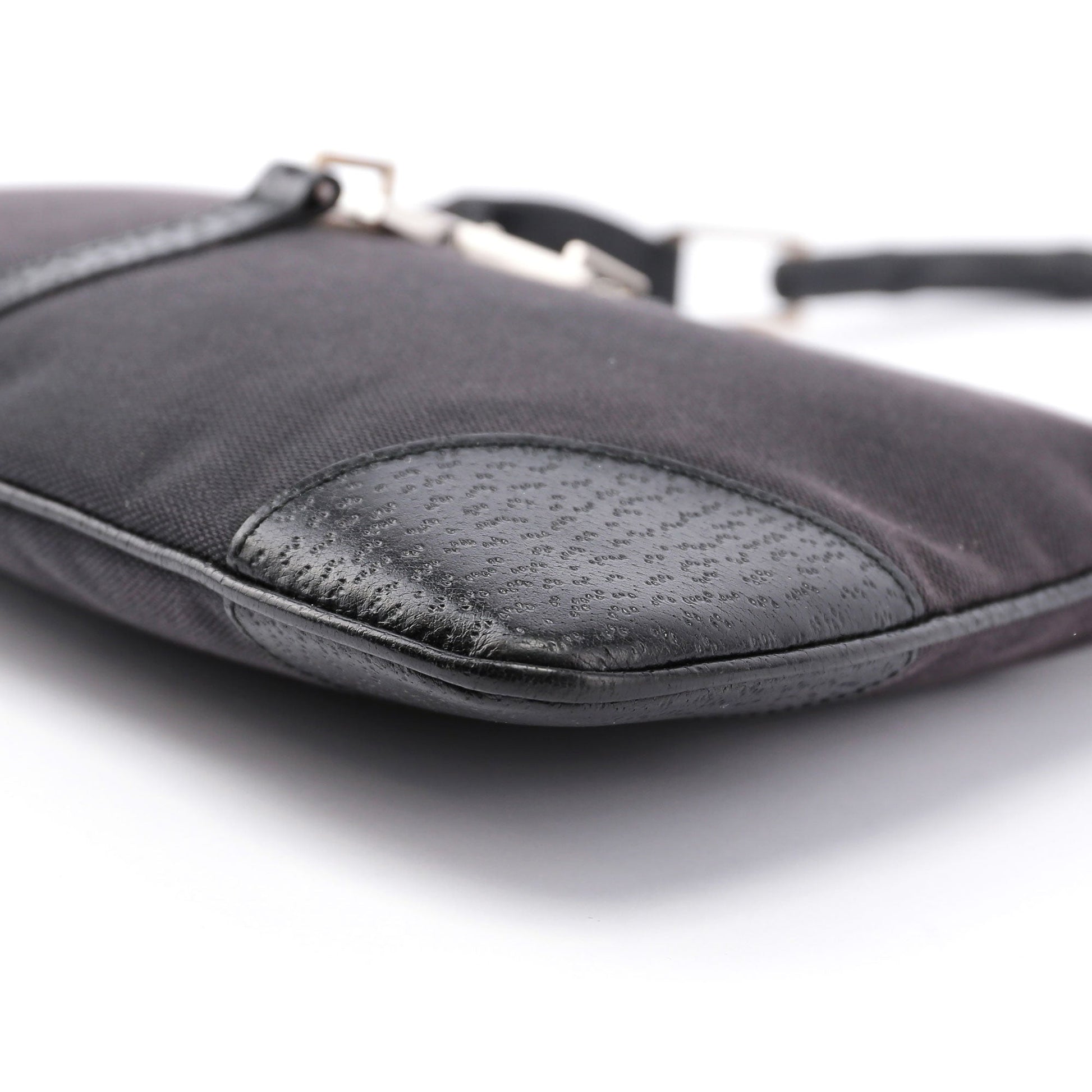Designed by Tom Ford in the late 1990s, this Gucci Jackie Bamboo bag is handcrafted in black cotton canvas with black leather trim, accented by silver-tone hardware. It features a black bamboo handle with Gucci logo engraving and a classic silver-tone Jackie style closure. The interior, lined with square GG monogram satin and including an interior zipper pocket, marries functional design with Gucci's timeless aesthetic.