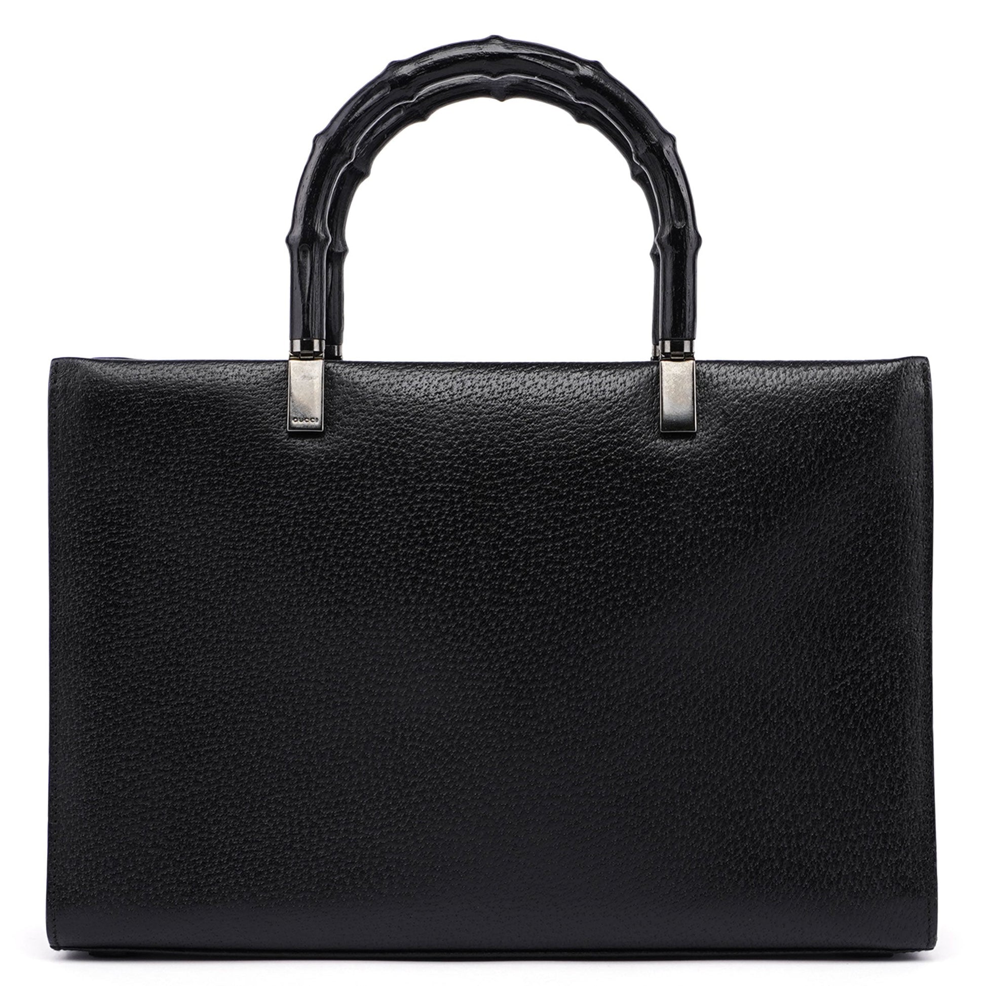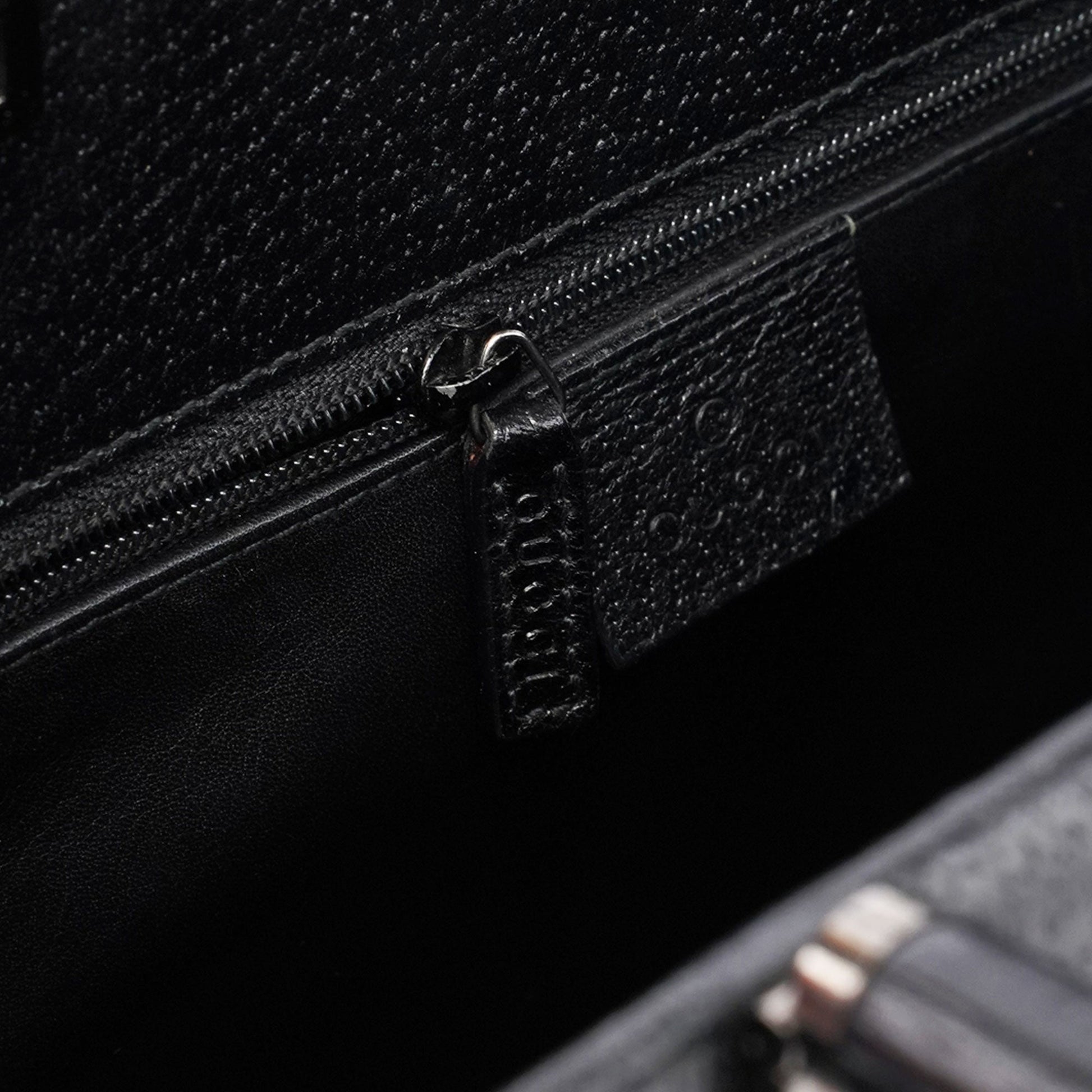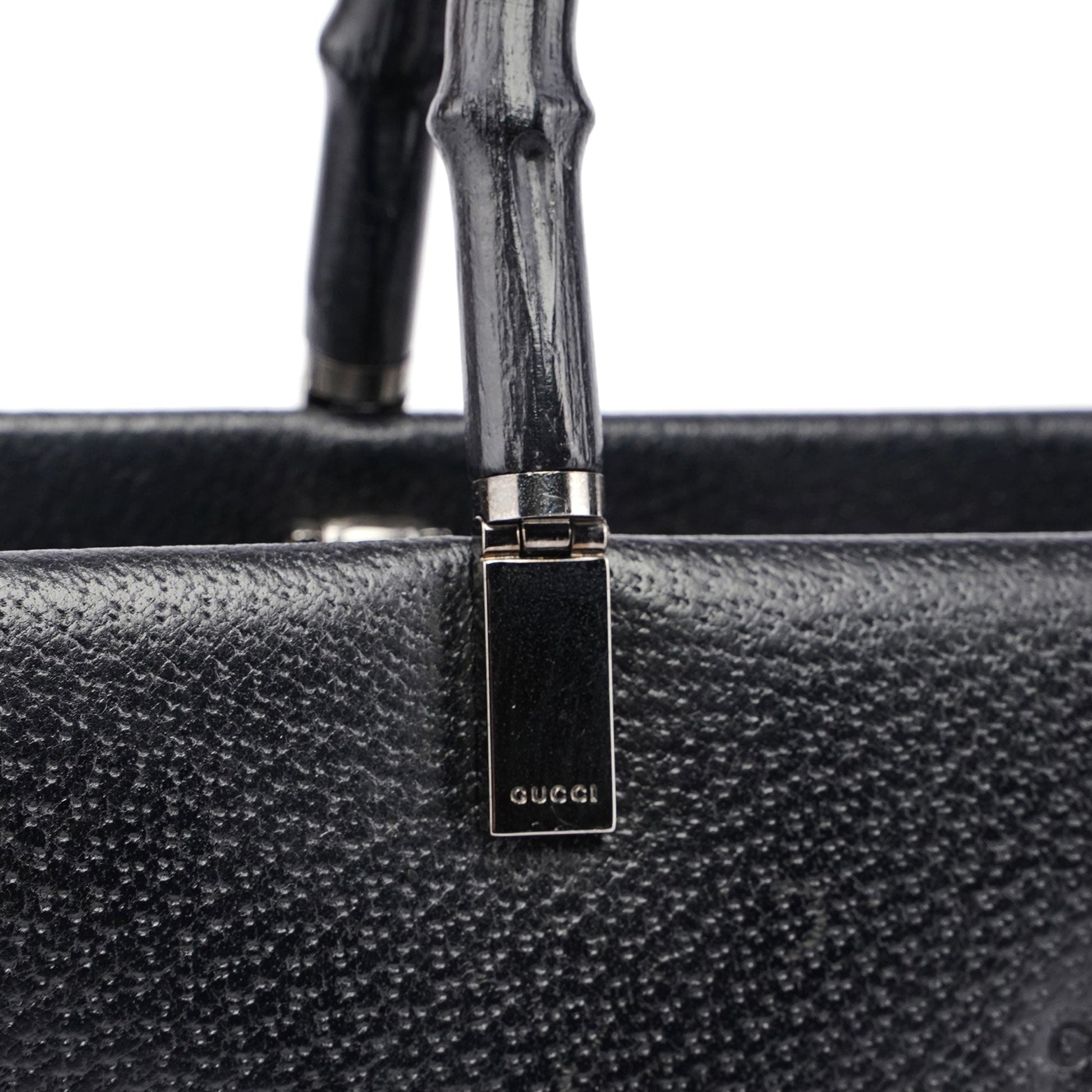 This Gucci Bamboo tote bag, a late 1990s creation by Tom Ford, is crafted from textured black leather, featuring silver-tone hardware with Gucci logo engraving for an iconic touch. It boasts two gloss black bamboo handles, with provisions for attaching a crossbody strap, enhancing its versatility. The bag's clip closure secures the contents, while the interior, lined with calfskin leather, includes two pockets for organization. The Gucci logo, embossed on the front, marks this piece as a symbol of luxury and craftsmanship.