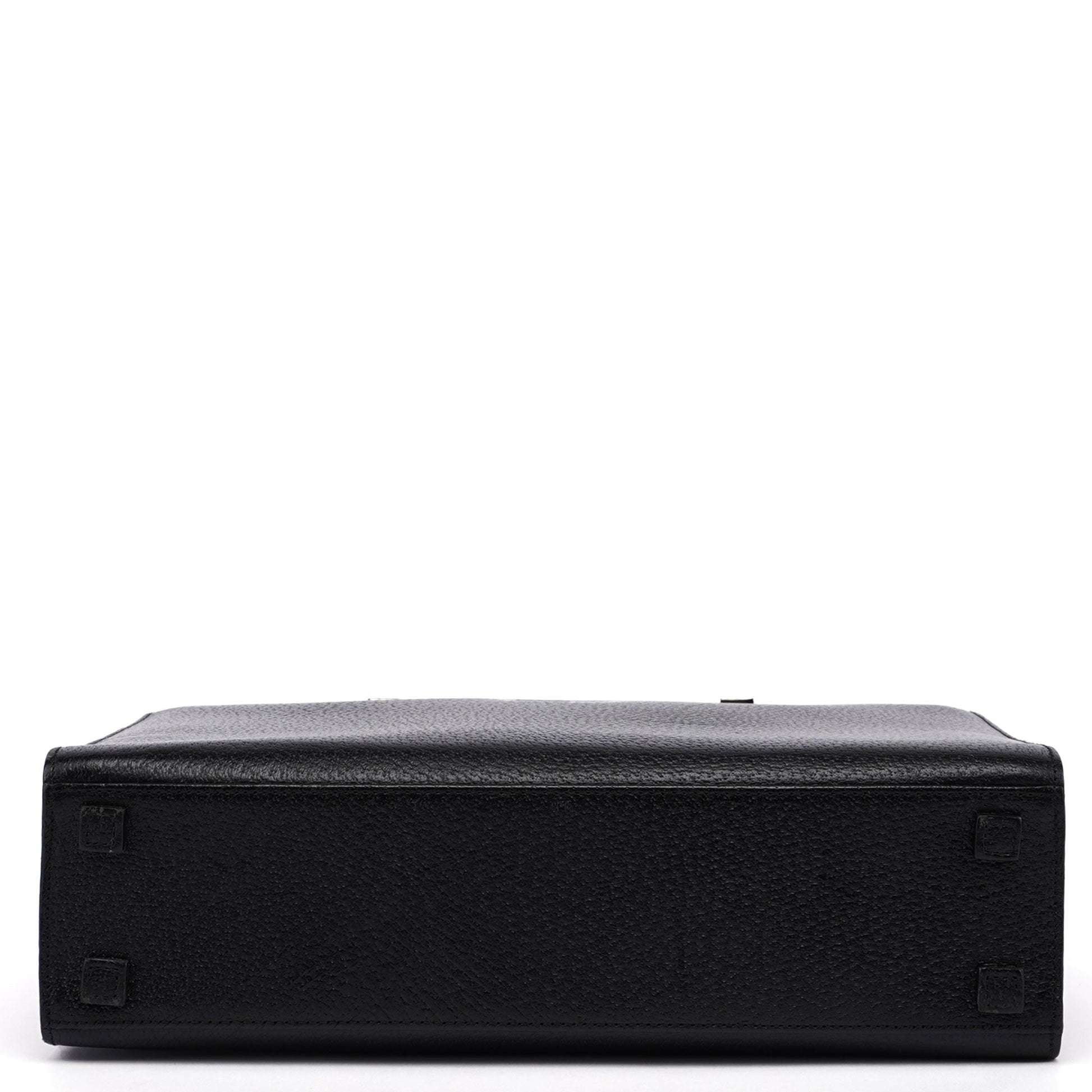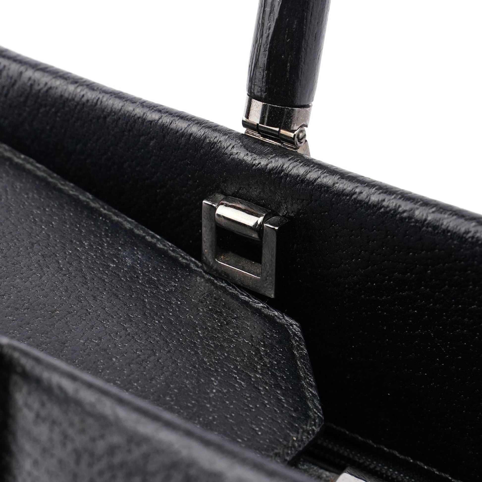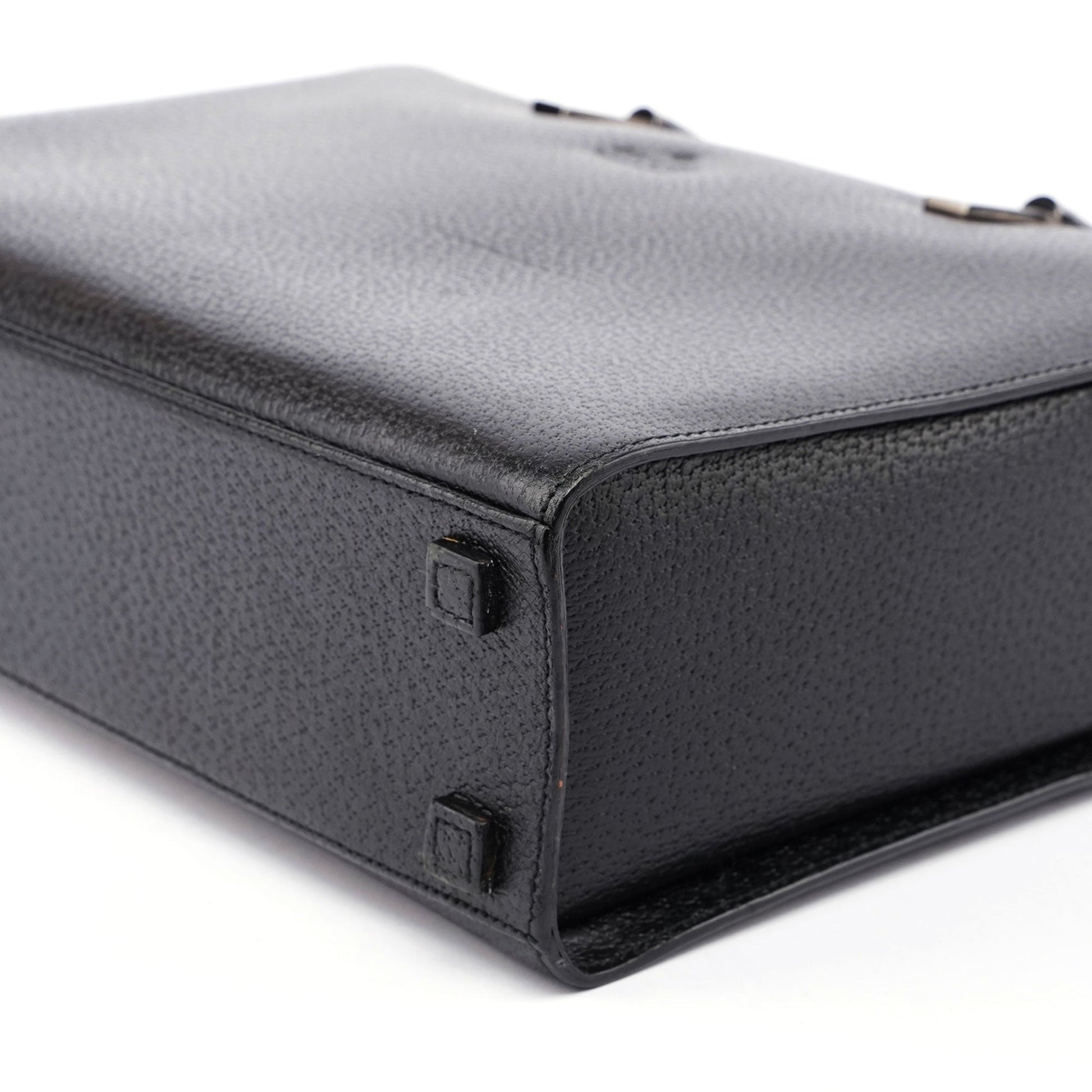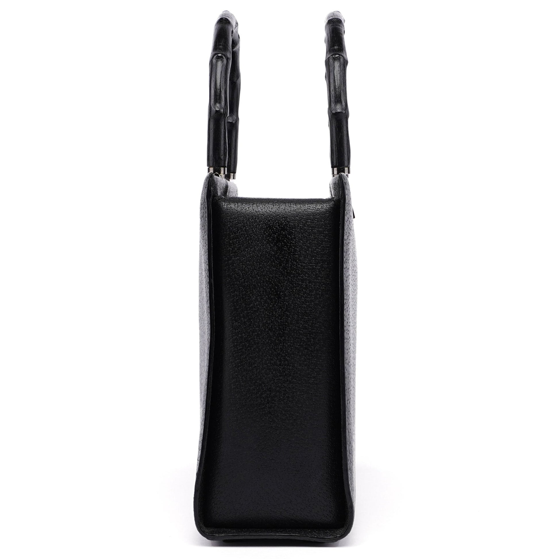 This Gucci Bamboo tote bag, a late 1990s creation by Tom Ford, is crafted from textured black leather, featuring silver-tone hardware with Gucci logo engraving for an iconic touch. It boasts two gloss black bamboo handles, with provisions for attaching a crossbody strap, enhancing its versatility. The bag's clip closure secures the contents, while the interior, lined with calfskin leather, includes two pockets for organization. The Gucci logo, embossed on the front, marks this piece as a symbol of luxury and craftsmanship.
