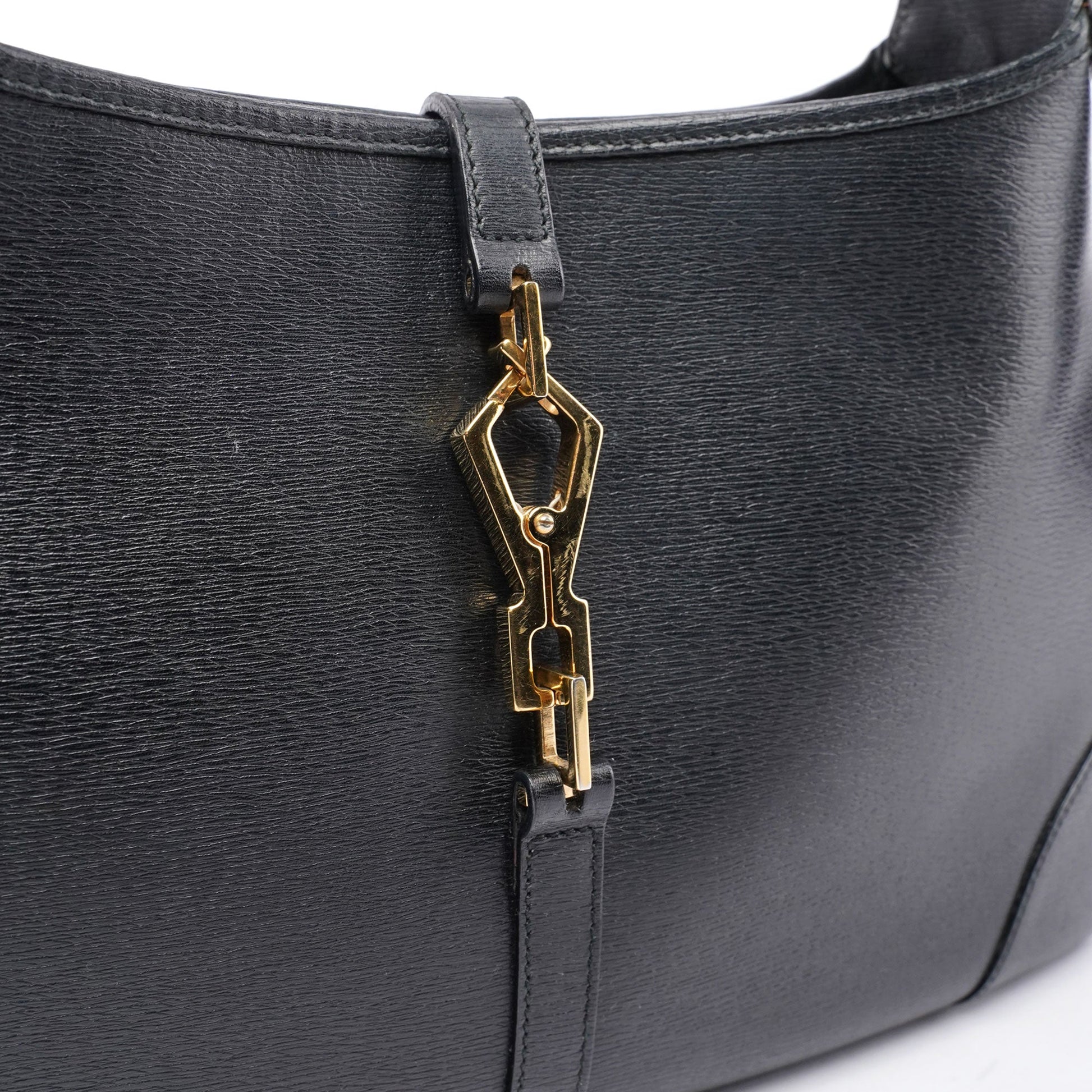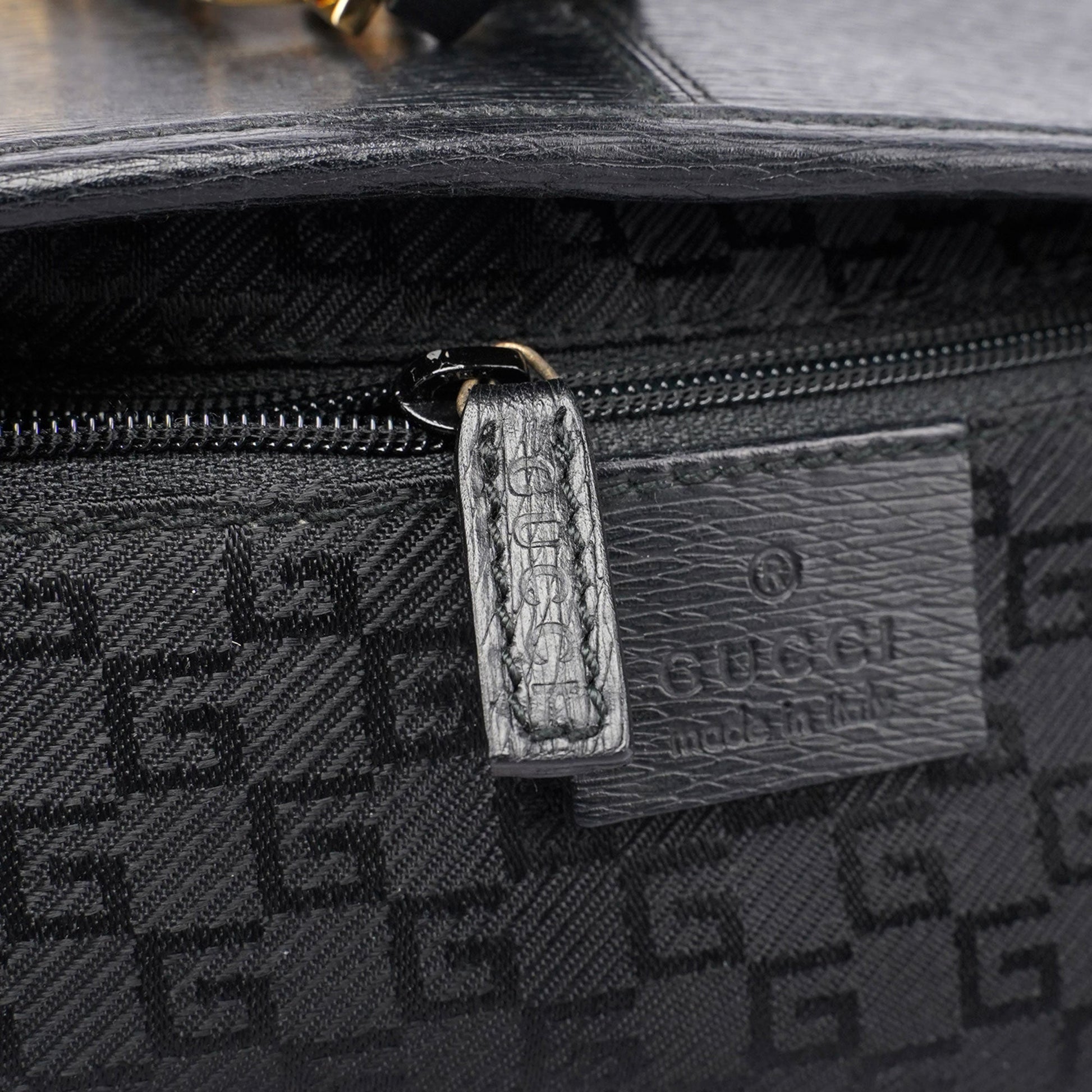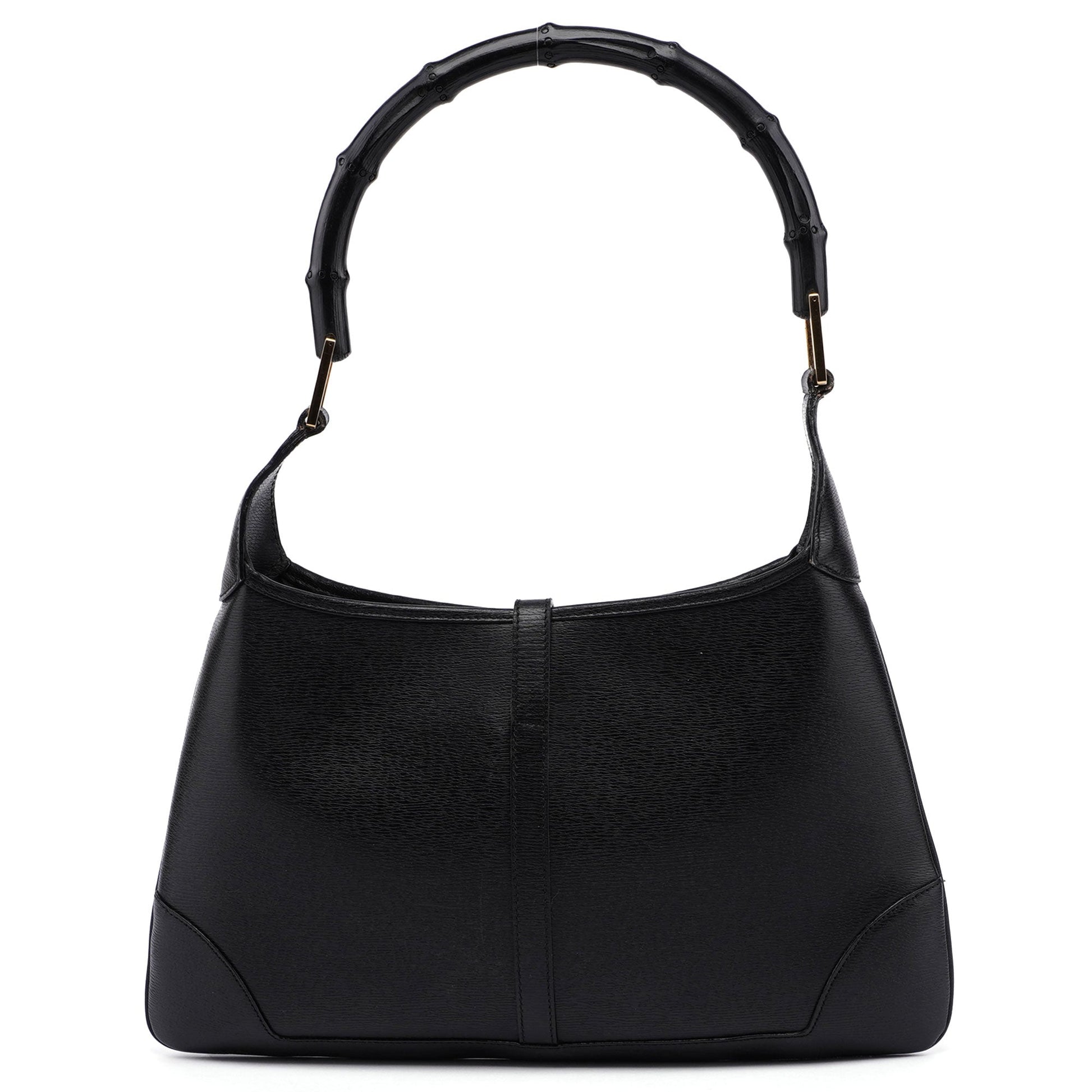 This Gucci Jackie Bamboo bag, a Tom Ford creation from the late '90s, exudes timeless elegance. The bag is handcrafted in textured black leather. It features lustrous gold-tone hardware and the iconic Jackie closure, complemented by the iconic bamboo handle with Gucci logo engraving. The interior is lined with satin, including an interior zipper pocket for organized storage.