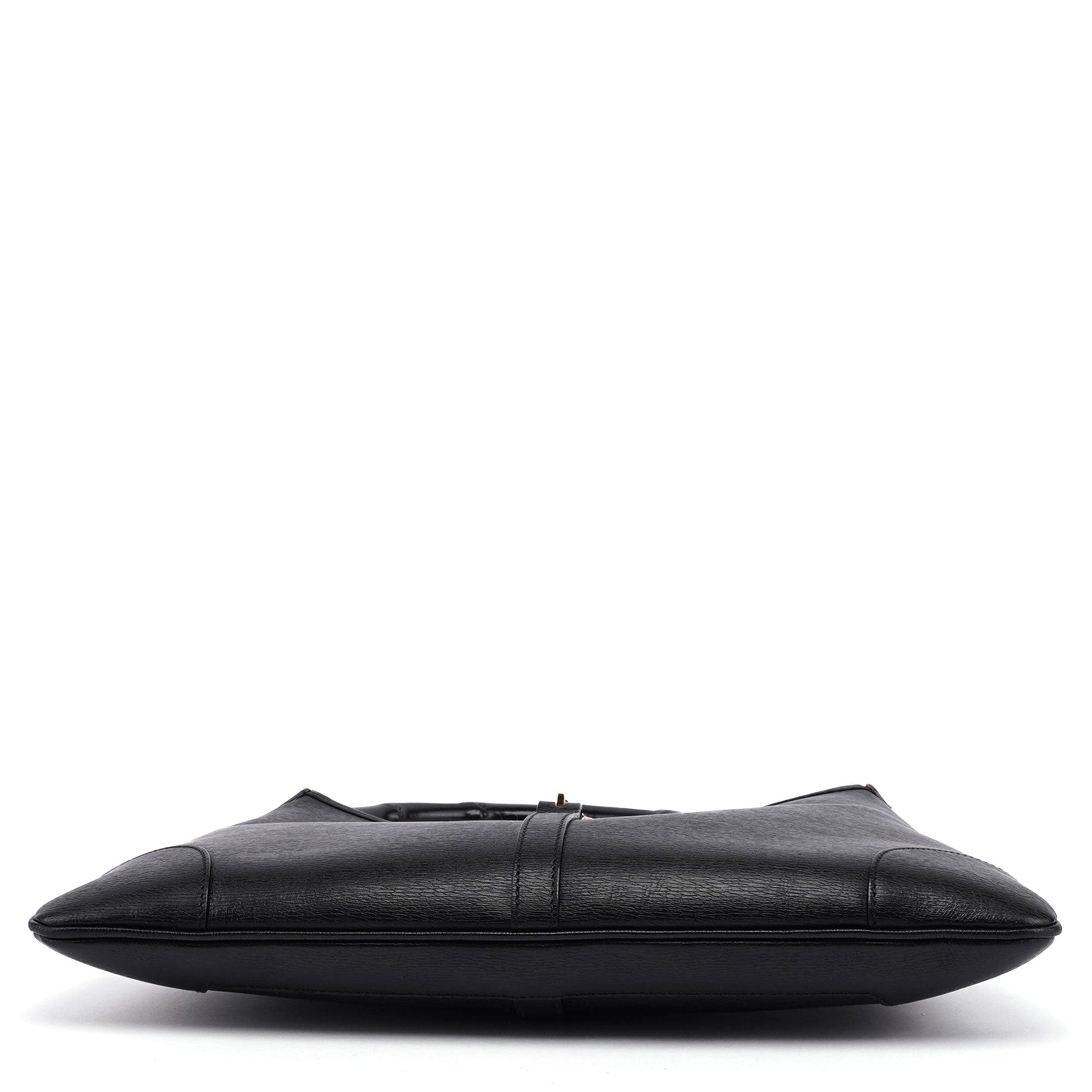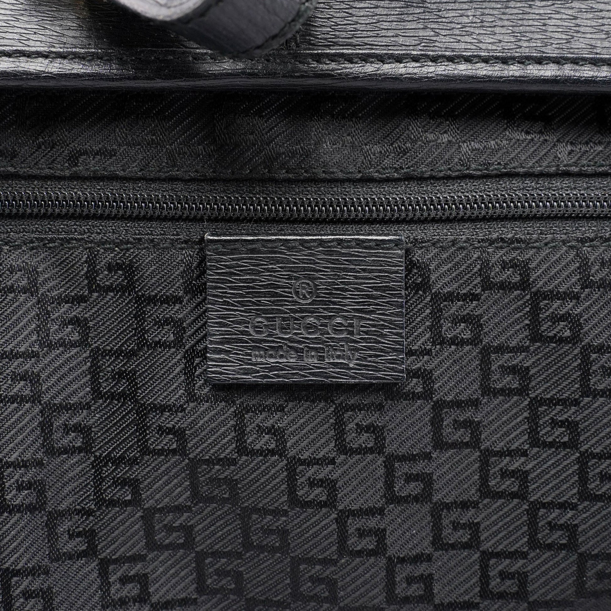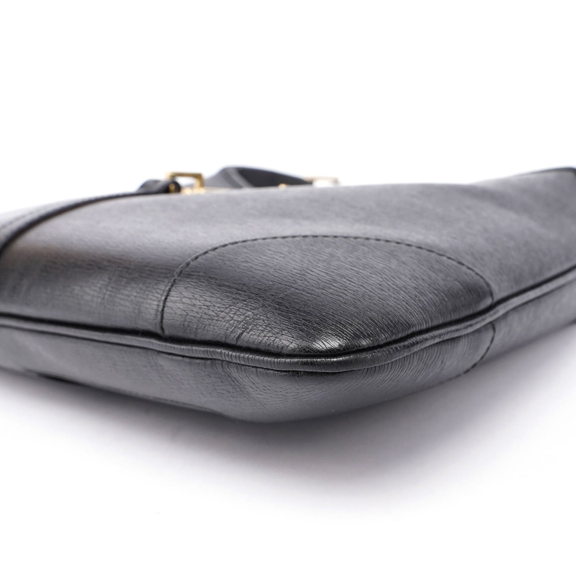 This Gucci Jackie Bamboo bag, a Tom Ford creation from the late '90s, exudes timeless elegance. The bag is handcrafted in textured black leather. It features lustrous gold-tone hardware and the iconic Jackie closure, complemented by the iconic bamboo handle with Gucci logo engraving. The interior is lined with satin, including an interior zipper pocket for organized storage.
