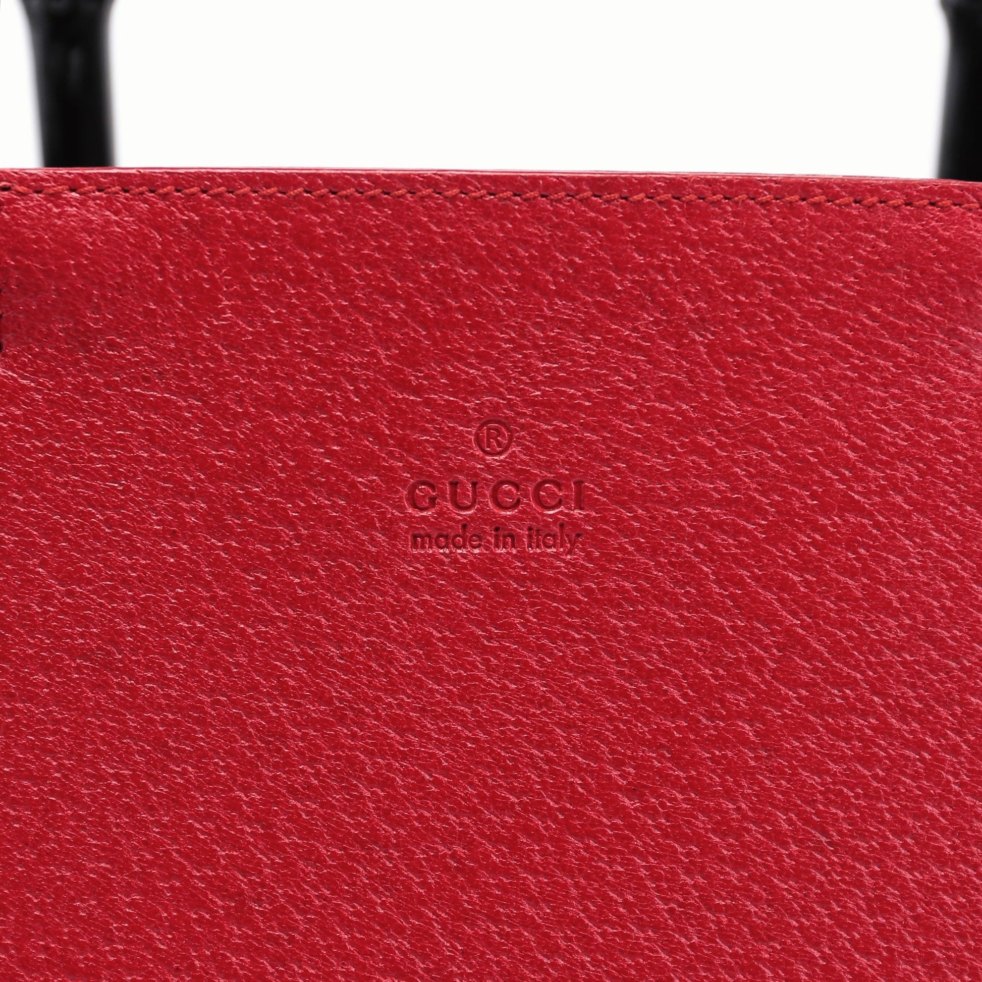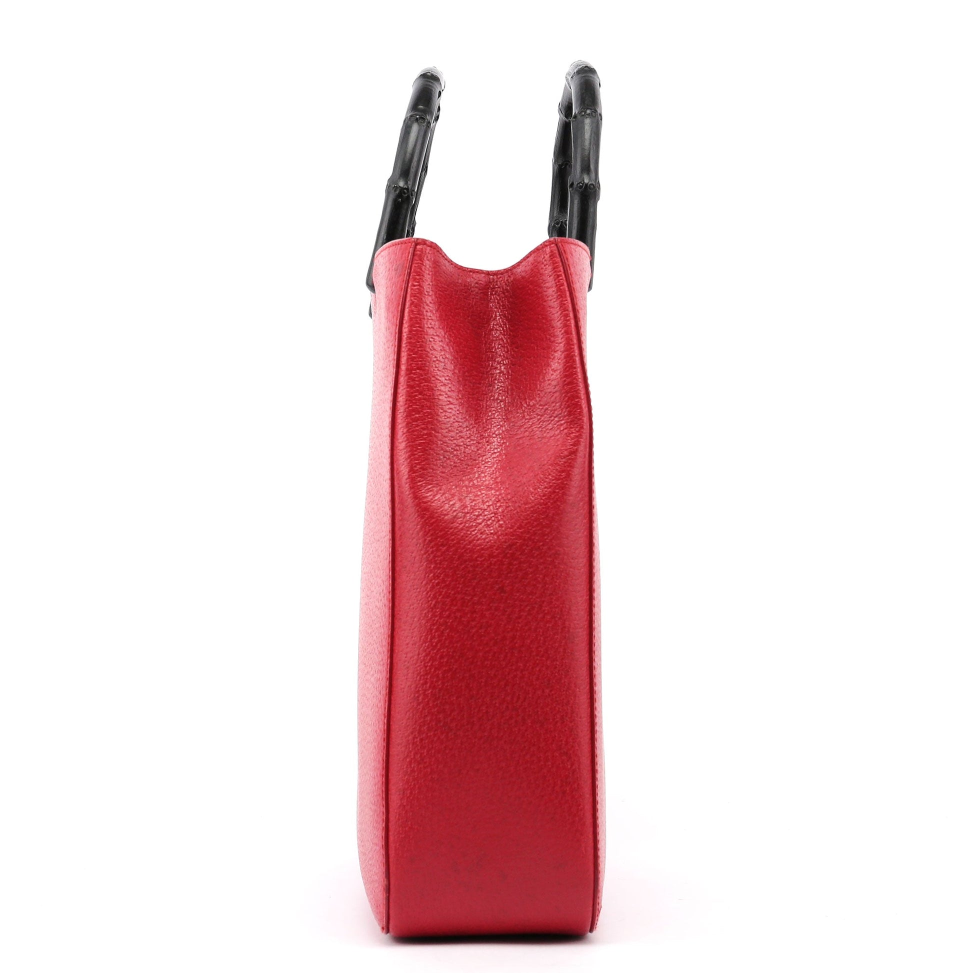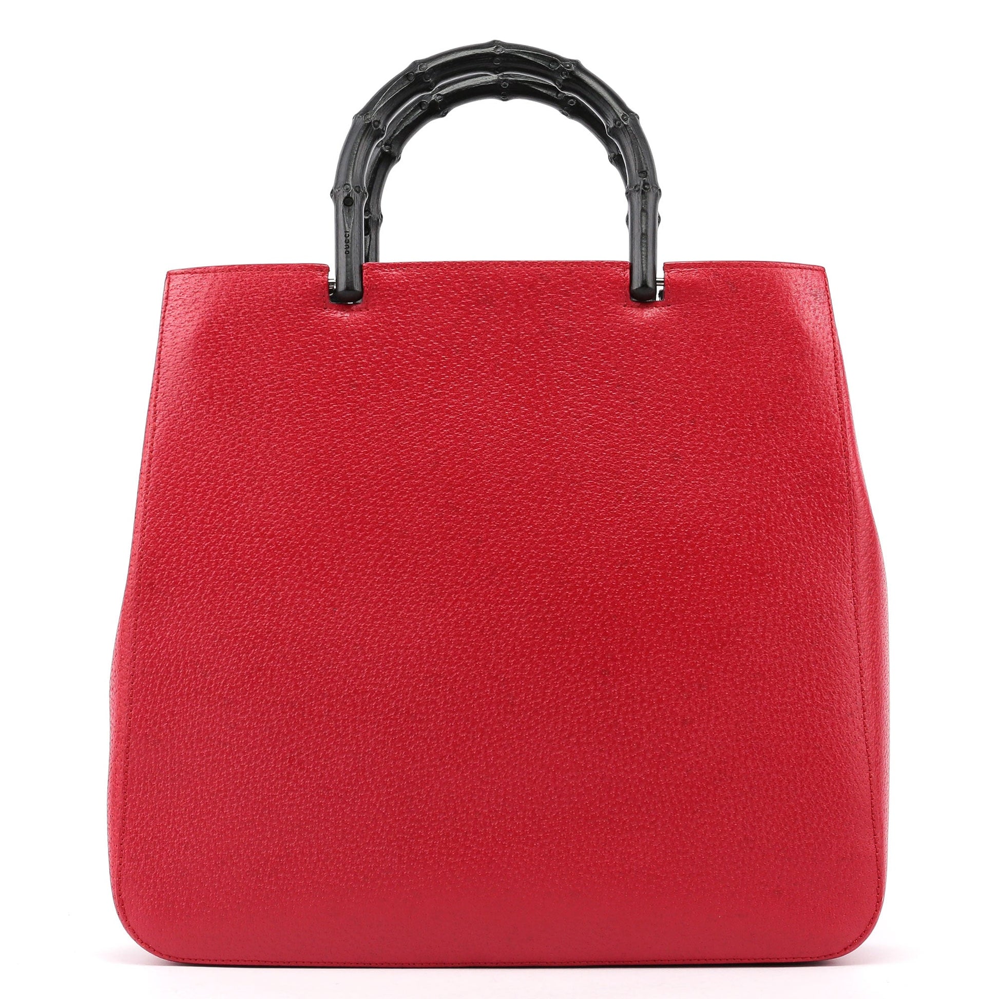 Designed by Tom Ford in the late 1990s, this Gucci Bamboo tote bag is handcrafted from red leather, featuring two gloss black bamboo handles with Gucci logo engraving and two compartments. The interior is lined with suede, and the Gucci logo is embossed at the front, showcasing timeless elegance and craftsmanship.