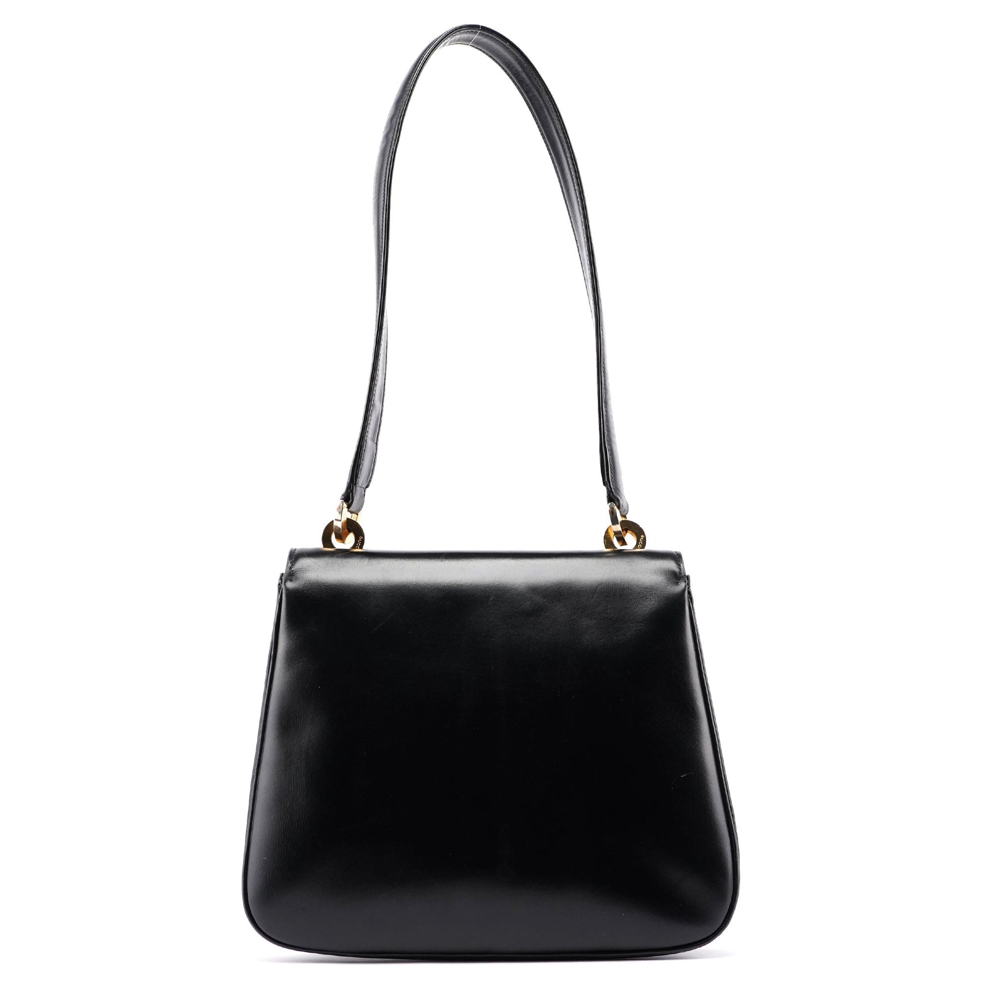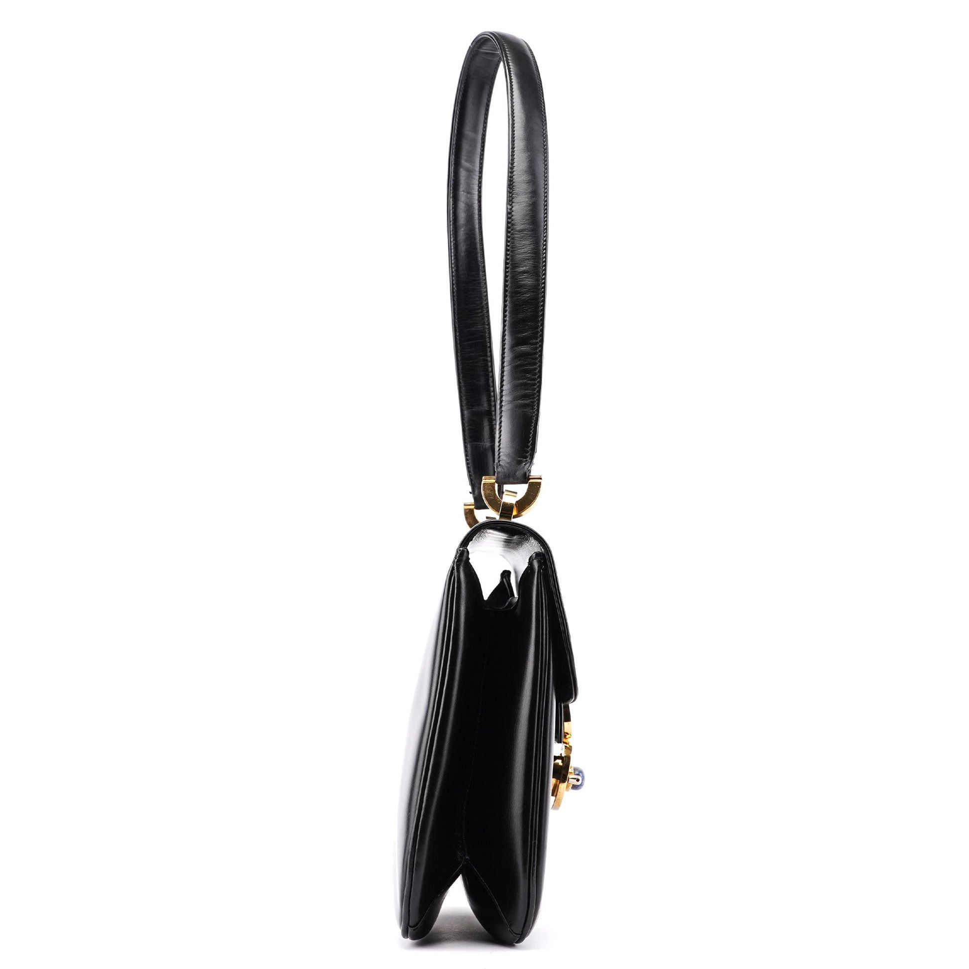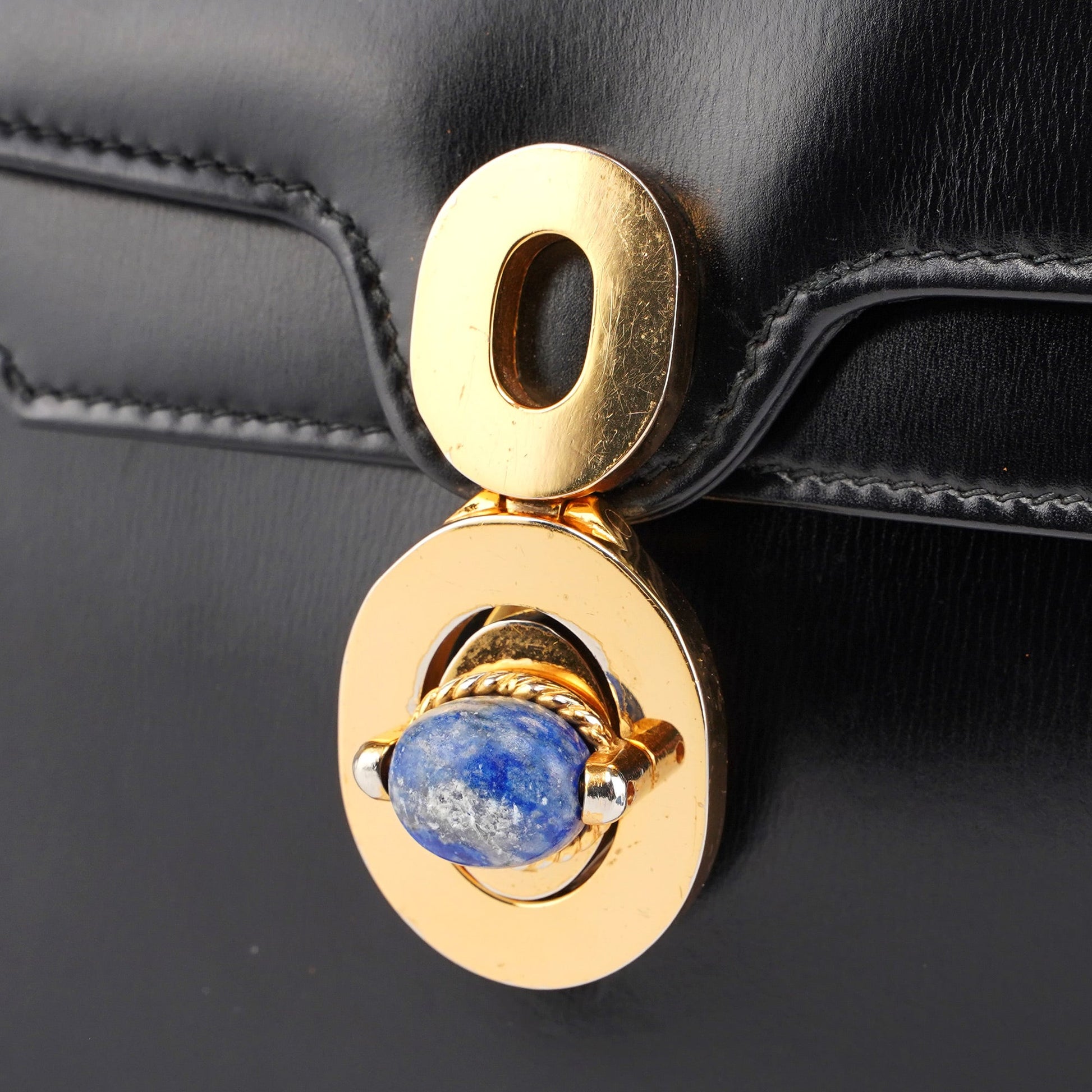 This incredibly rare vintage Gucci shoulder bag, designed in the early 1990s, is handcrafted from black calfskin leather and features gold-tone hardware with an lapis lazuli style closure. The interior is lined in leather and includes an interior zipper pocket, showcasing timeless elegance.