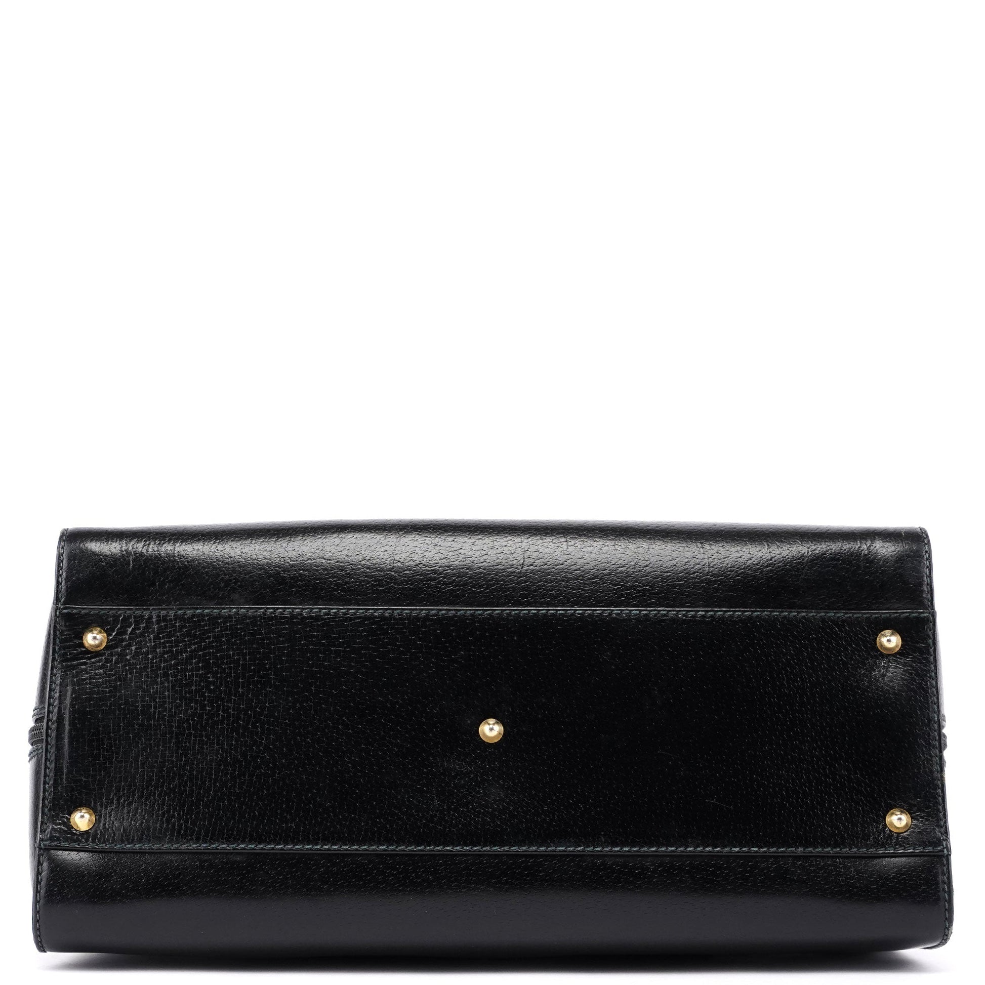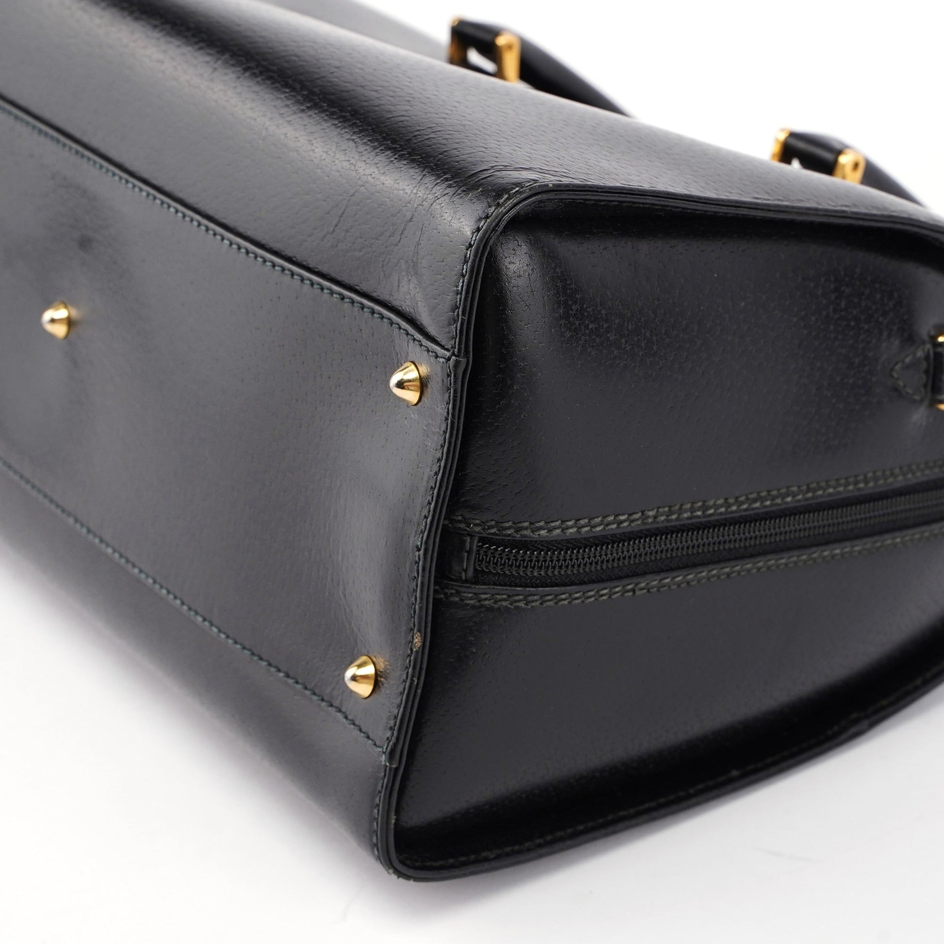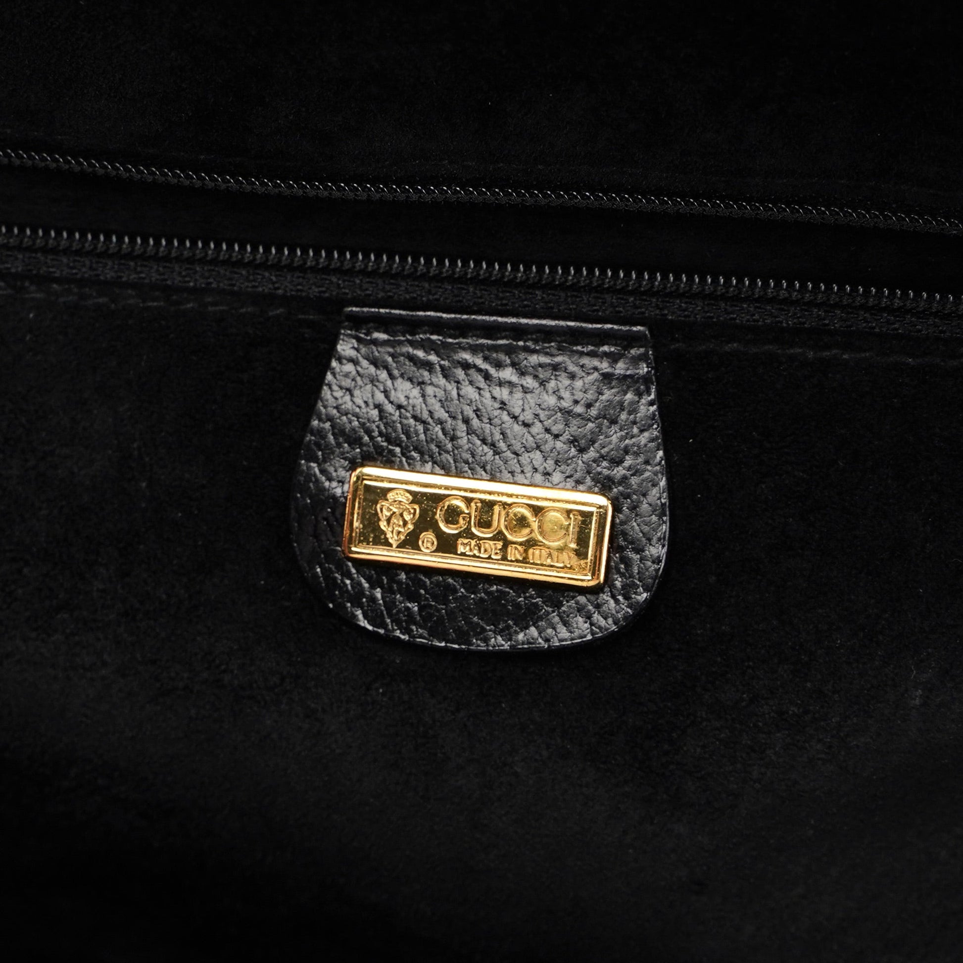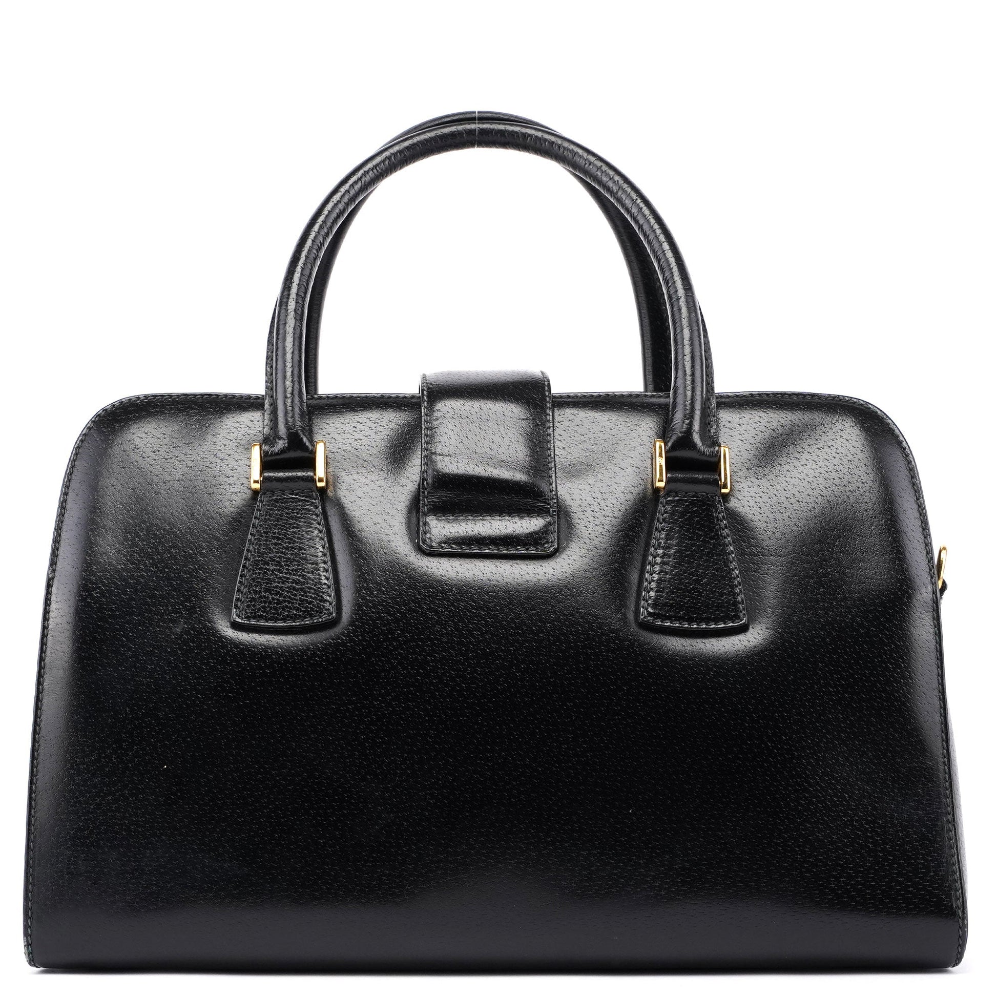Designed in the early 1990s, the Gucci leather Boston bag is handcrafted from textured black leather and features gold-tone hardware engraved with the Gucci logo. It includes two attachments for a crossbody strap. The interior is lined in black suede with an interior zipper pocket, showcasing timeless elegance.