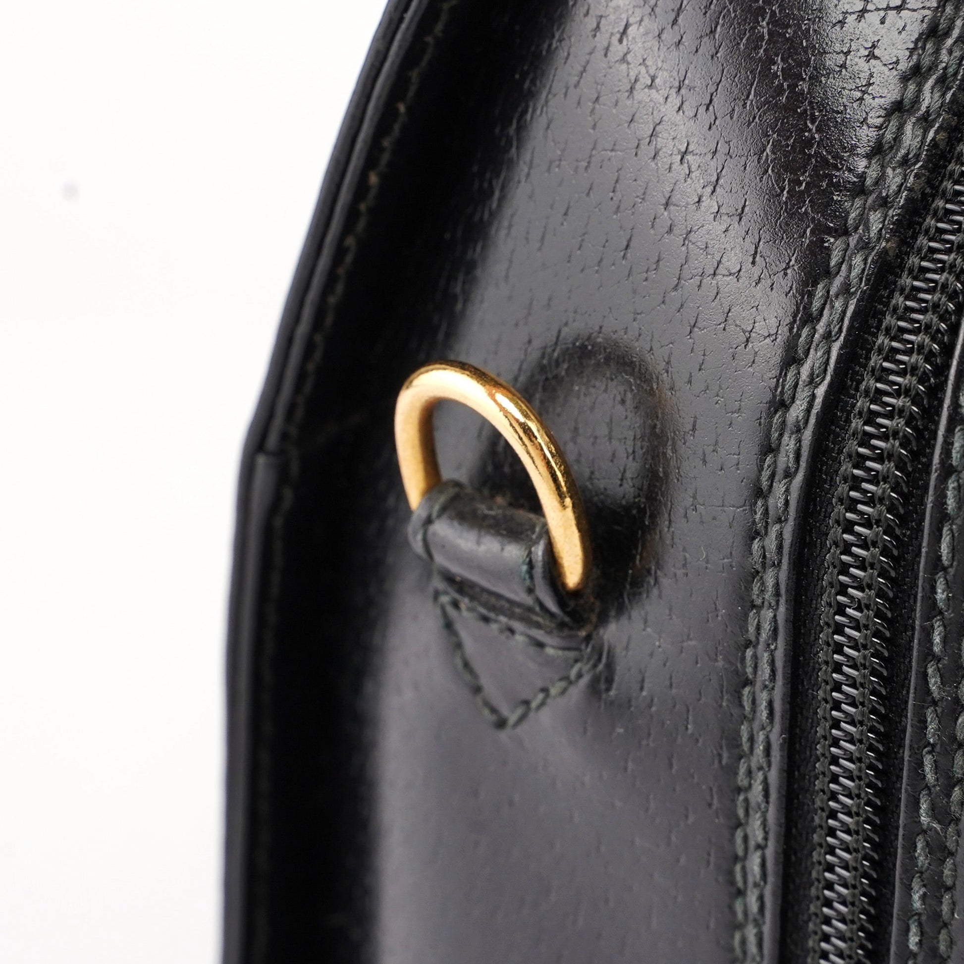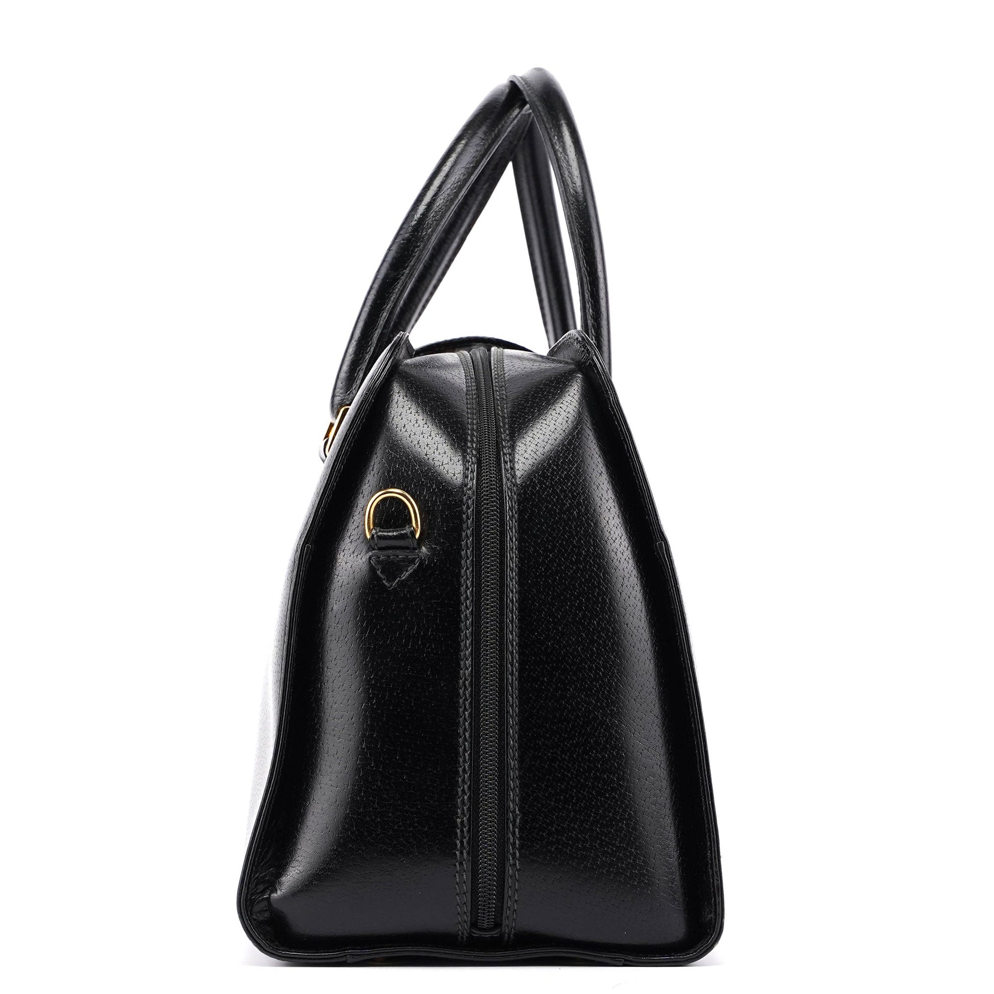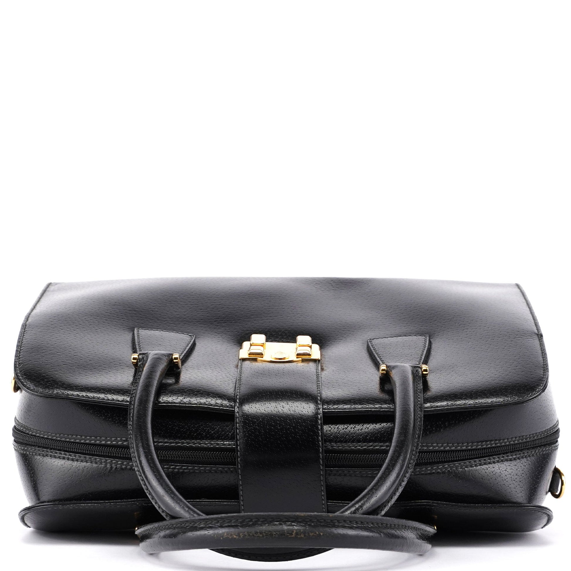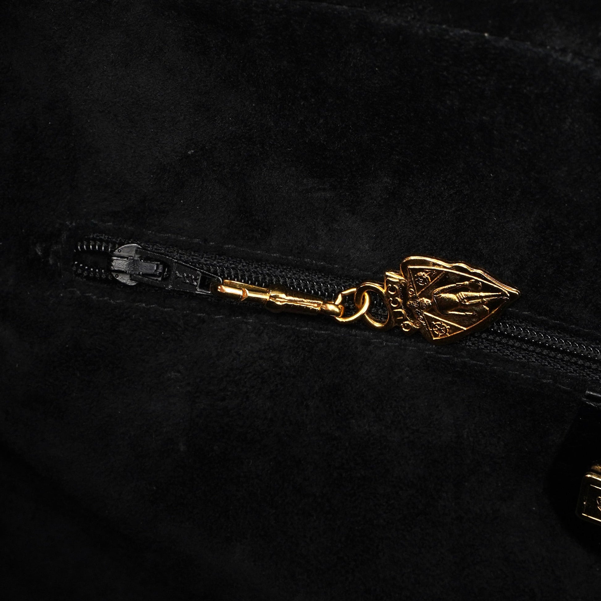 Designed in the early 1990s, the Gucci leather Boston bag is handcrafted from textured black leather and features gold-tone hardware engraved with the Gucci logo. It includes two attachments for a crossbody strap. The interior is lined in black suede with an interior zipper pocket, showcasing timeless elegance.