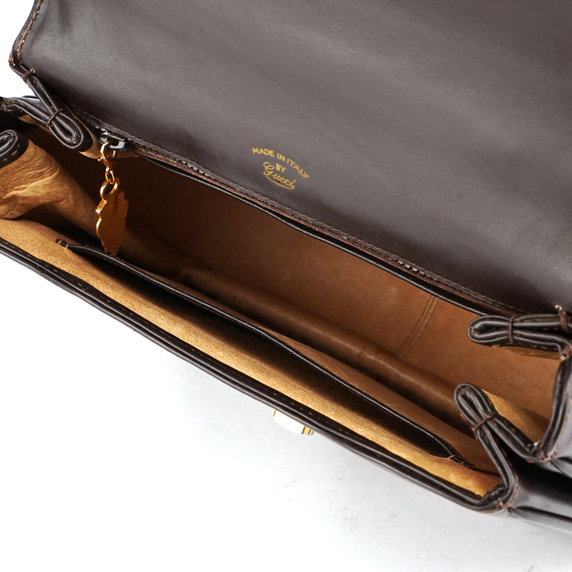 This incredibly rare vintage Gucci top handle bag, crafted from brown leather with gold-tone hardware, dates back to the early 1990s. It features a secure lock closure and a satin-lined interior with multiple pockets, including a zipper pocket for organized storage. This timeless and functional design stands out as a classic piece of Gucci’s heritage.