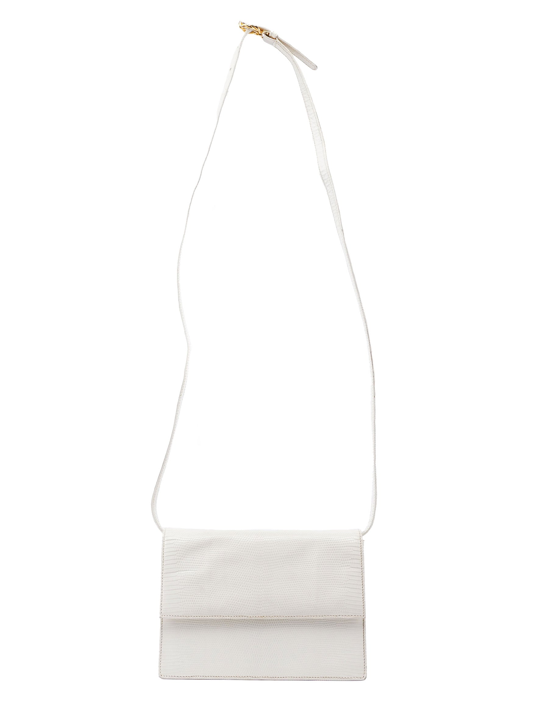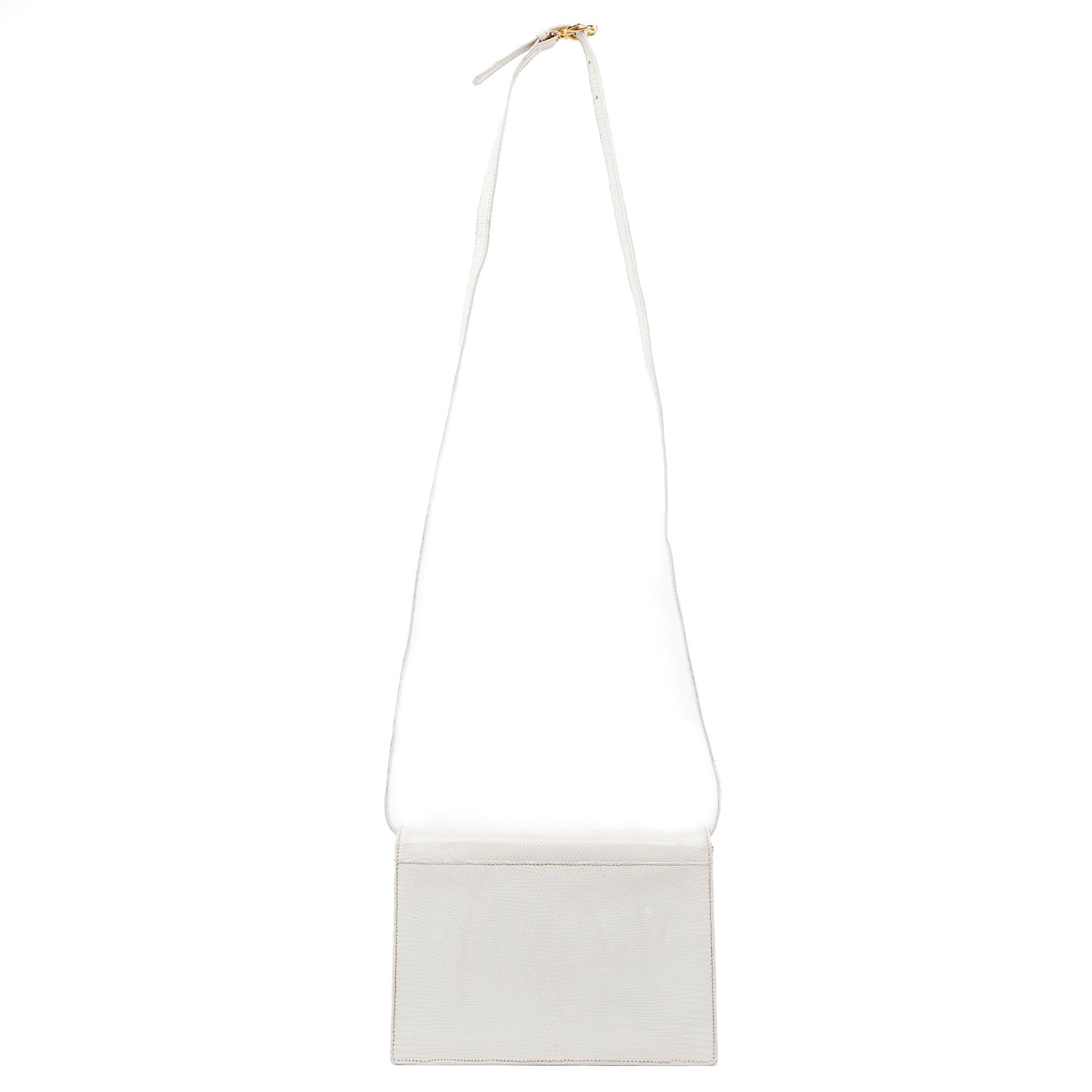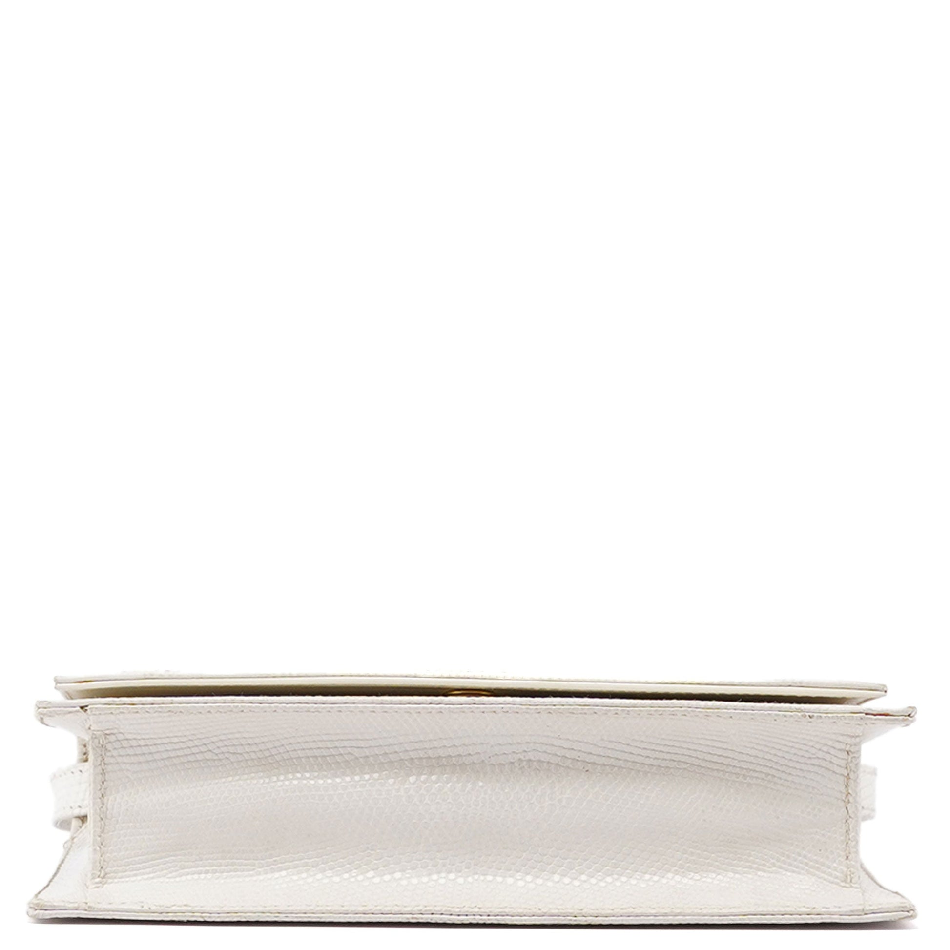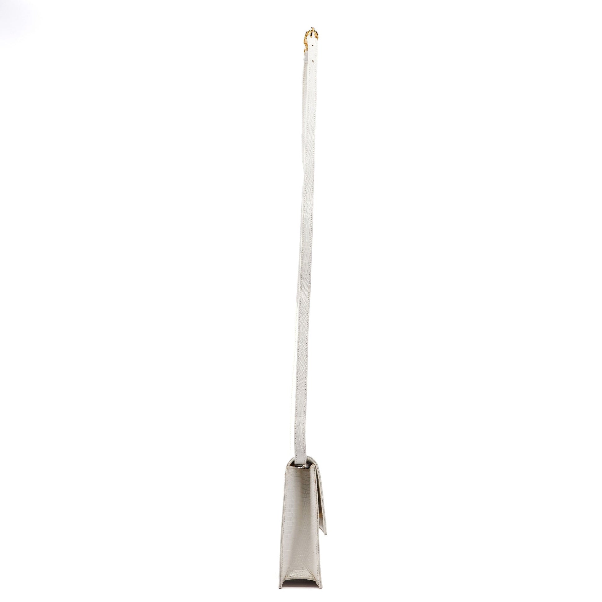Introducing the Gucci Lizard embossed bag, designed by Tom Ford in the mid 1990s. Crafted from white embossed leather with gold-tone hardware, it features a magnetic closure for ease of use. The calfskin-lined interior includes a zipper pocket for organization, with a Gucci GG logo plate under the flap closure adding a touch of sophistication.