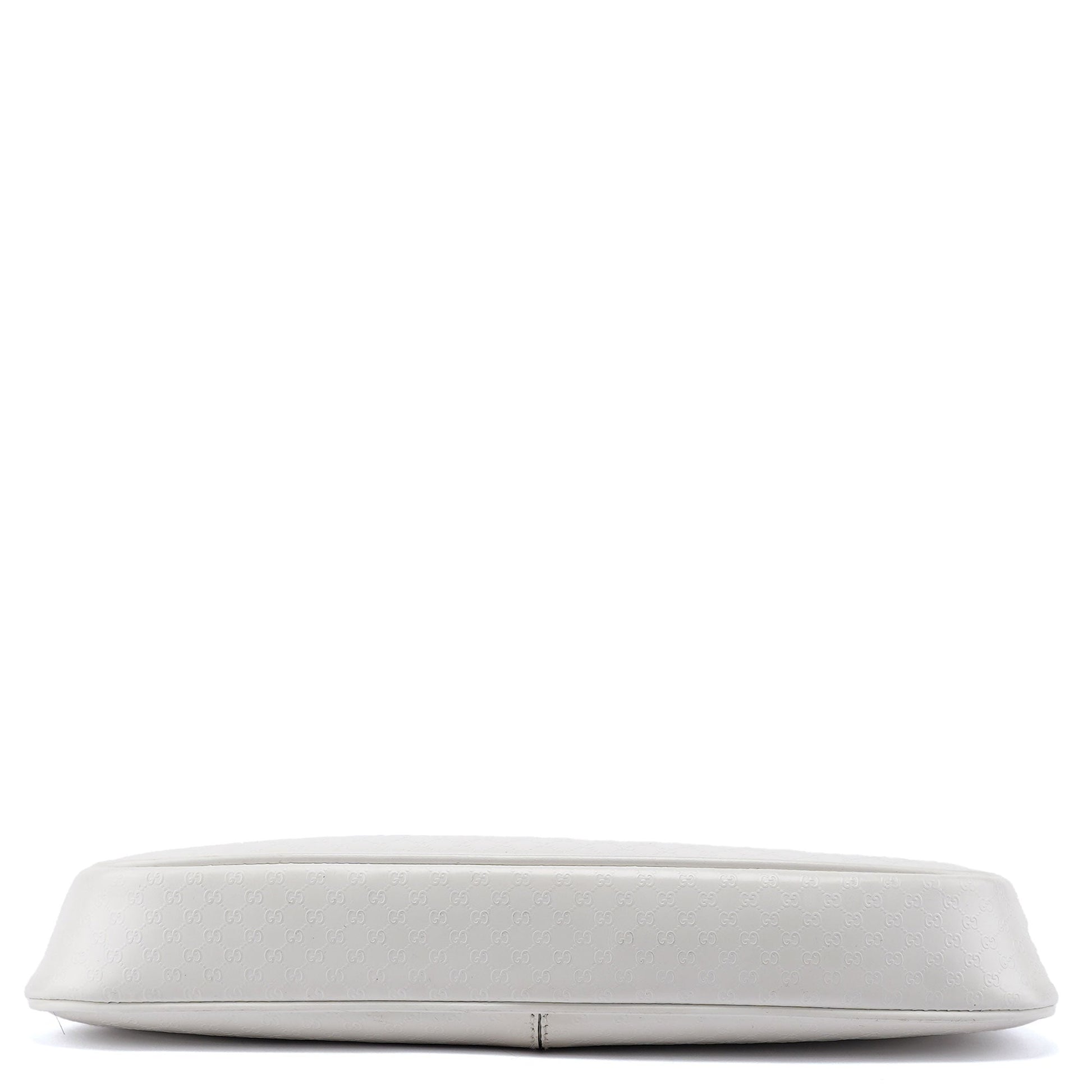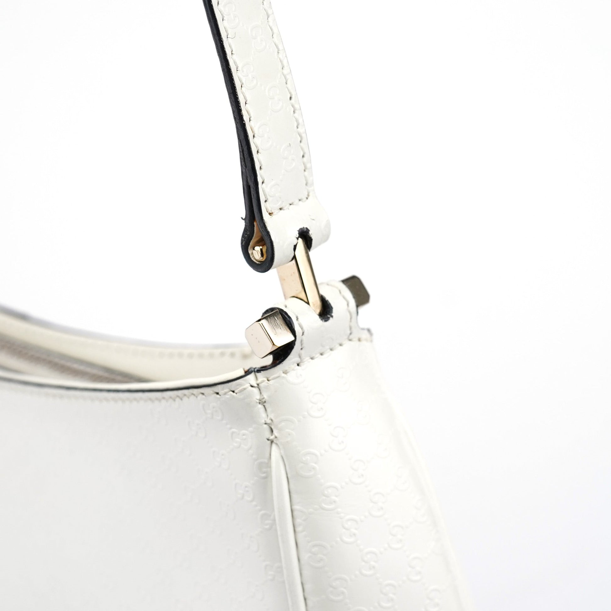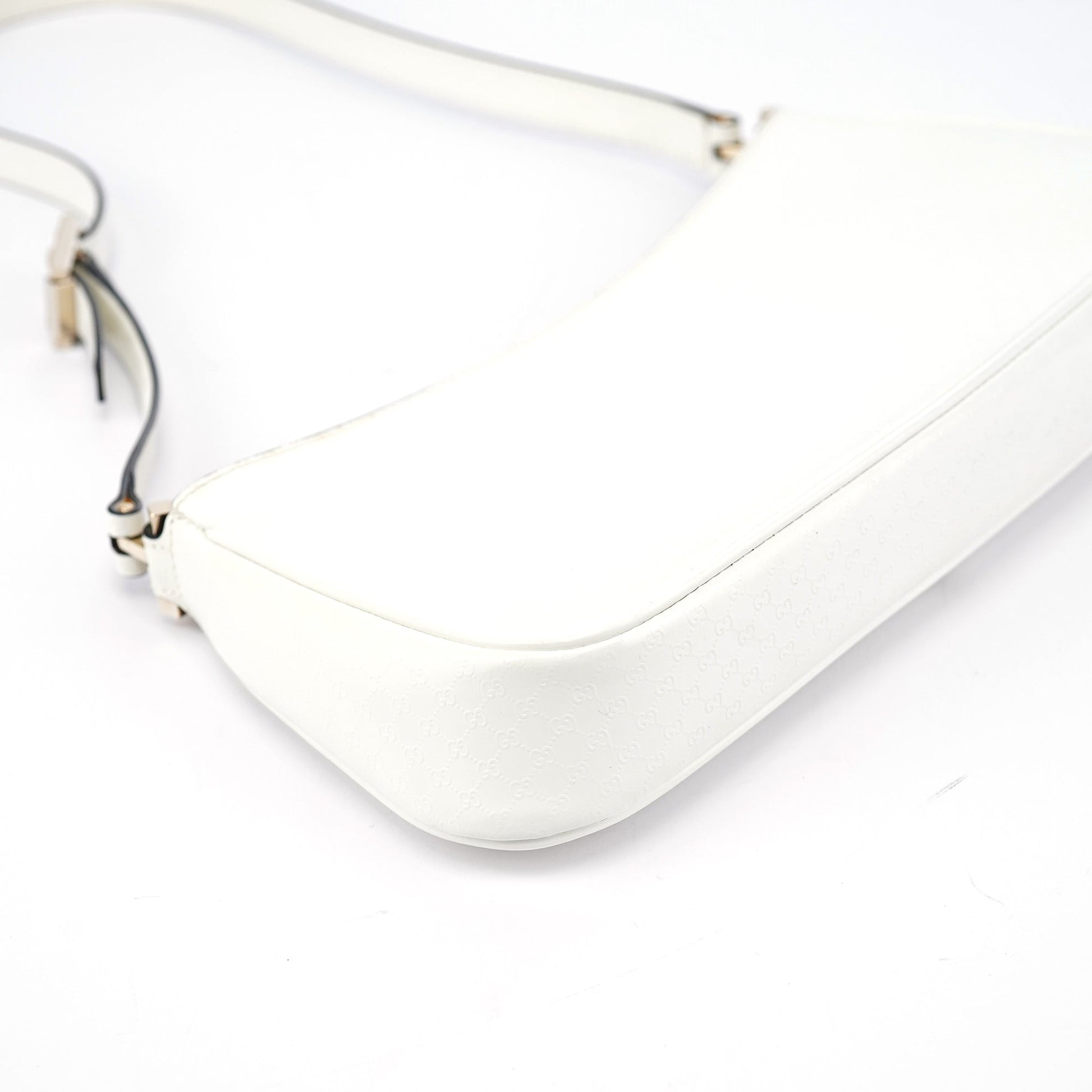 Designed by Tom Ford in the late 1990s, the Gucci GG mini hobo bag showcases a white GG monogram embossed leather. Its gold-tone hardware accents add a touch of elegance. Lined with satin, it features a small interior pocket for essentials.