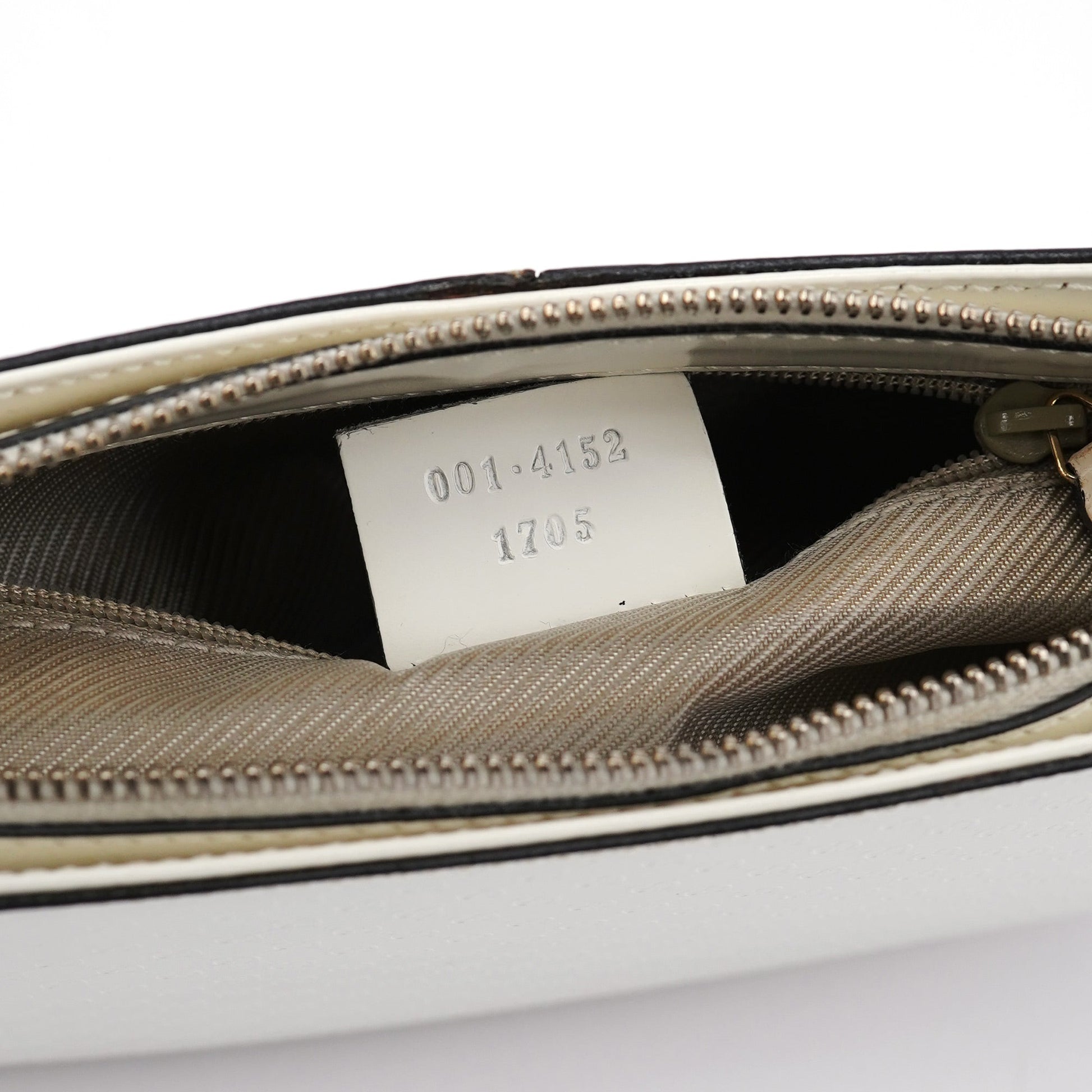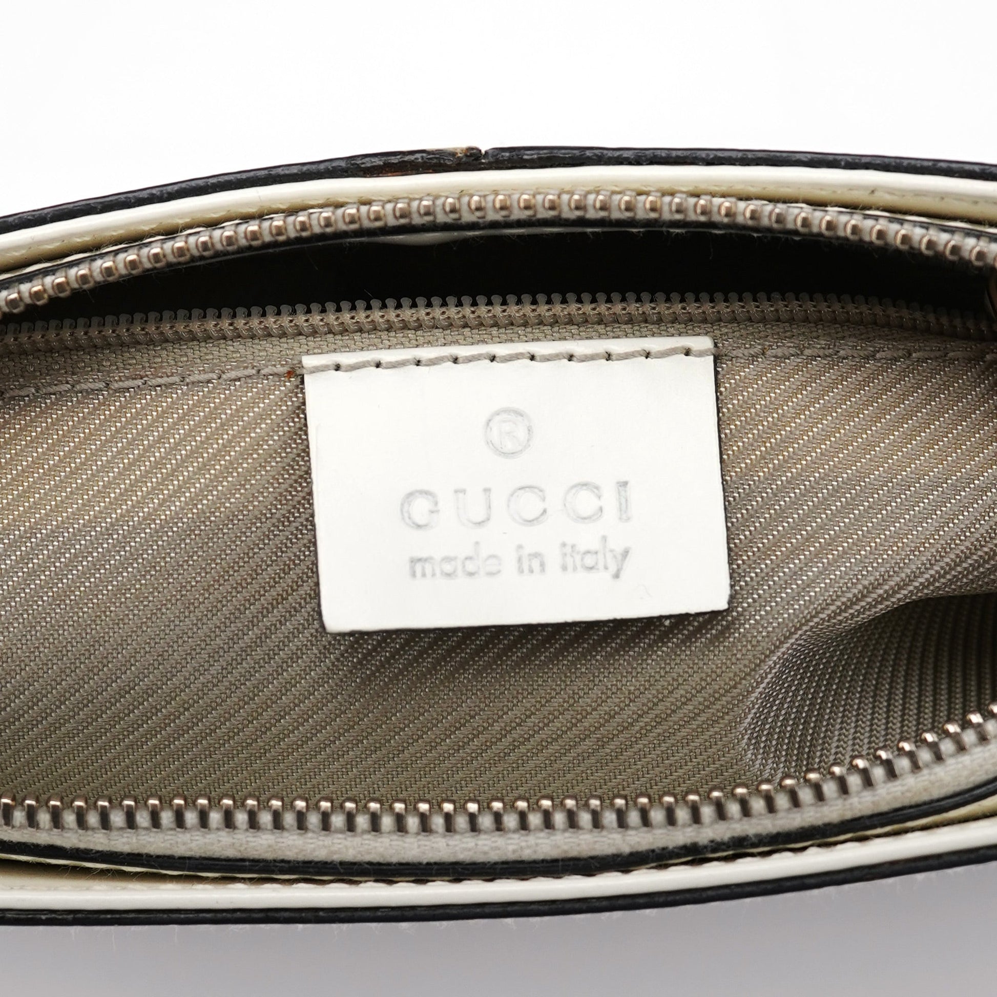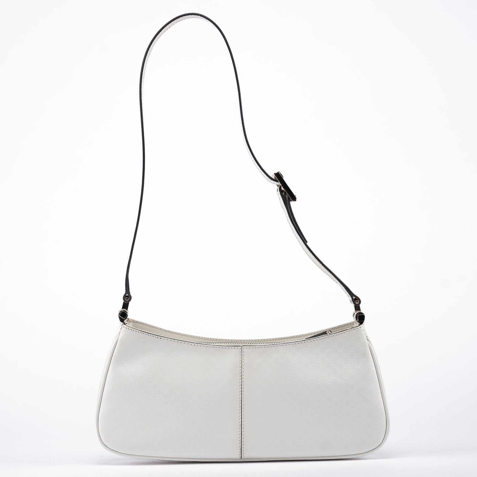 Designed by Tom Ford in the late 1990s, the Gucci GG mini hobo bag showcases a white GG monogram embossed leather. Its gold-tone hardware accents add a touch of elegance. Lined with satin, it features a small interior pocket for essentials.