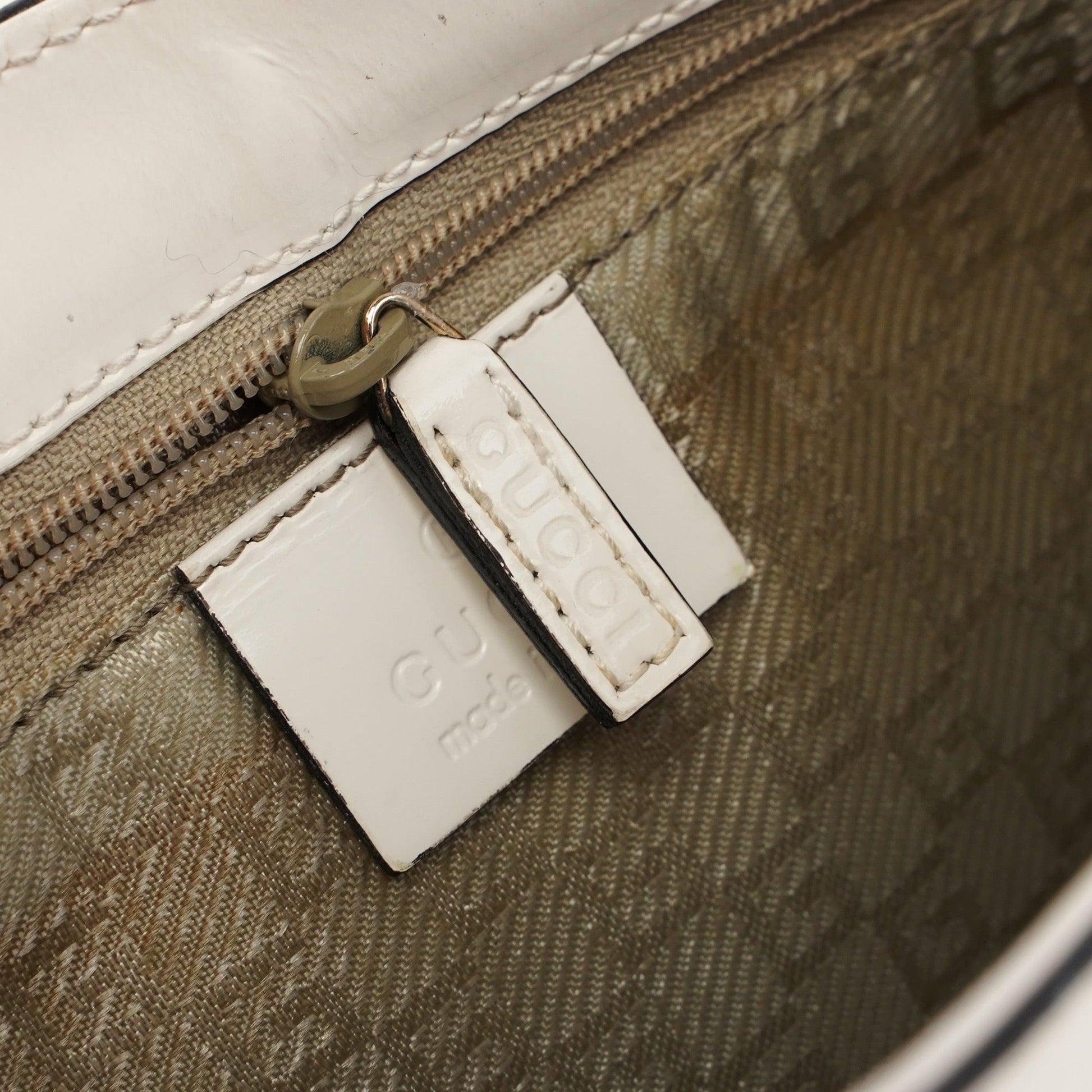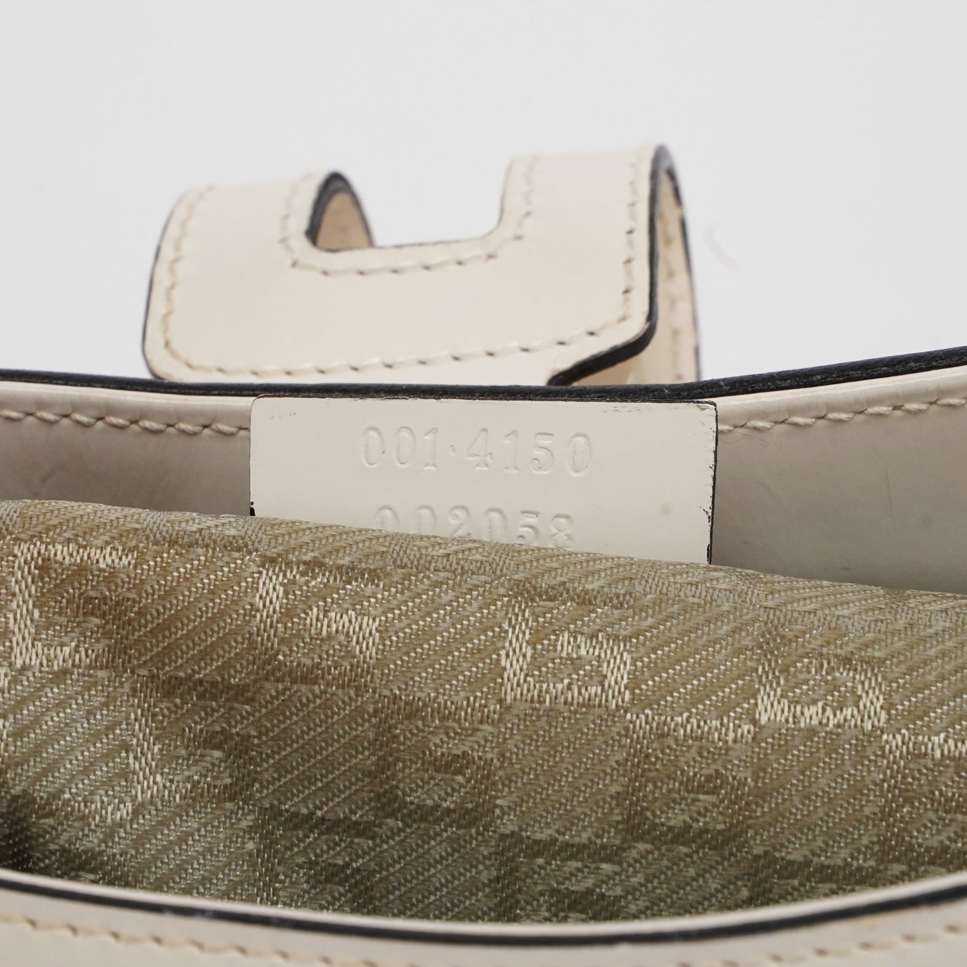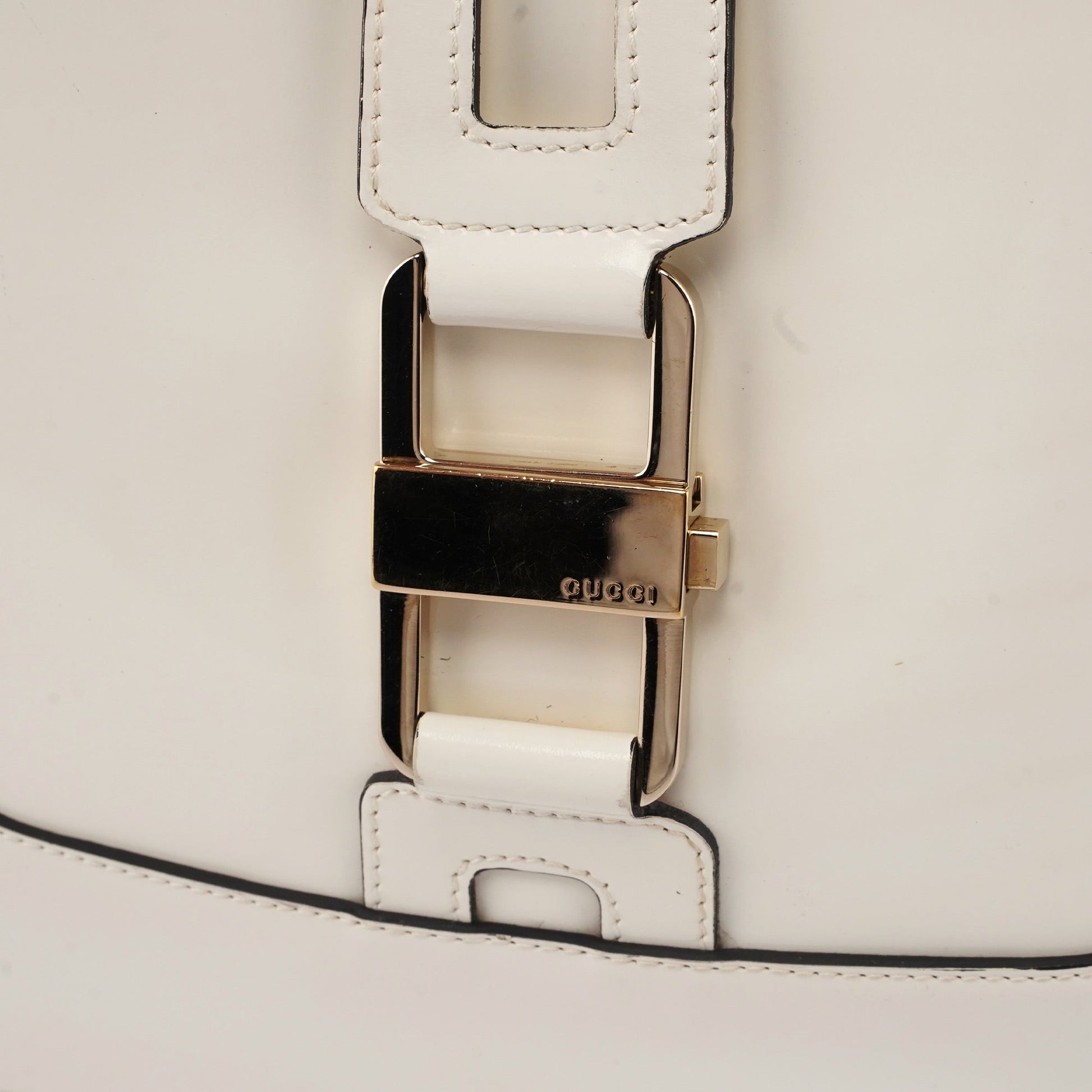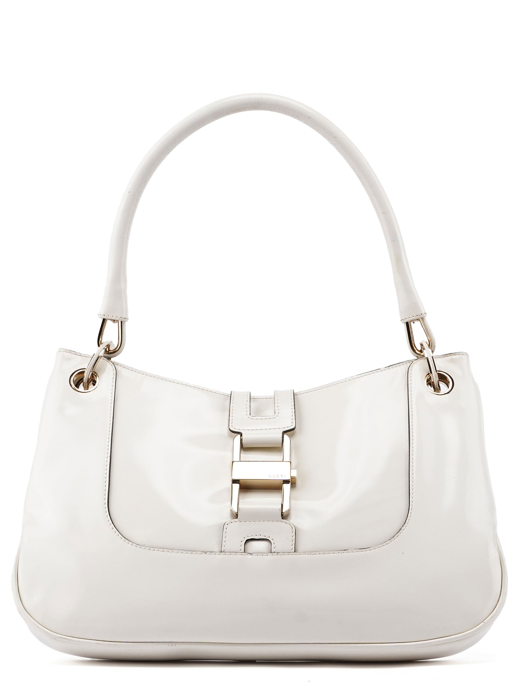 Designed by Tom Ford in the late 1990s, the Gucci Jackie shoulder bag exudes sophistication. Made from white patent leather with gold-tone hardware engraved with the iconic Gucci logo, it features the signature Jackie clasp closure. Inside, the satin-lined interior offers practicality with a convenient interior zipper pocket.