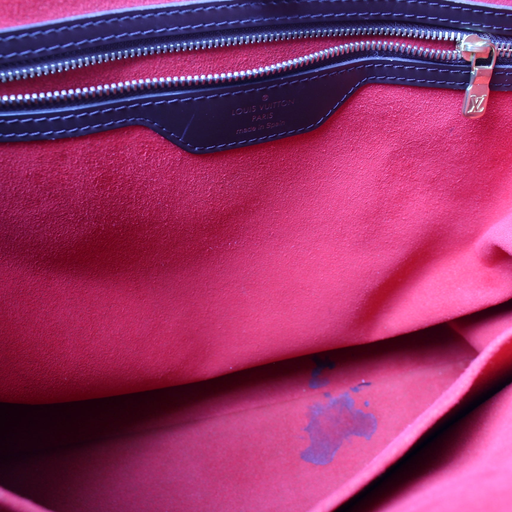Interior: The interior has a large stain on the bottom, and is free of rips or tears. The interior features two open pockets and one zip closure pocket.