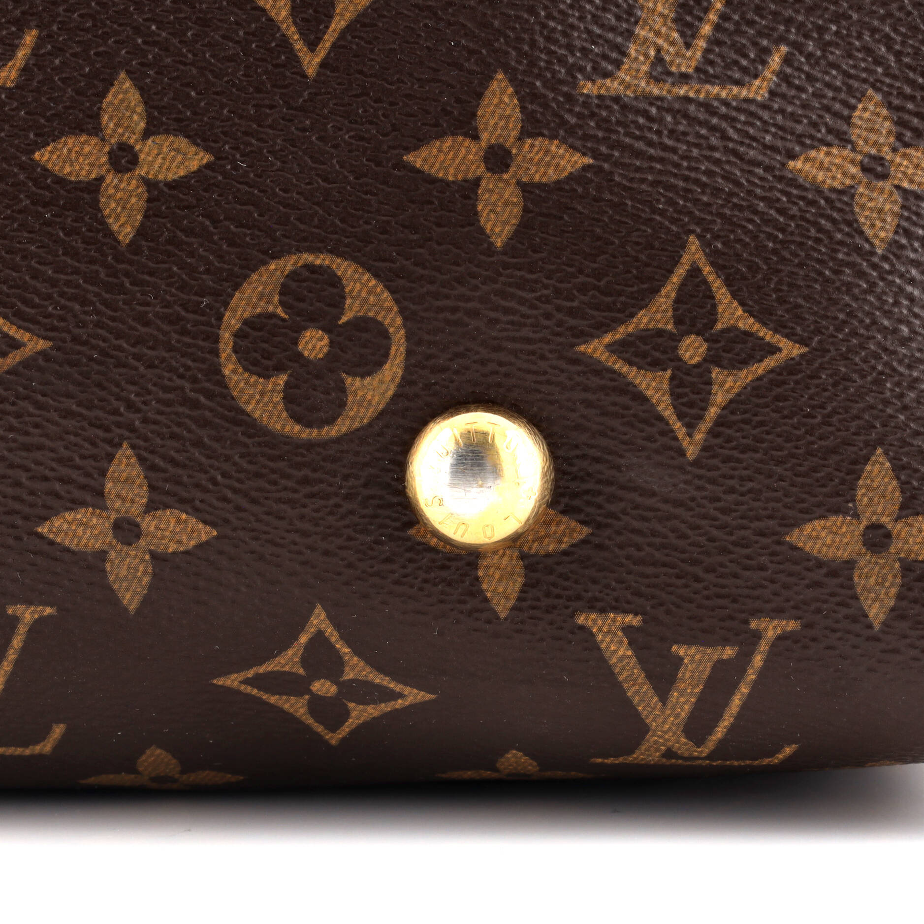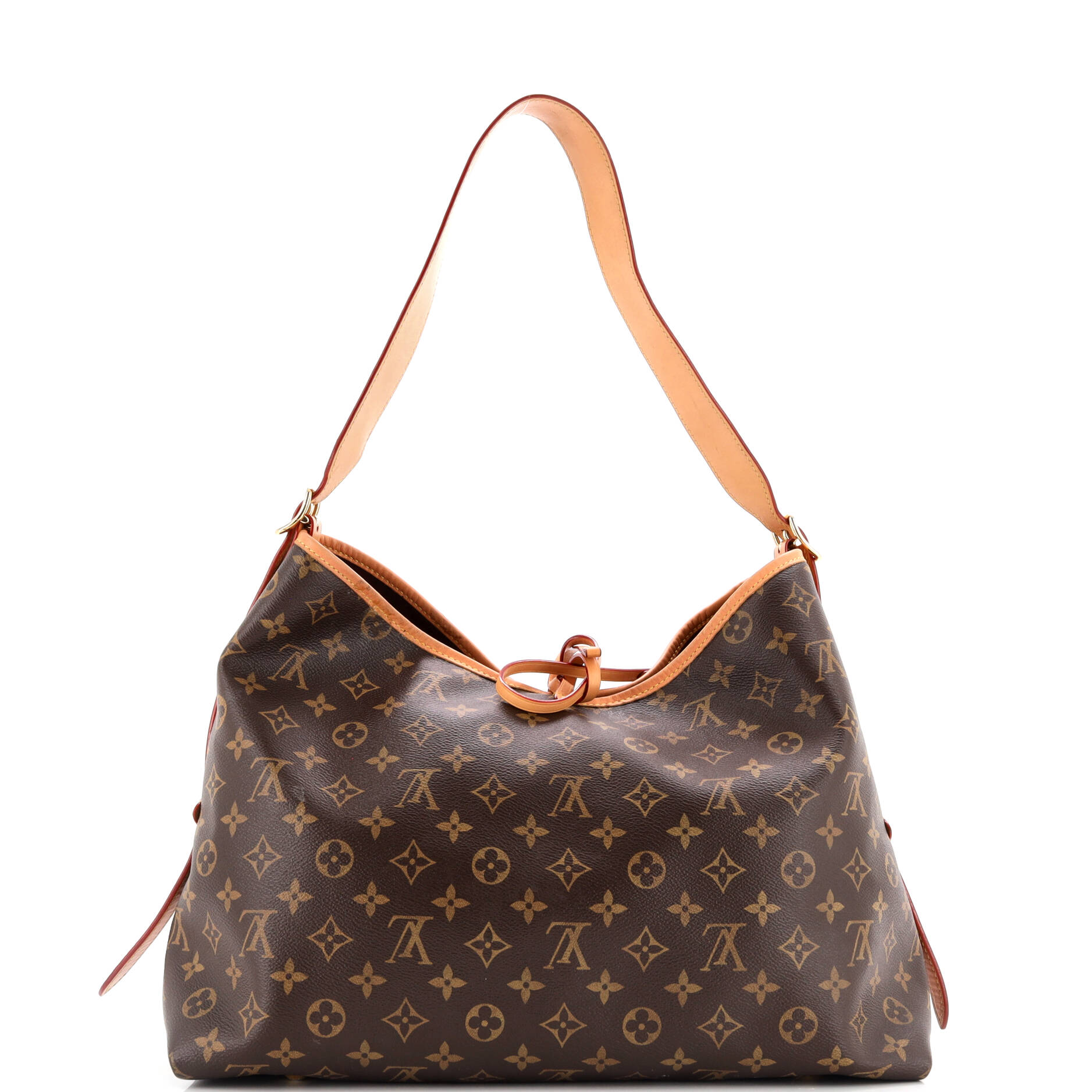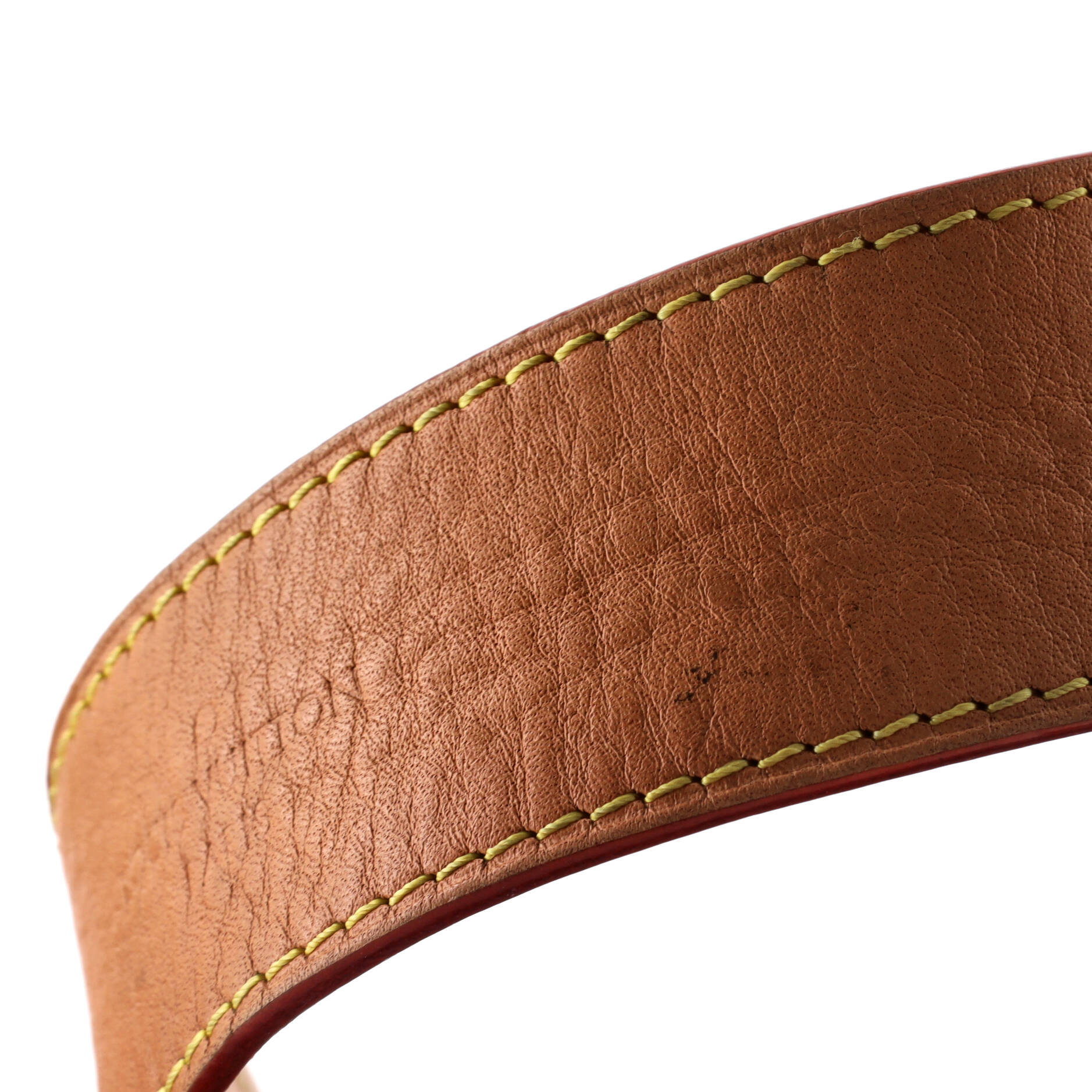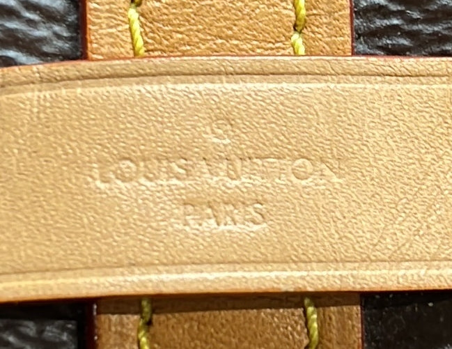 Condition: Good. Exterior: heavy glue stain on back, discoloration, scuffs, creases | Handles/Straps: creases, scuffs, discoloration | Interior: scuffs, perfume odor, minor discoloration | Hardware: scratches, minor tarnished