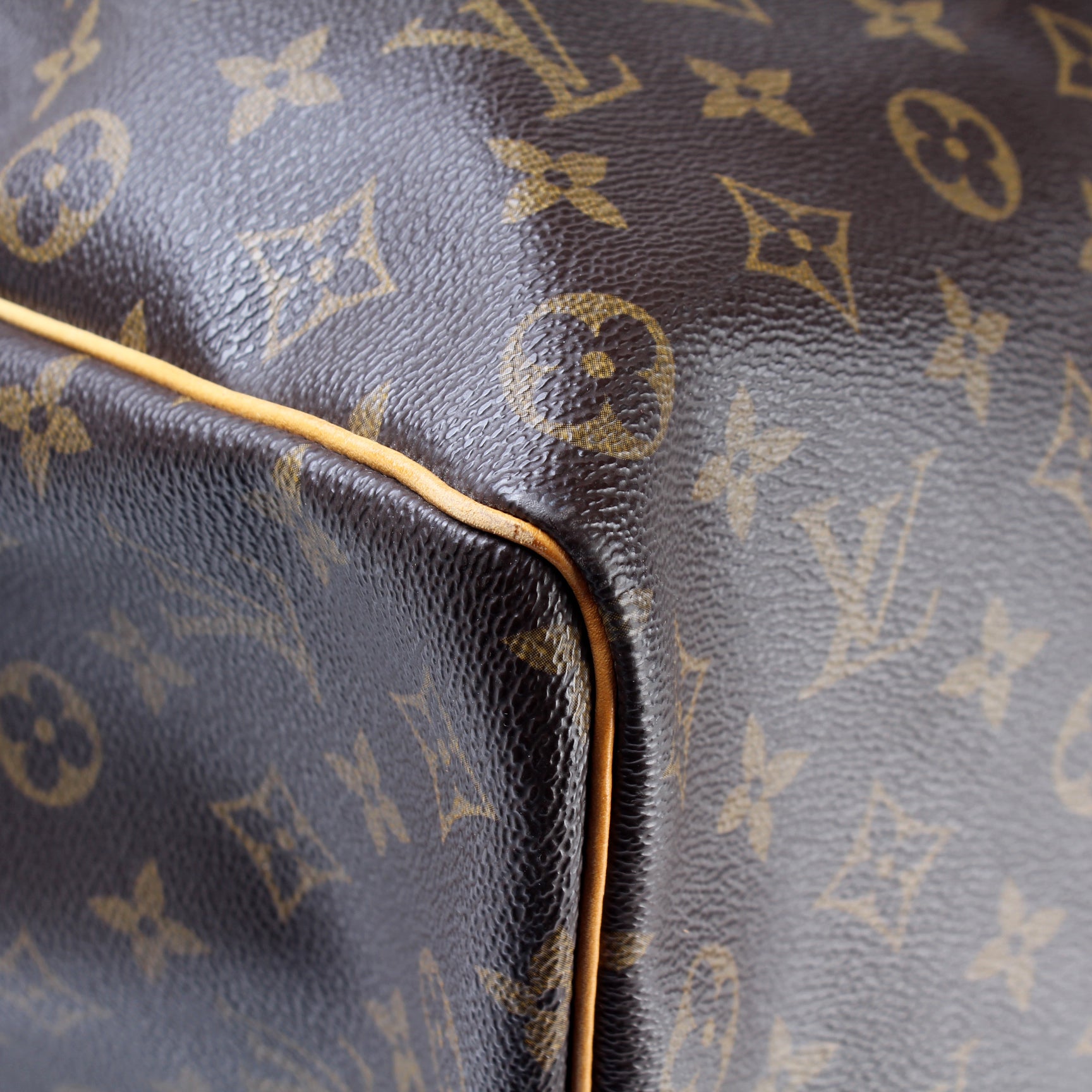 Exterior: The exterior coated canvas is free from major signs of wear. The leather details show minor wear and discoloration throughout.