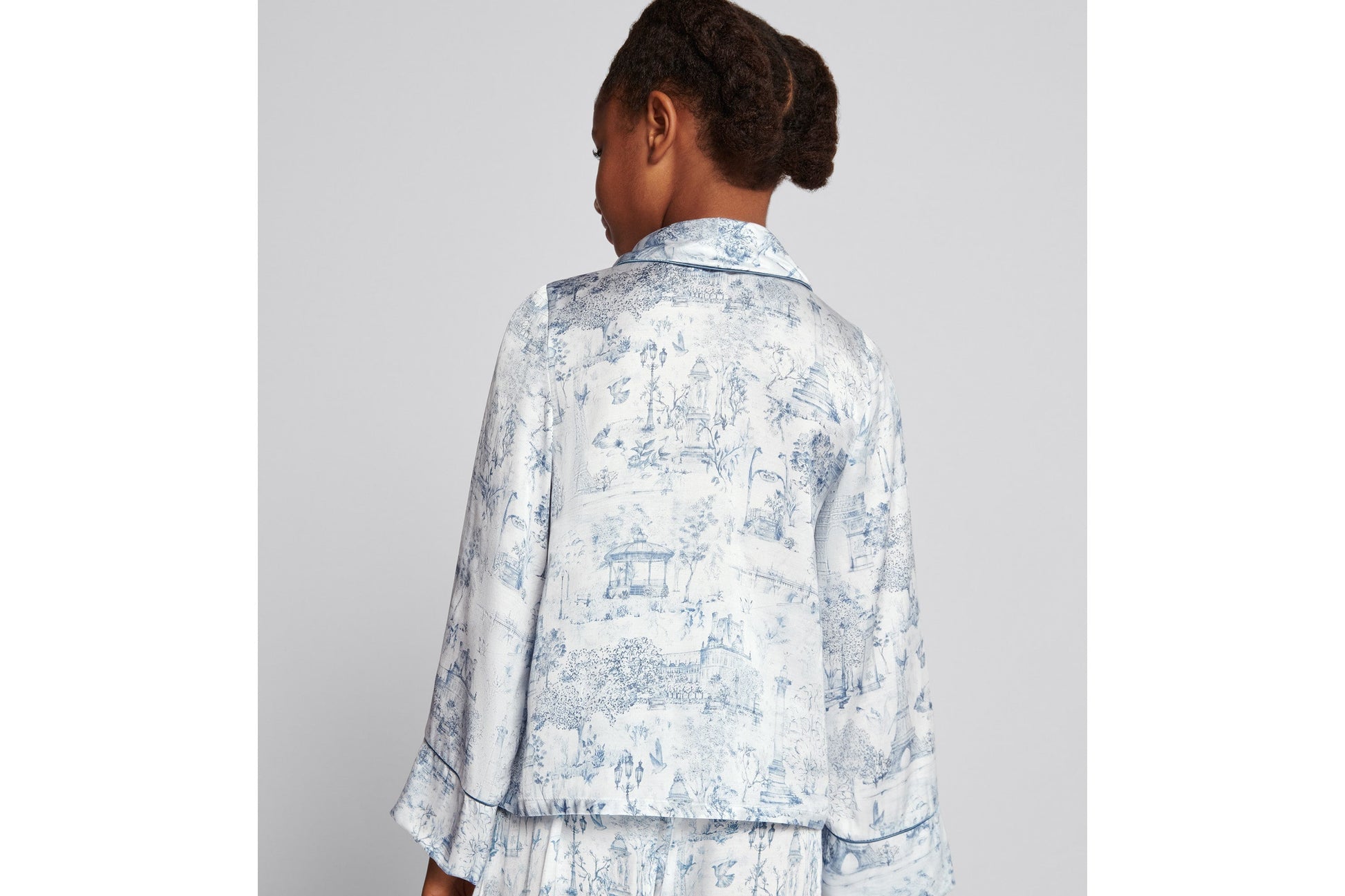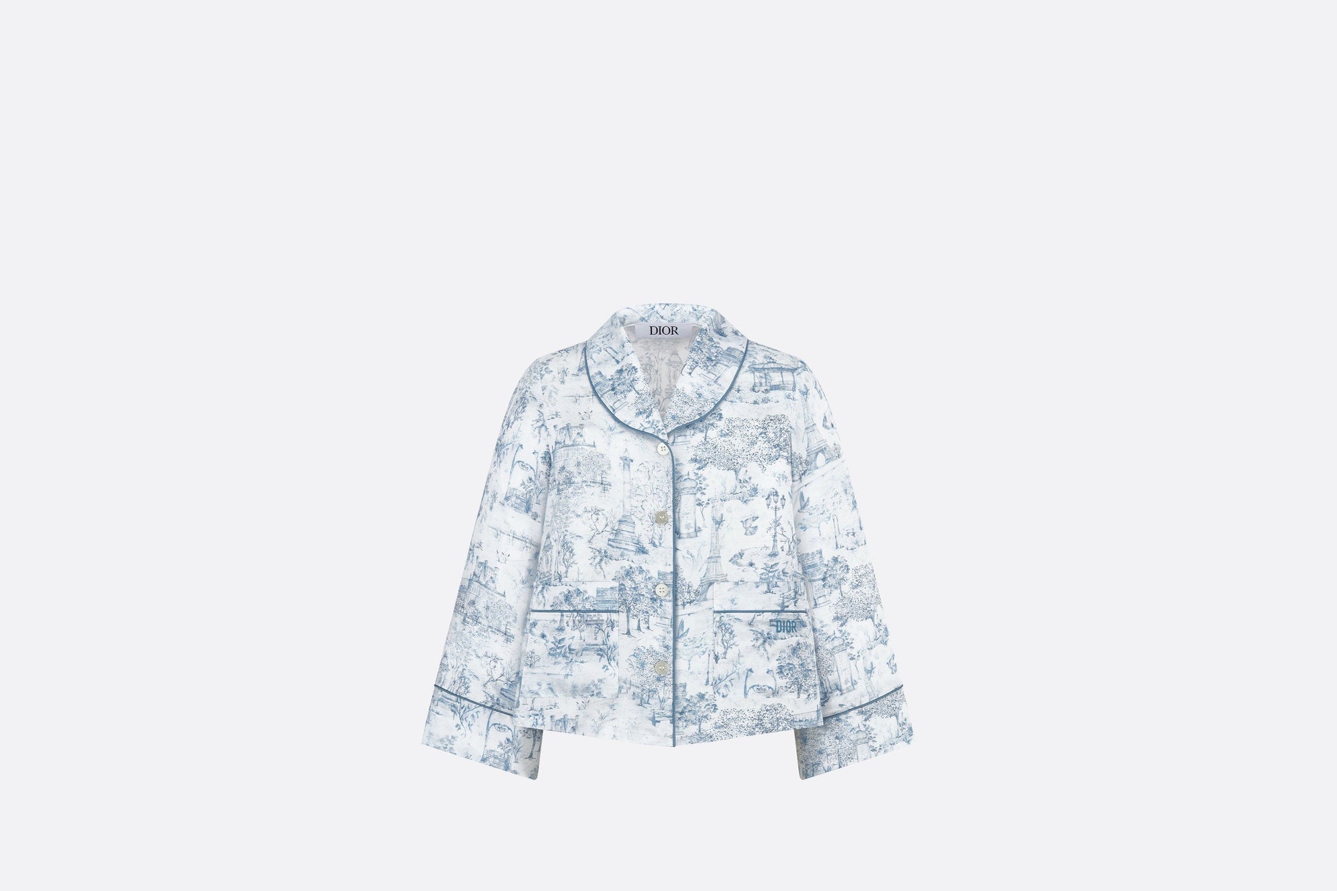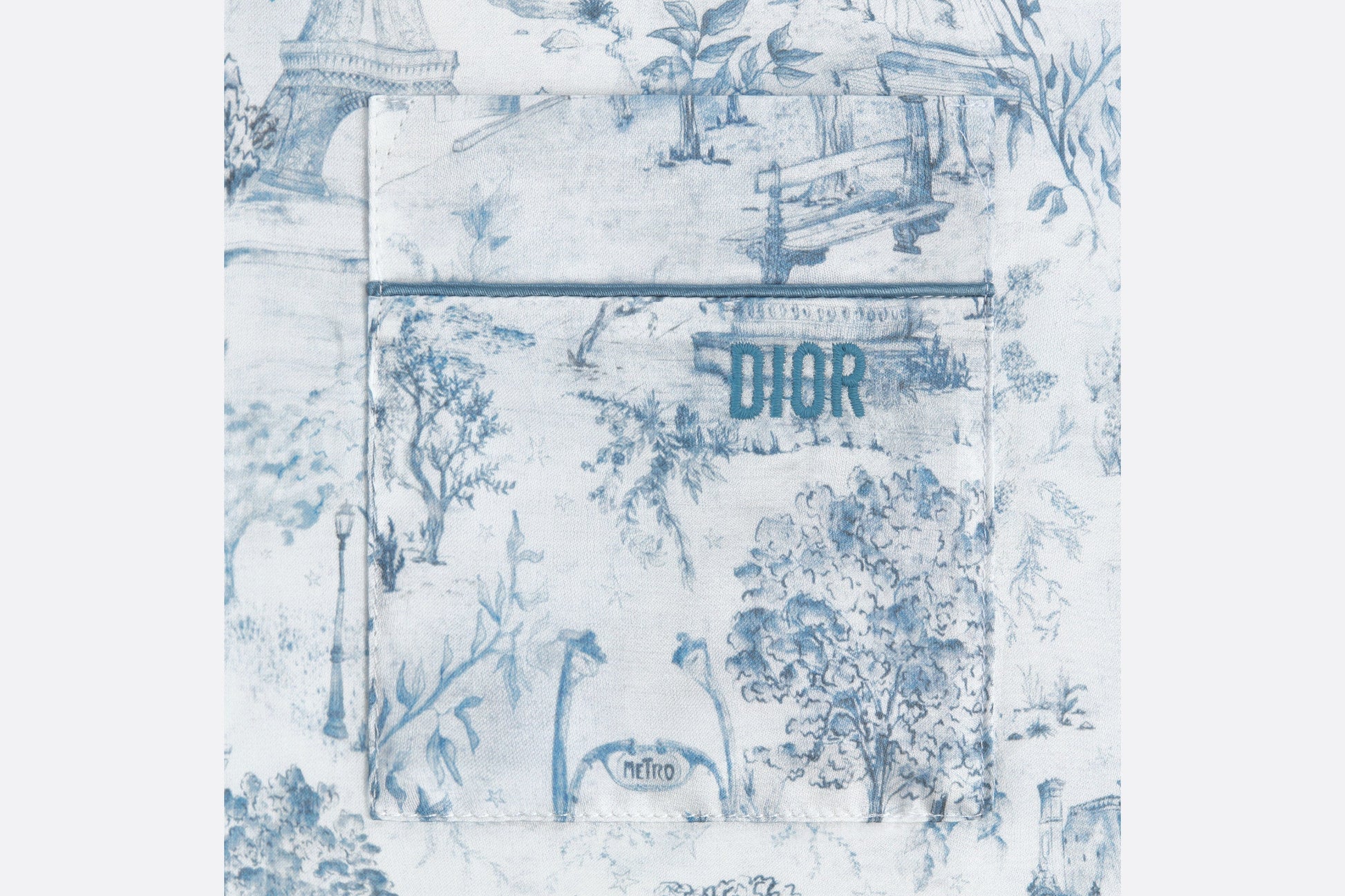 The shirt is adorned with the blue Toile de Jouy Paris motif, revisiting hallmark House codes in an urban variation. Crafted in ivory satin-finish voile with an all-over print, it is accented by a refined shawl collar, patch pockets and an ivory button closure on the front. Enhanced by a Dior embroidery and contrasting trim, the shirt can be styled with the matching pants from the collection to complete the look.