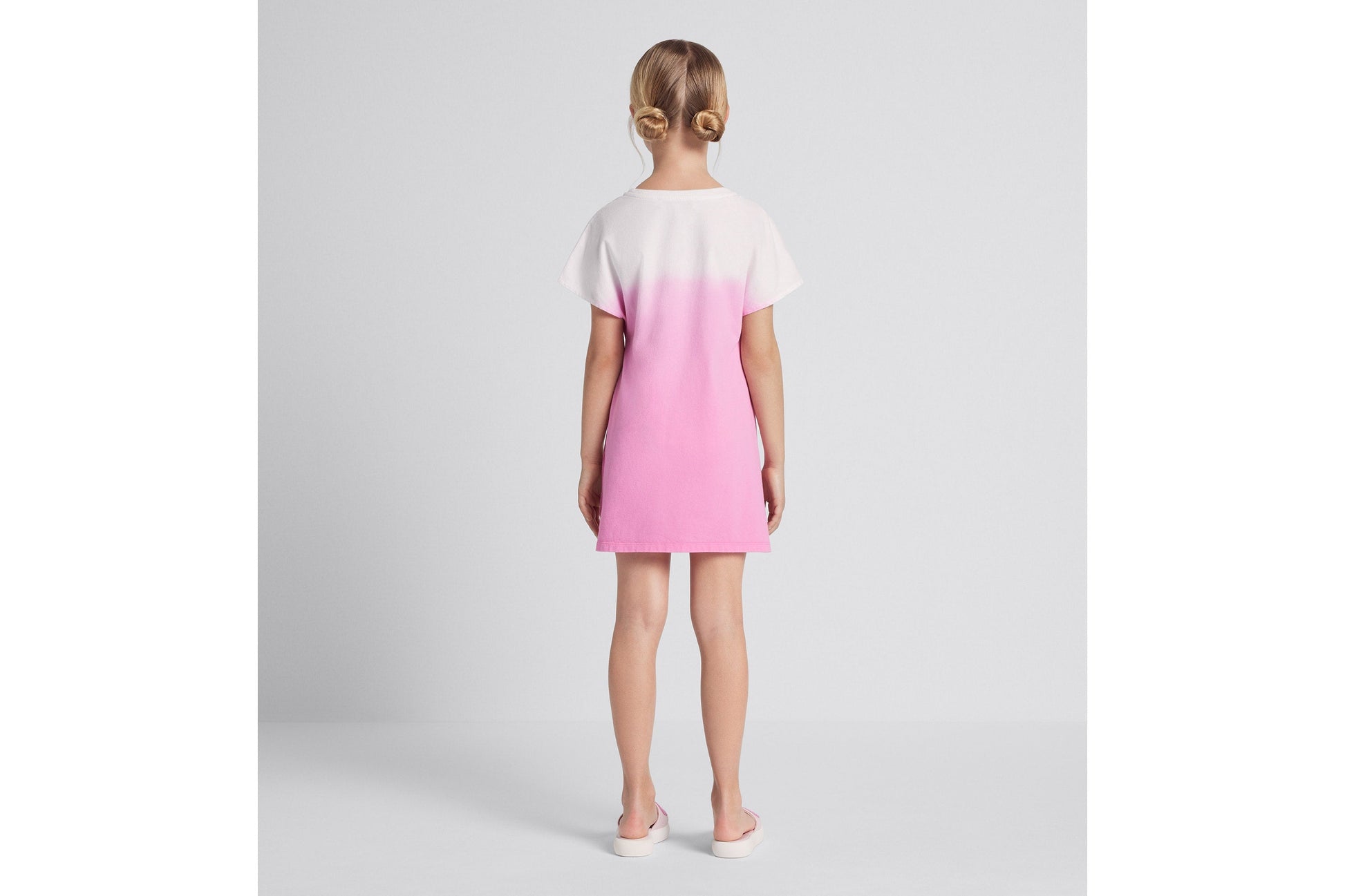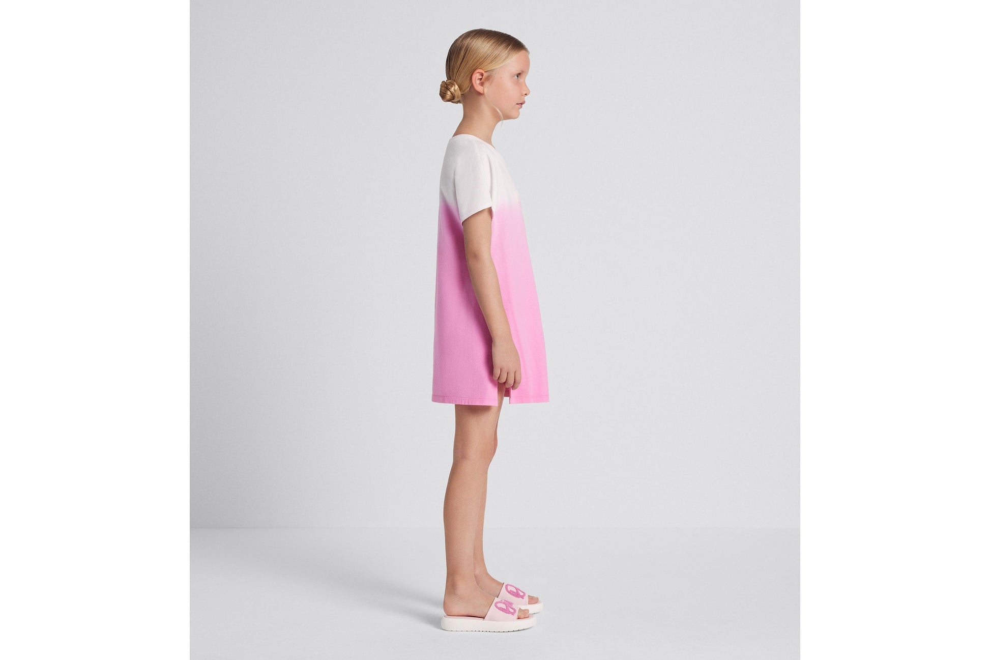 The dress, crafted in cotton jersey, is enhanced by an ivory and pop pink dip-dye print. Its straight cut with dropped shoulders is adorned with a tonal bouclé Dior signature on the front. The dress can complete a relaxed look when worn with a pair of sandals from the collection.