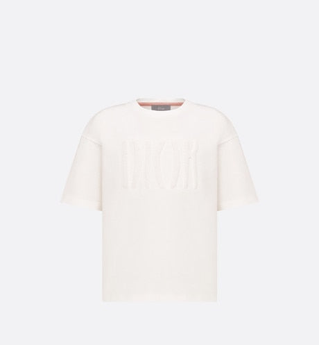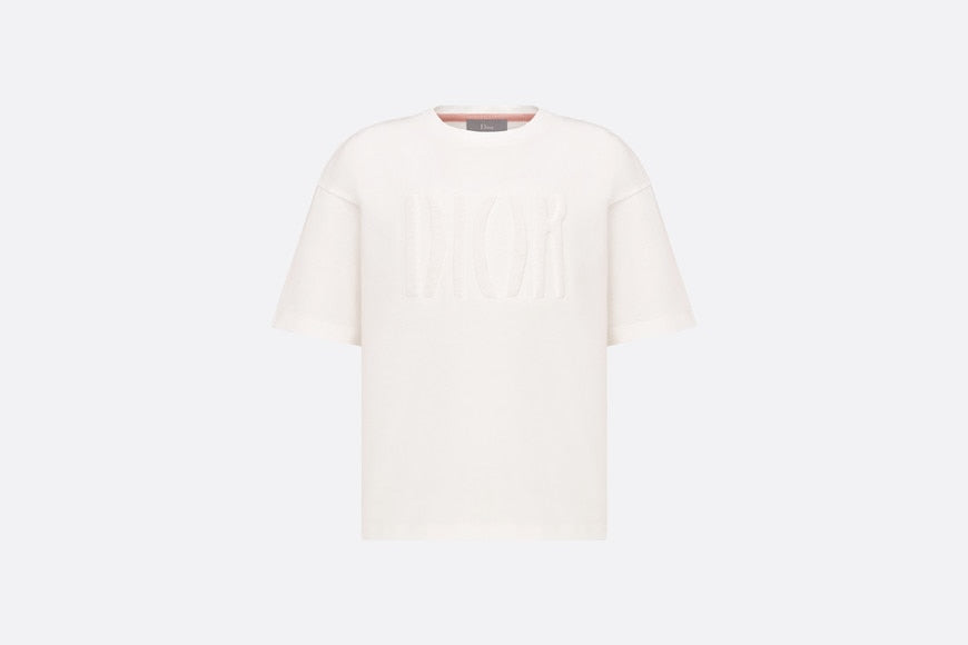 The T-shirt pays homage to House heritage with the tonal embossed 'DIOR' signature inspired by the archives. Crafted in ivory cotton jersey, it features a ribbed round neck as well as low arm holes for added comfort. A pink chevron braid detail embellishes the inside of the neck. The modern T-shirt will pair easily with jeans or shorts from the collection.