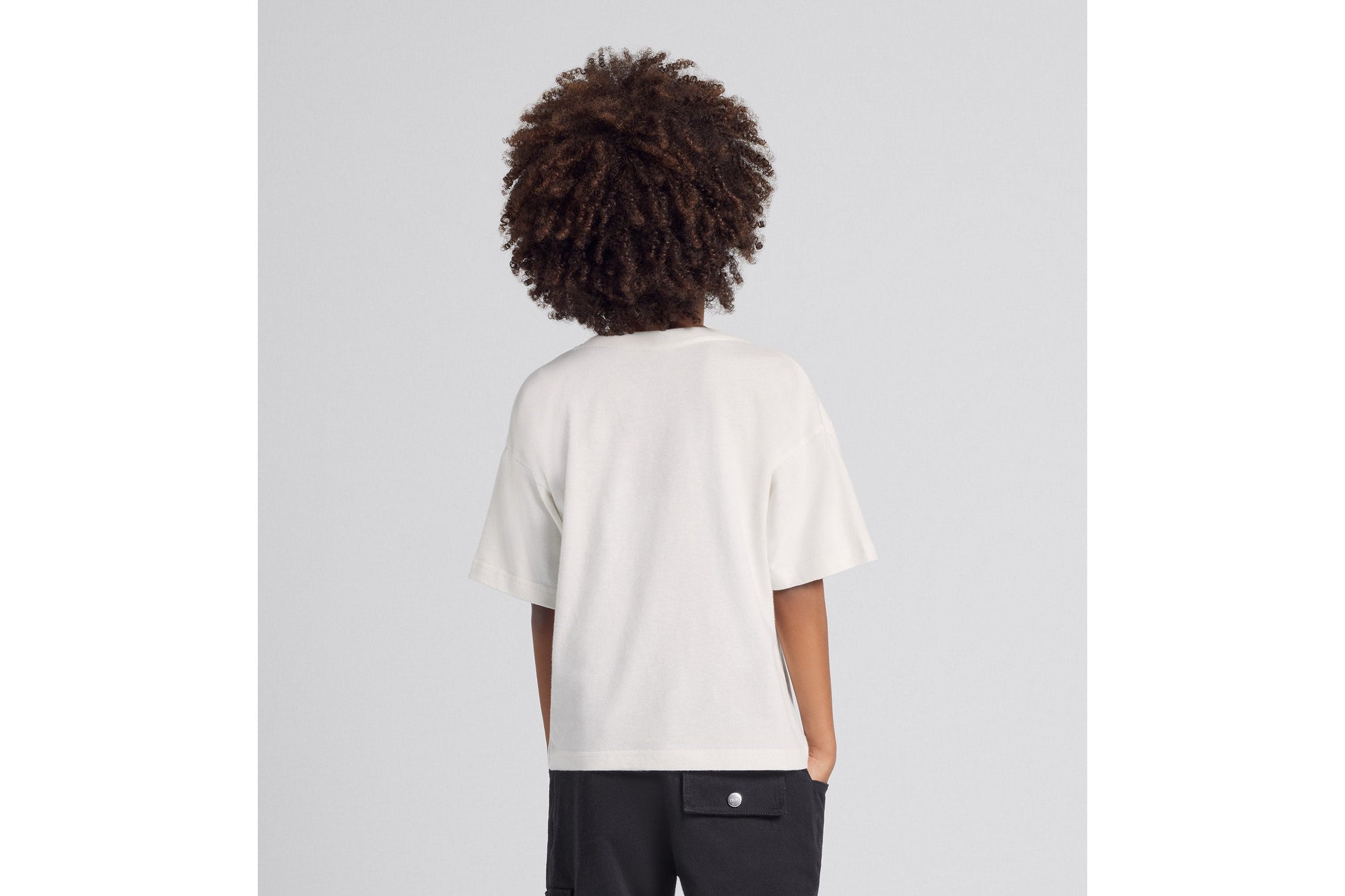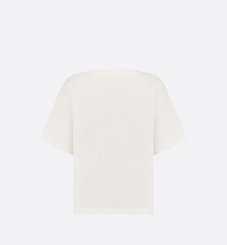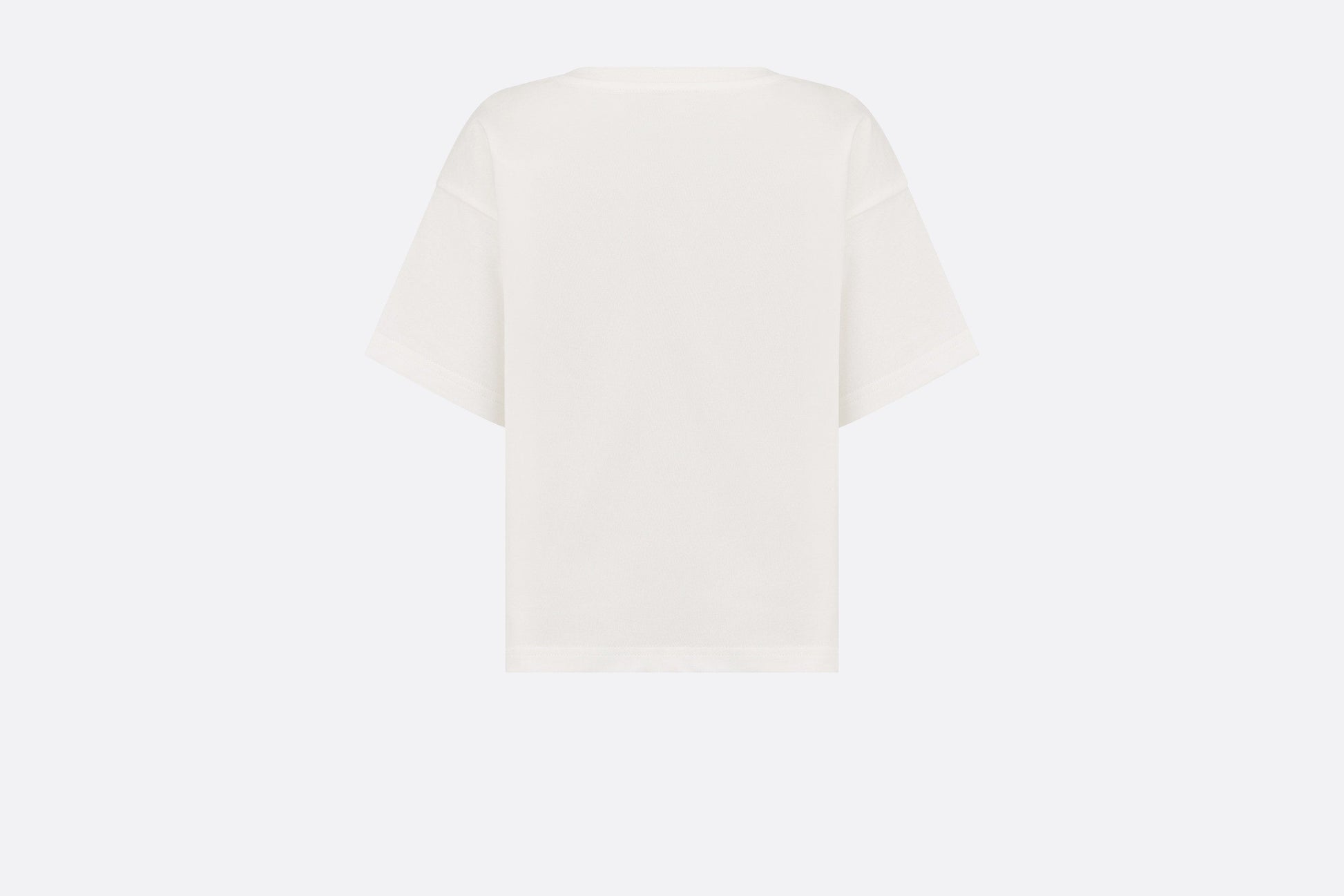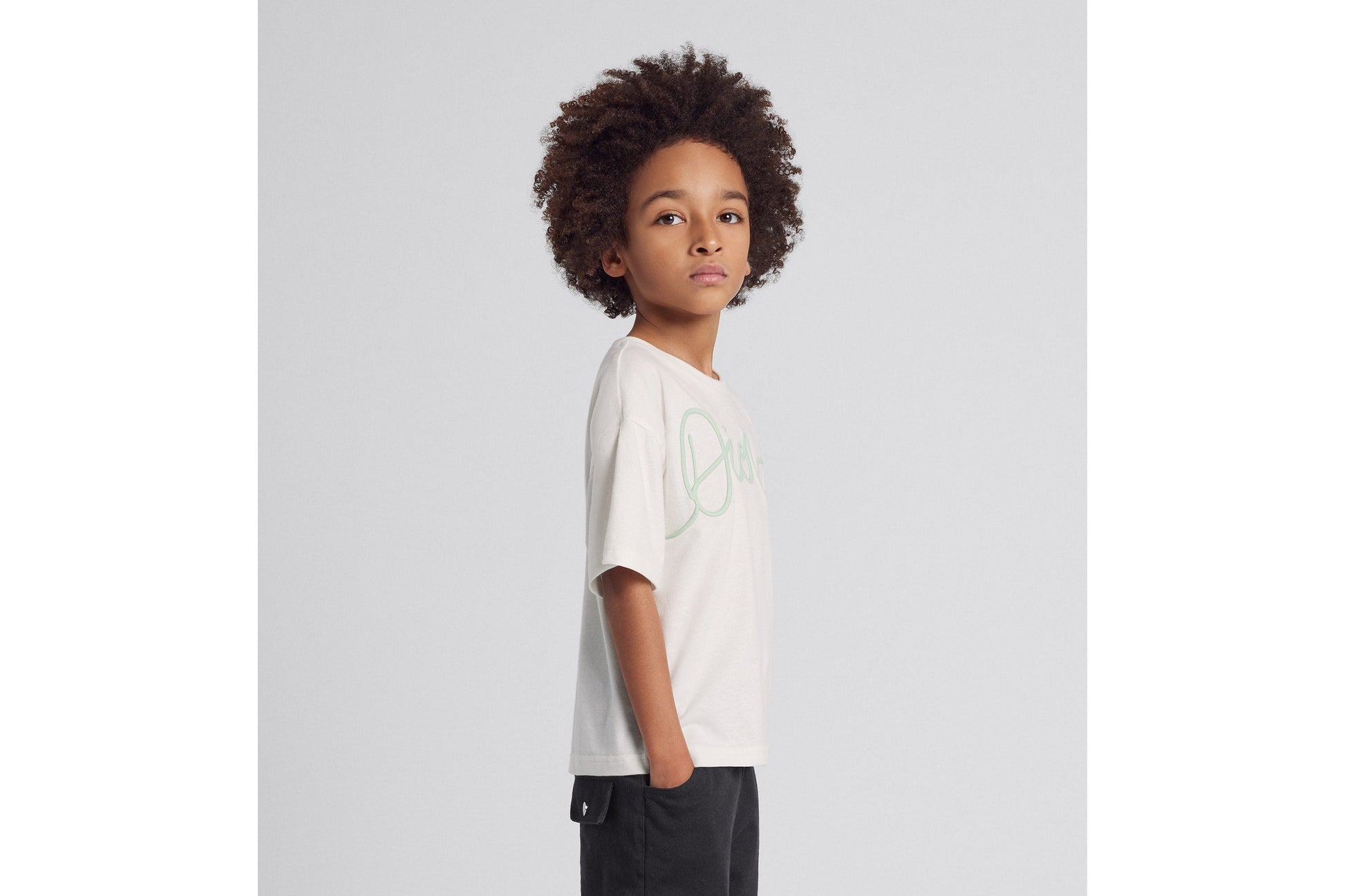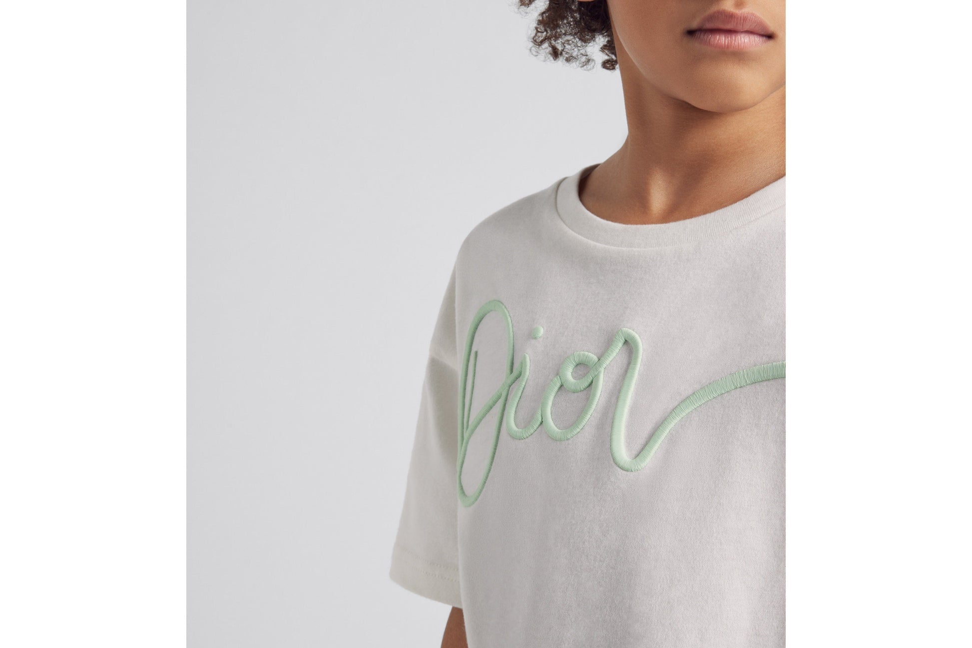 The T-shirt stands out with a graphic look. Crafted in ivory cotton jersey, it is embellished with a mint green reimagined Dior embroidery on the front. Featuring a crew neck and comfortable cut with dropped shoulders, the T-shirt can be worn with pants from the collection for a casual and playful look.
