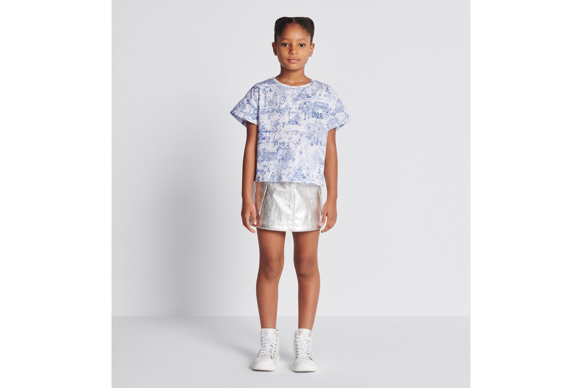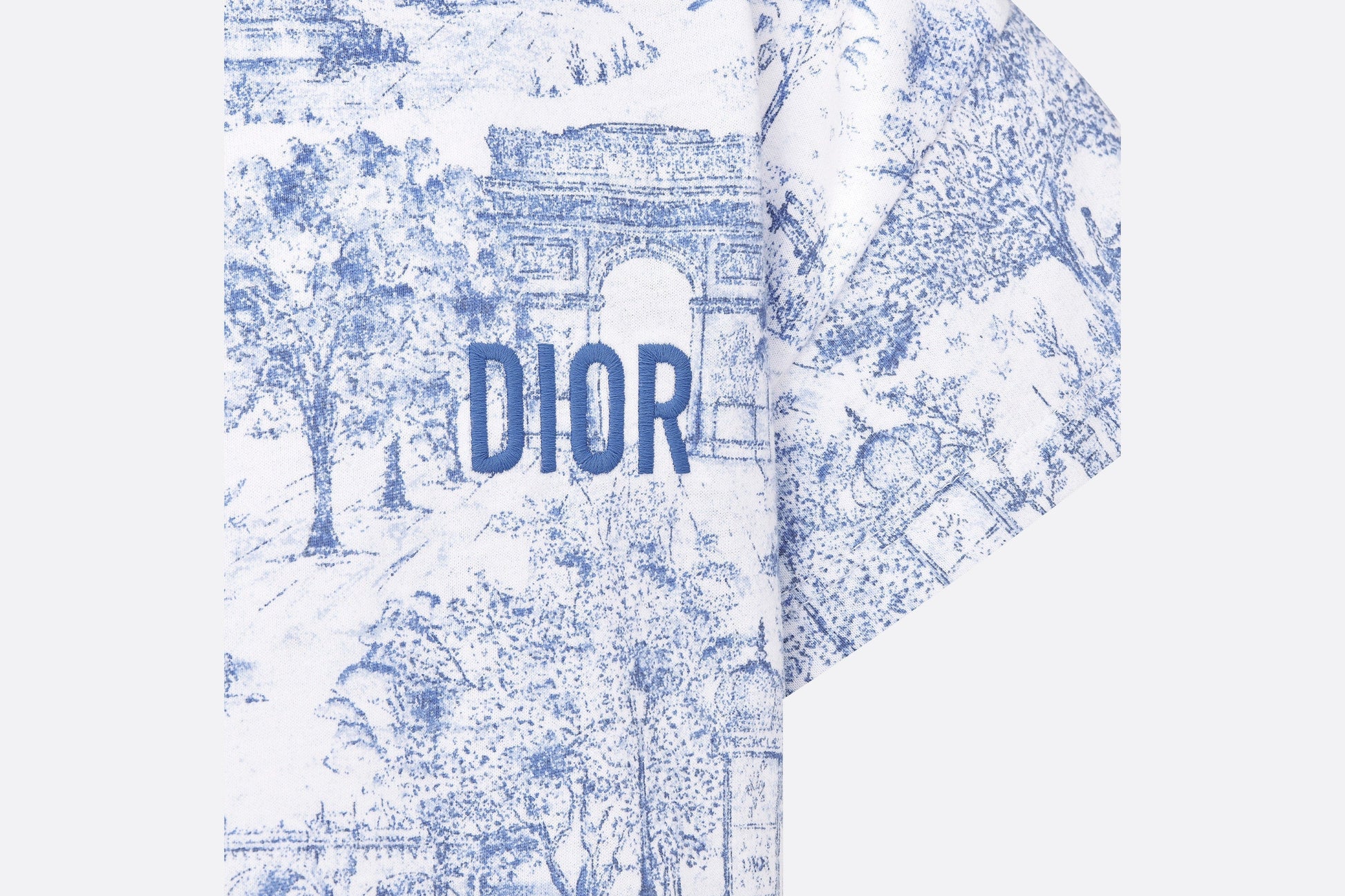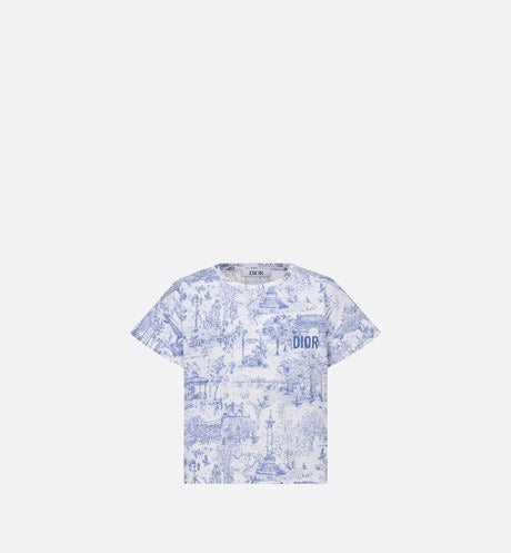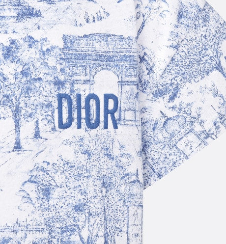 The T-shirt is adorned with the blue Toile de Jouy Paris motif, revisiting hallmark House codes in an urban variation. Crafted in ivory cotton jersey with the all-over print, it is embellished with a crew neck and blue Dior embroidery on the front. The T-shirt can be coordinated with the matching skirt to complete a cheerful look.
