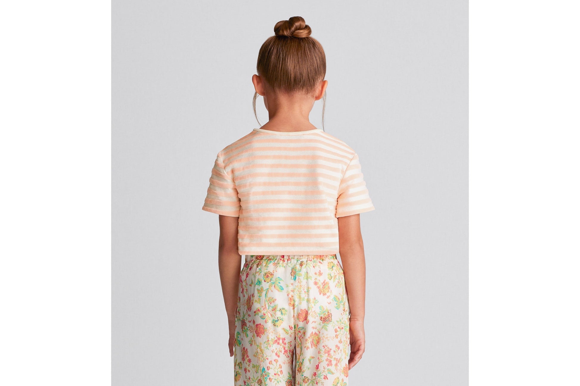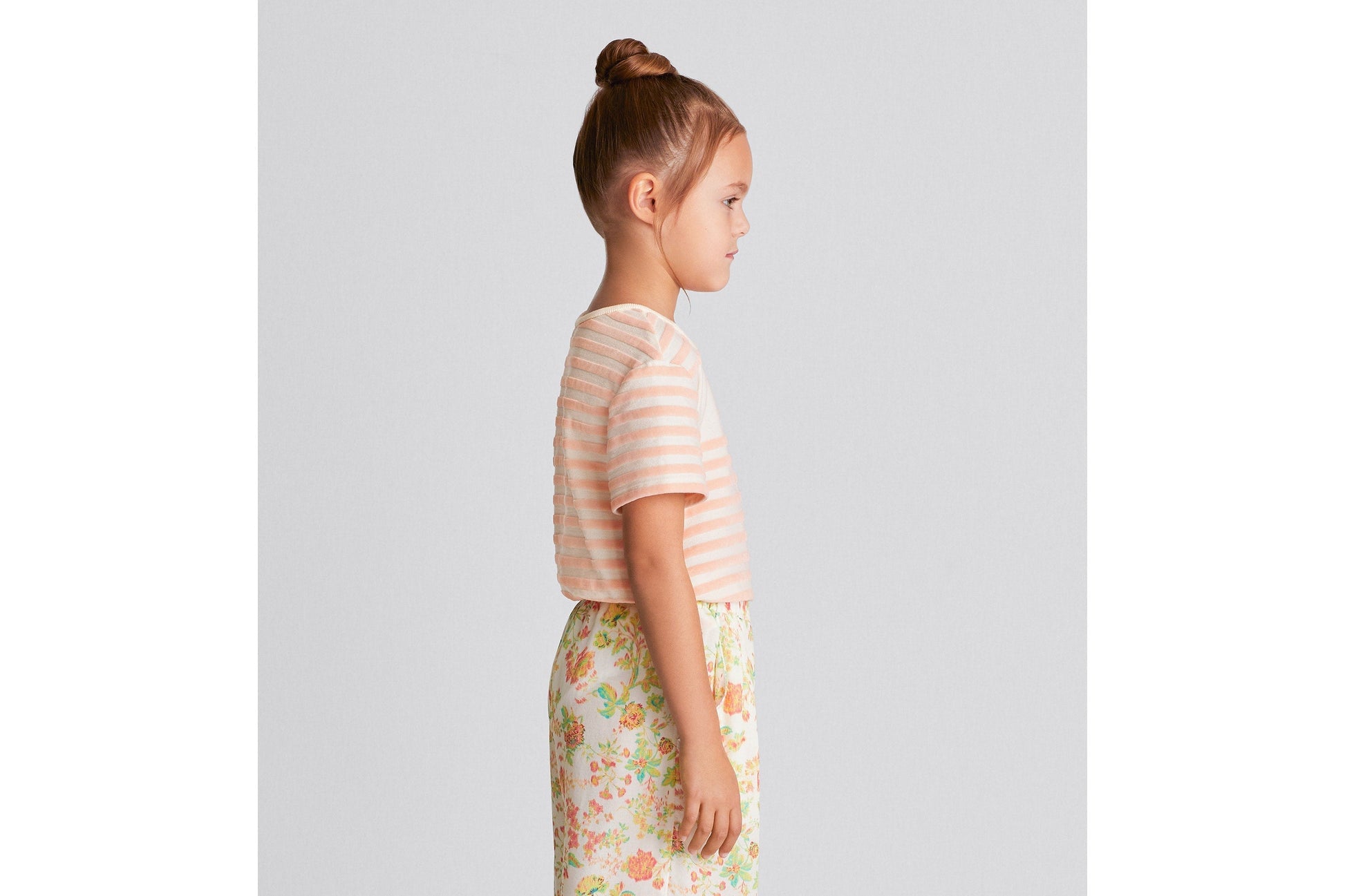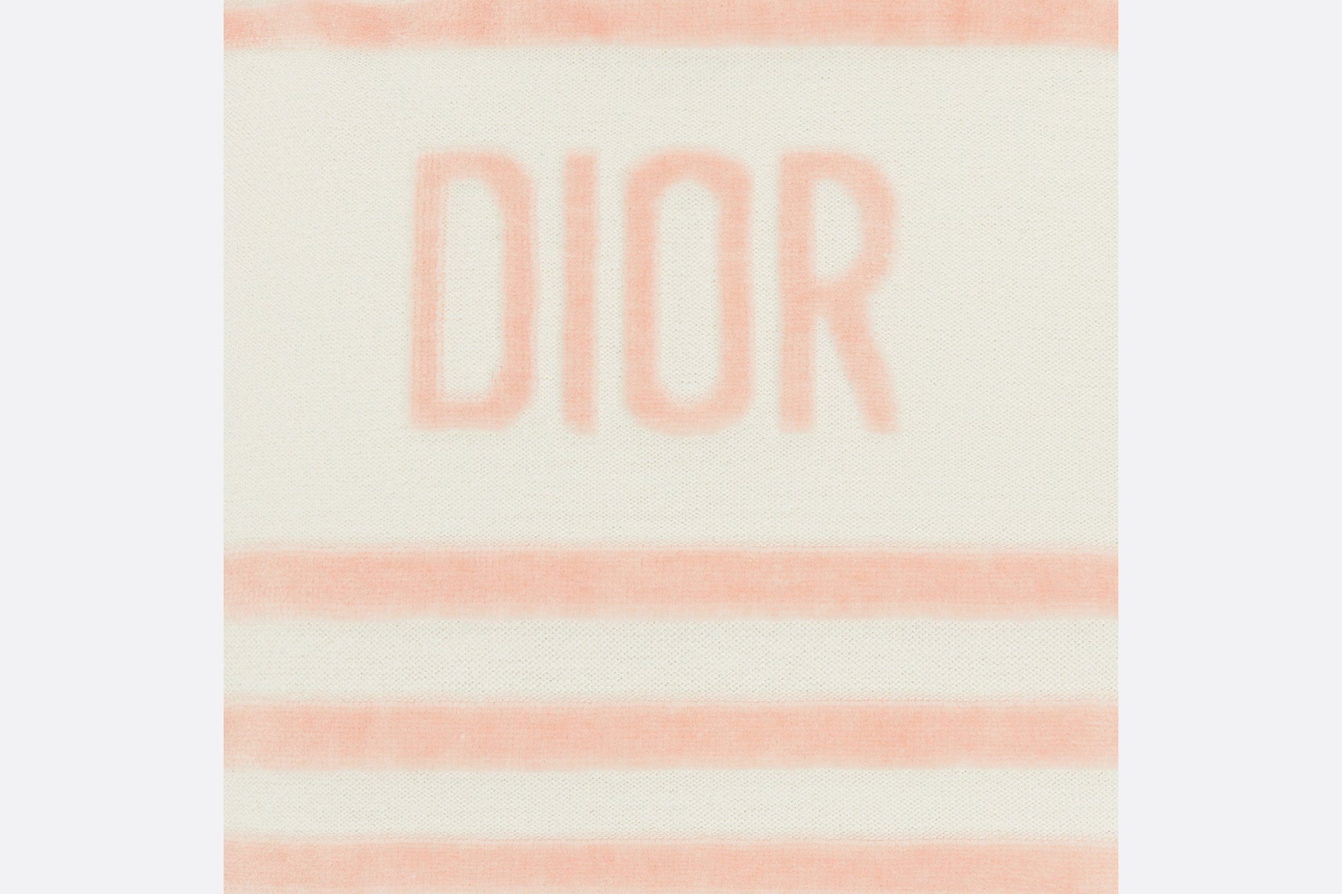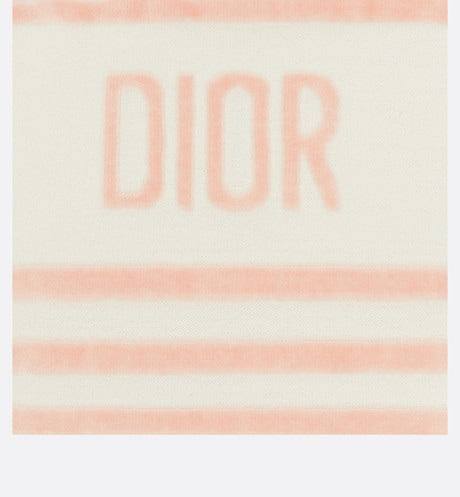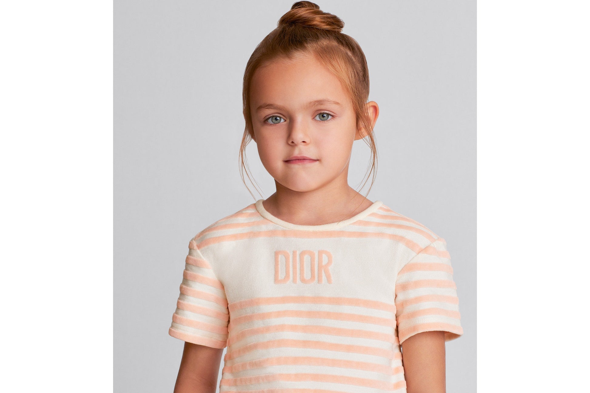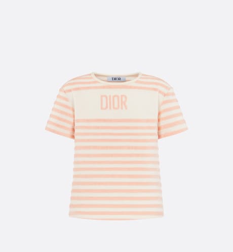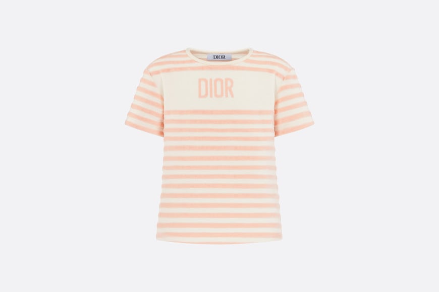 The T-shirt showcases a regular fit with laid-back appeal. Crafted in ivory velvet jersey jacquard with light coral pink stripes, it features a ribbed crew neck and a tonal Dior signature on the front. The T-shirt can be worn with a skirt or pair of pants from the collection to complete a casual look.