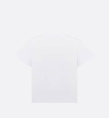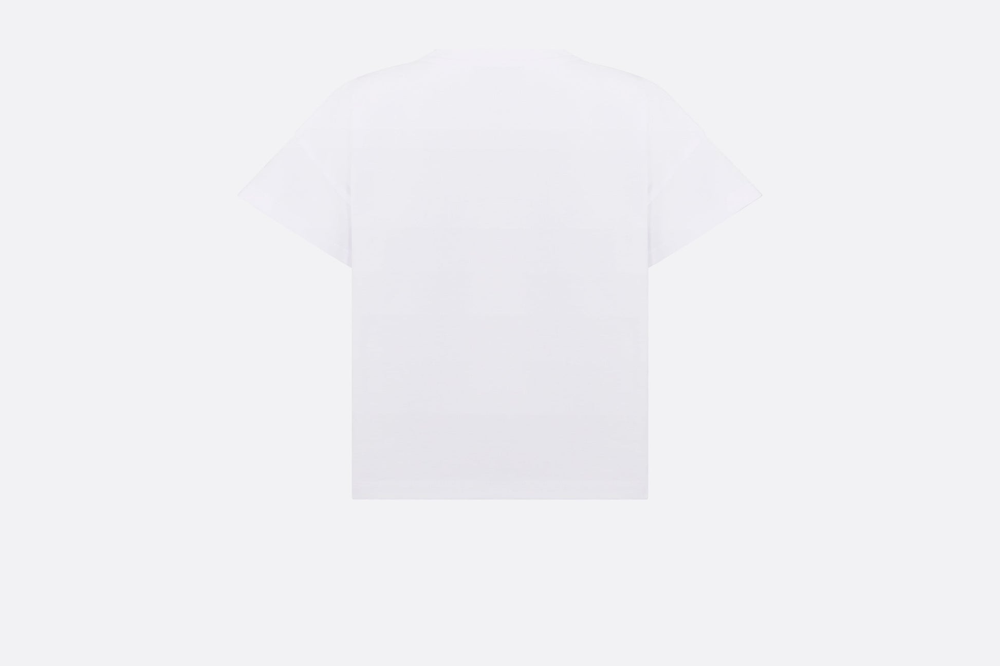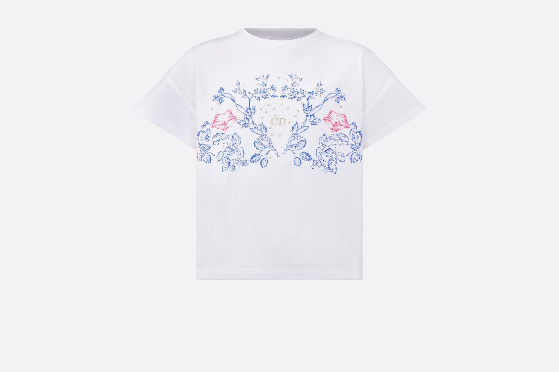 The T-shirt presents a regular fit with dropped shoulders. Crafted in white cotton jersey, it is enhanced by the Dior Botanica print in pink and blue tones completed by the pale gold-tone CD embroidery on the front. The soft, comfortable T-shirt can be worn with the pale gold-tone knit skirt from the collection for a look that's both casual and cheerful at the same time.
