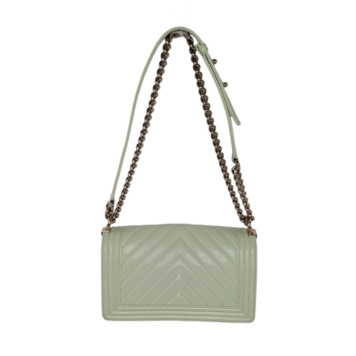 Chanel bags Caviar Chevron Quilted Medium Boy Flap in Light Green. This chic shoulder bag features luxurious chevron quilted caviar leather framed by linear quilting in green. The bag features a polished gold chain link strap with a leather shoulder pad and a polished gold facing Chanel bags CC Boy lock on the front flap. This opens to a green fabric interior with a patch pocket. Retail $5,900.
