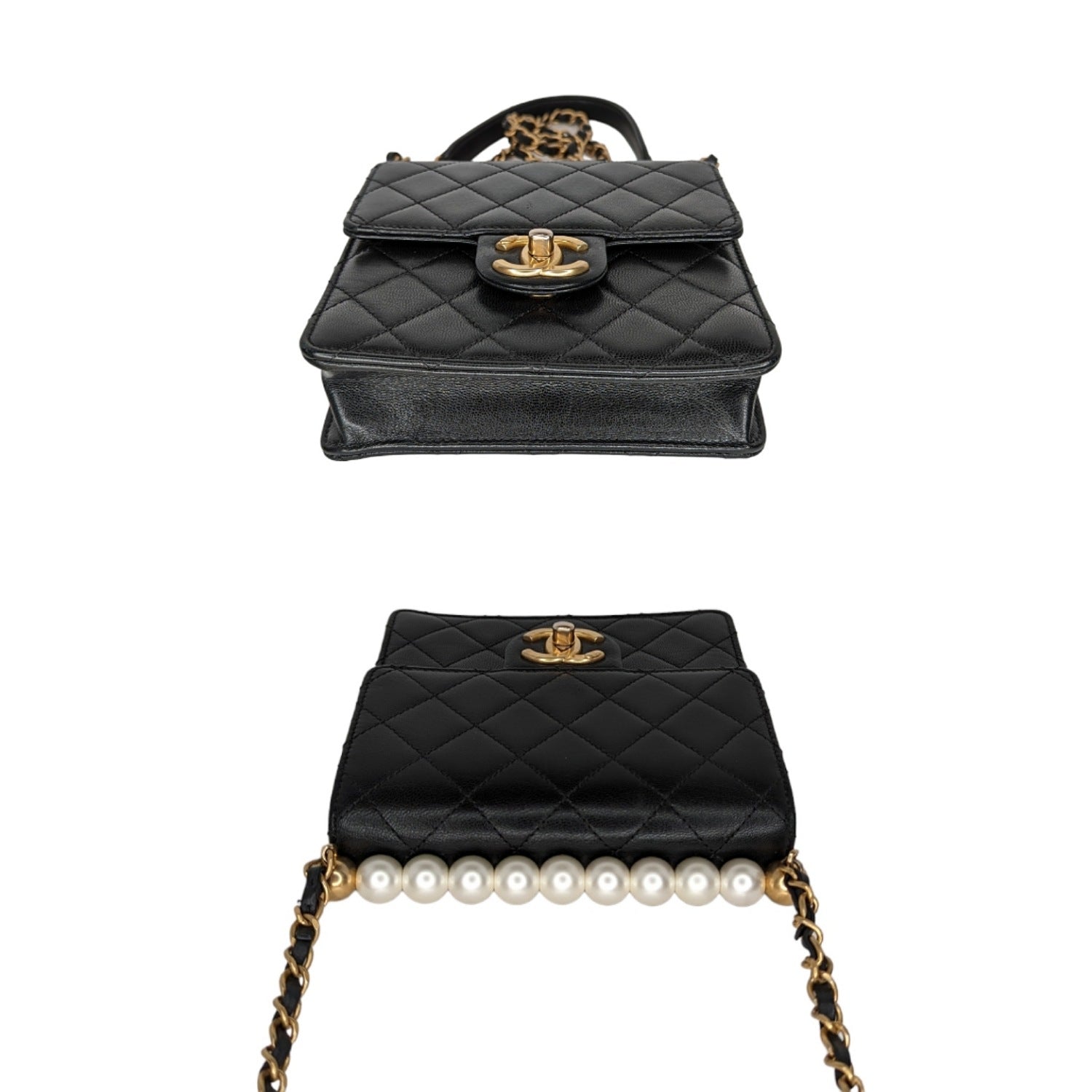 Chanel bags Goatskin Quilted Chic Pearls Flap in Black. This stylish shoulder bag is crafted of diamond-quilted textured goatskin leather. The bag features leather threaded aged gold chain strap, imitation pearls aligned on the top, and a flap with an aged gold classic CC turn lock. This opens to a gold leather interior with patch pockets.