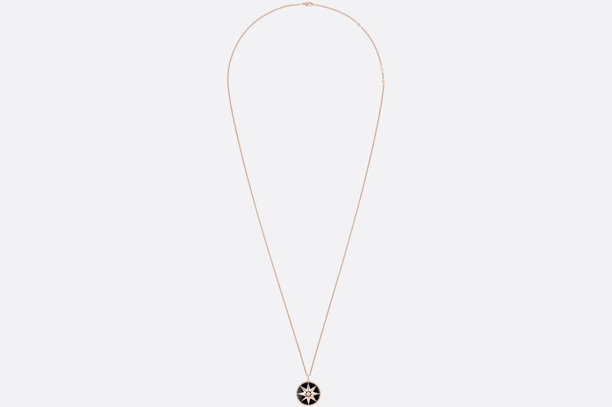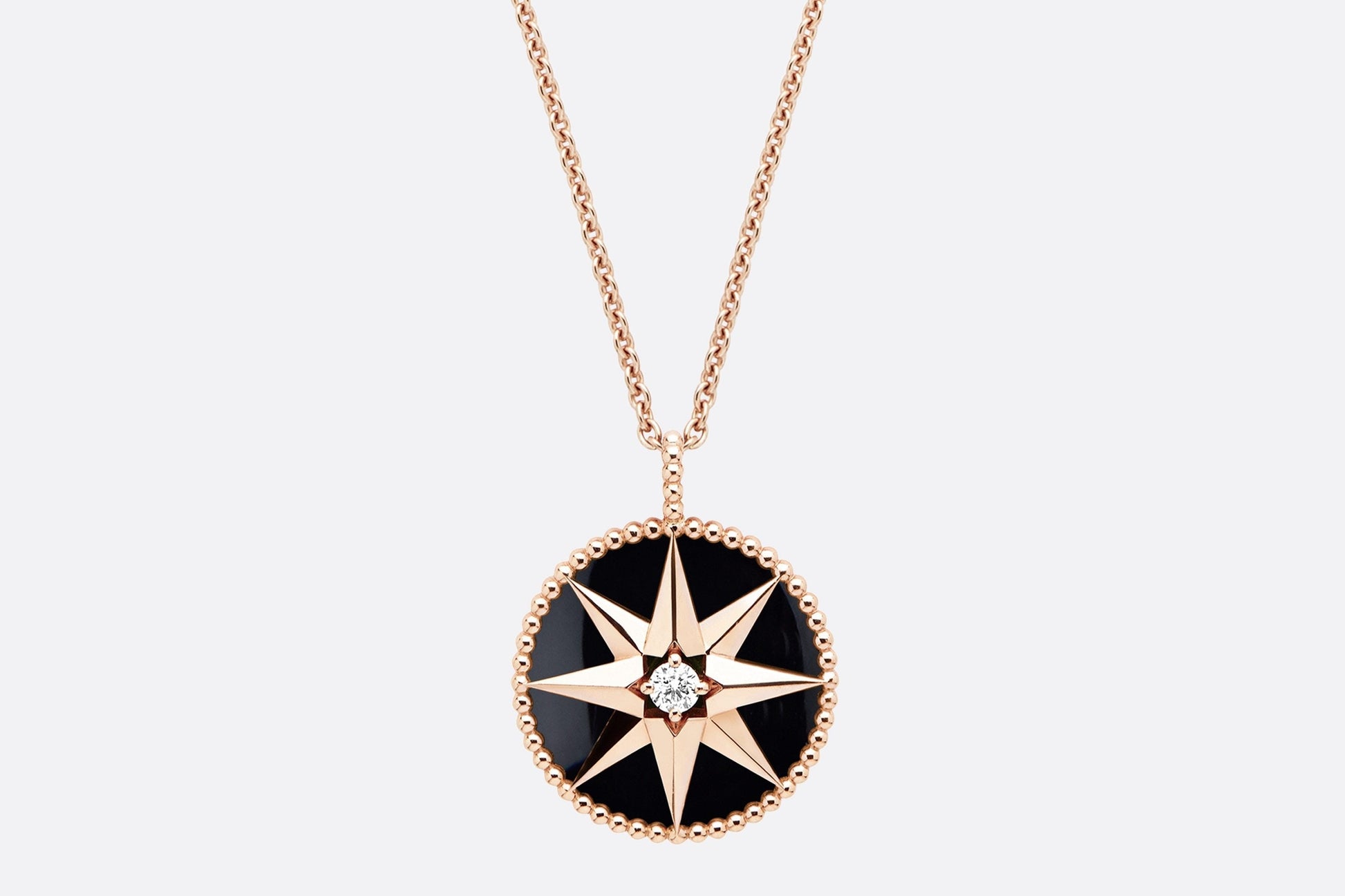 Victoire de Castellane reinterprets Mr. Dior's lucky star in the form of a wind rose, an eight-pointed star design. A twist of grains encircles the medallion, which turns on its chain to switch between the gemstone or wind rose side.