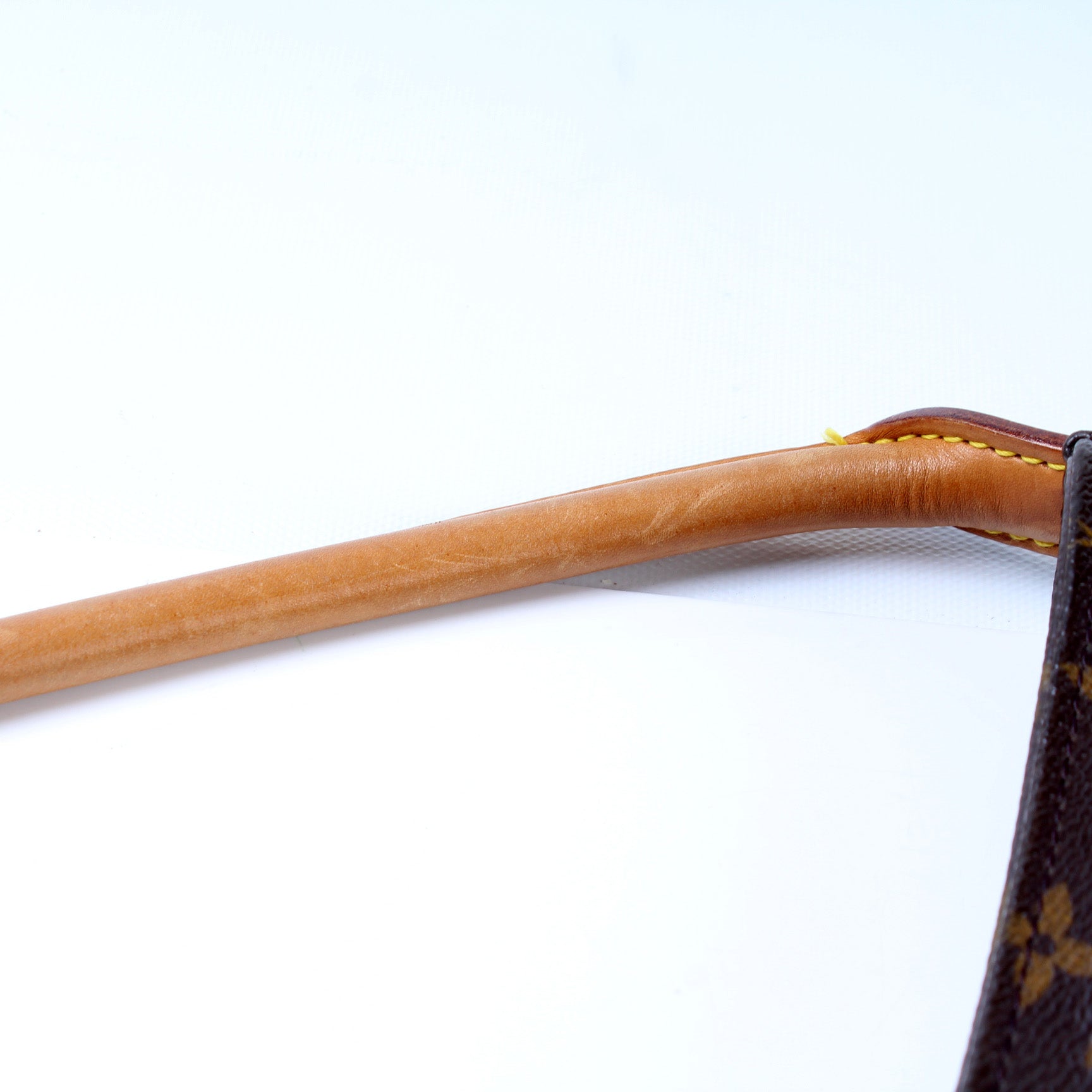 Handle: The leather handle shows discoloration and scuffs throughout.