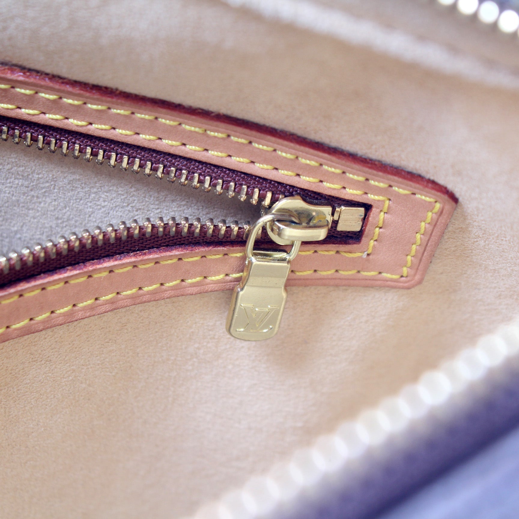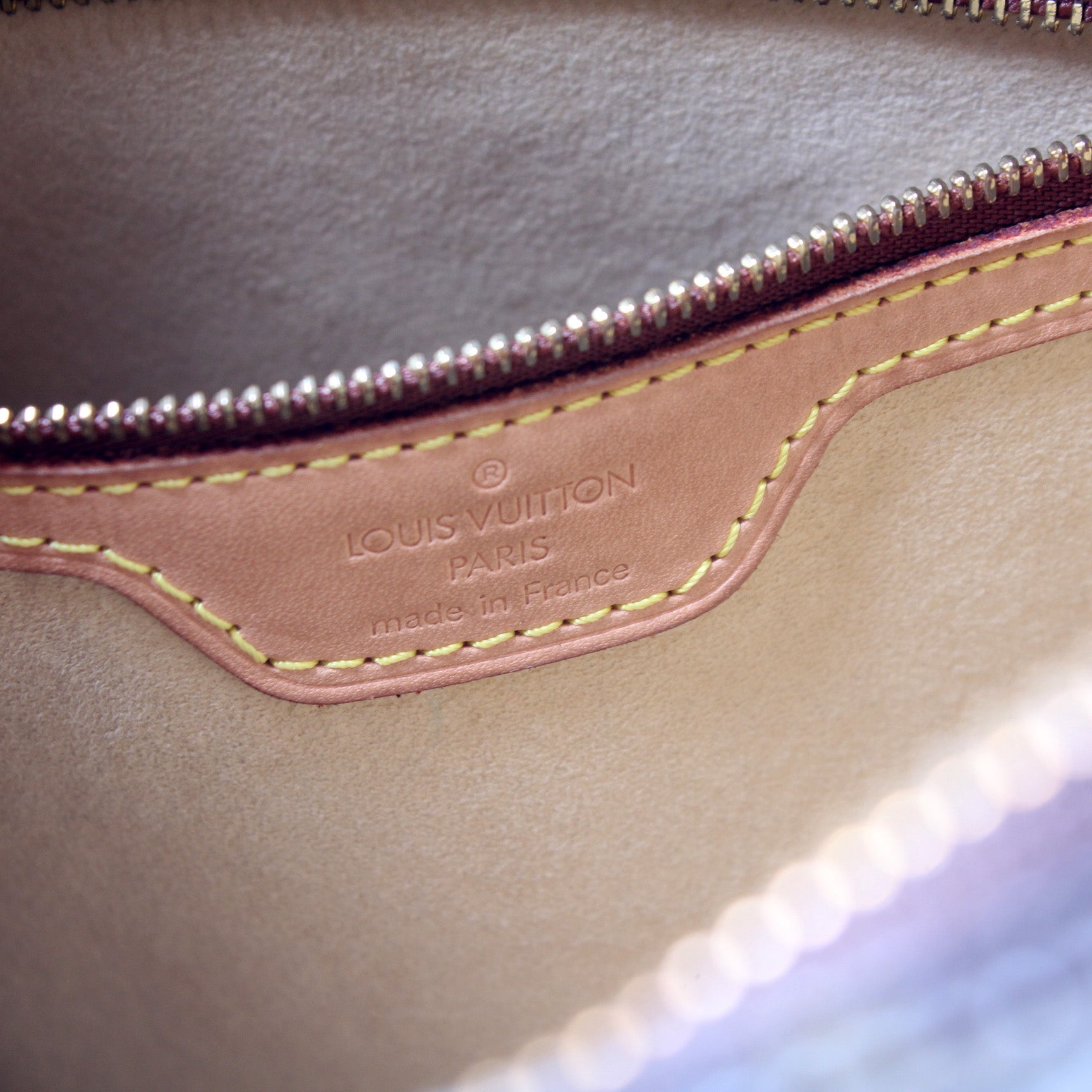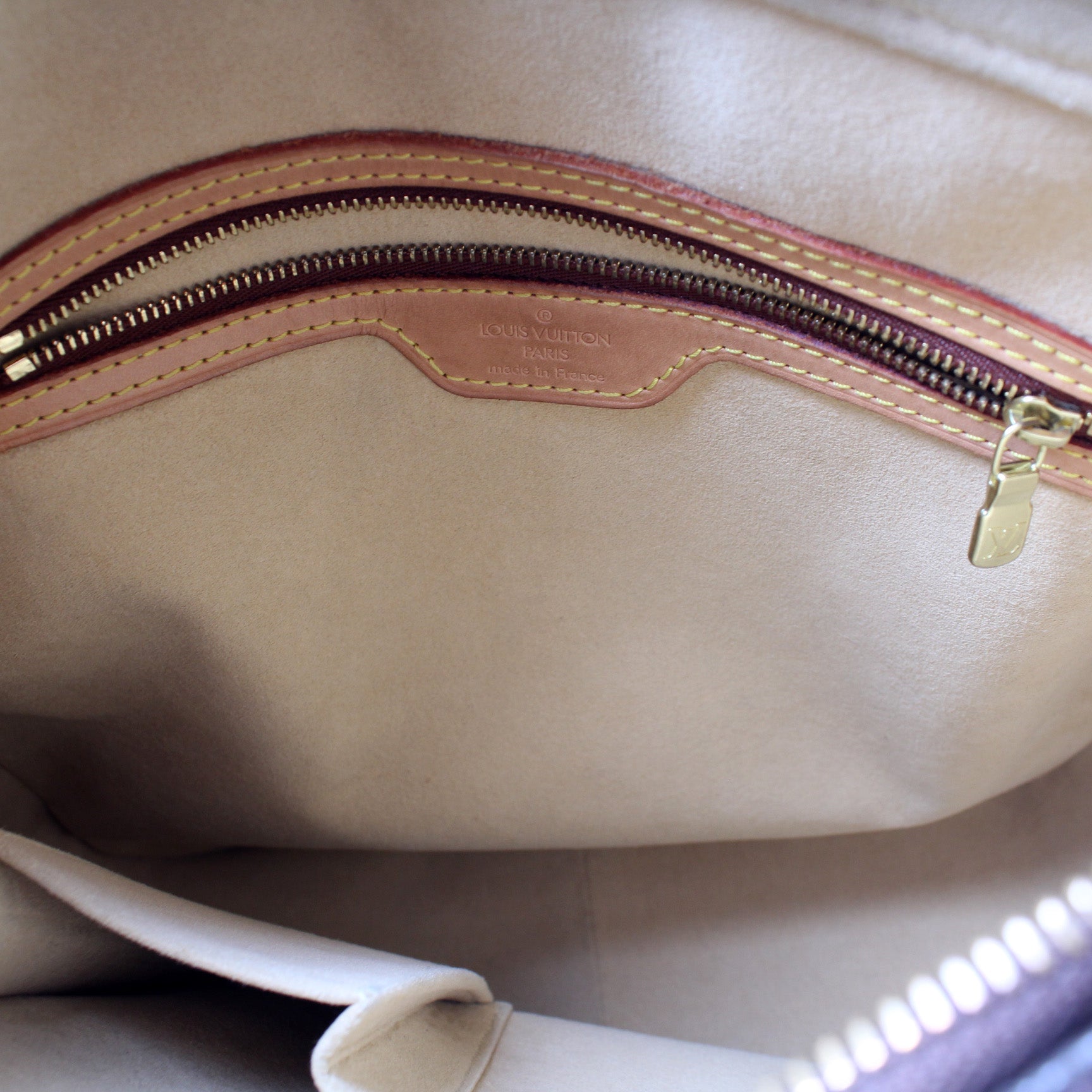 Interior: The interior shows light staining and is free of rips or tears. The interior features one zipper pocket and one open pocket.