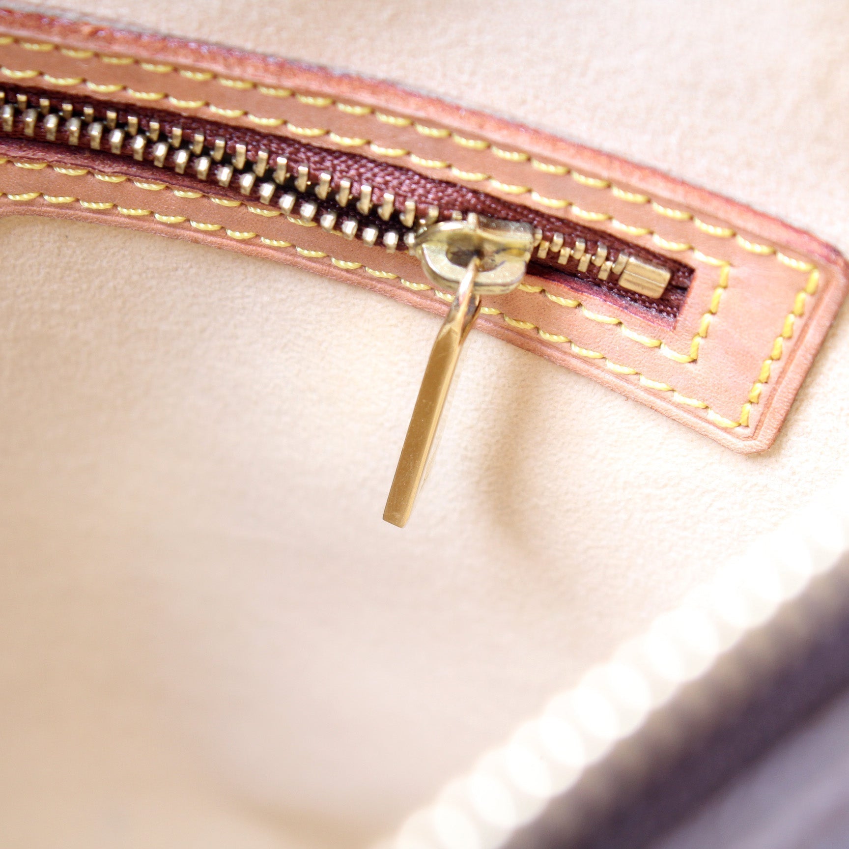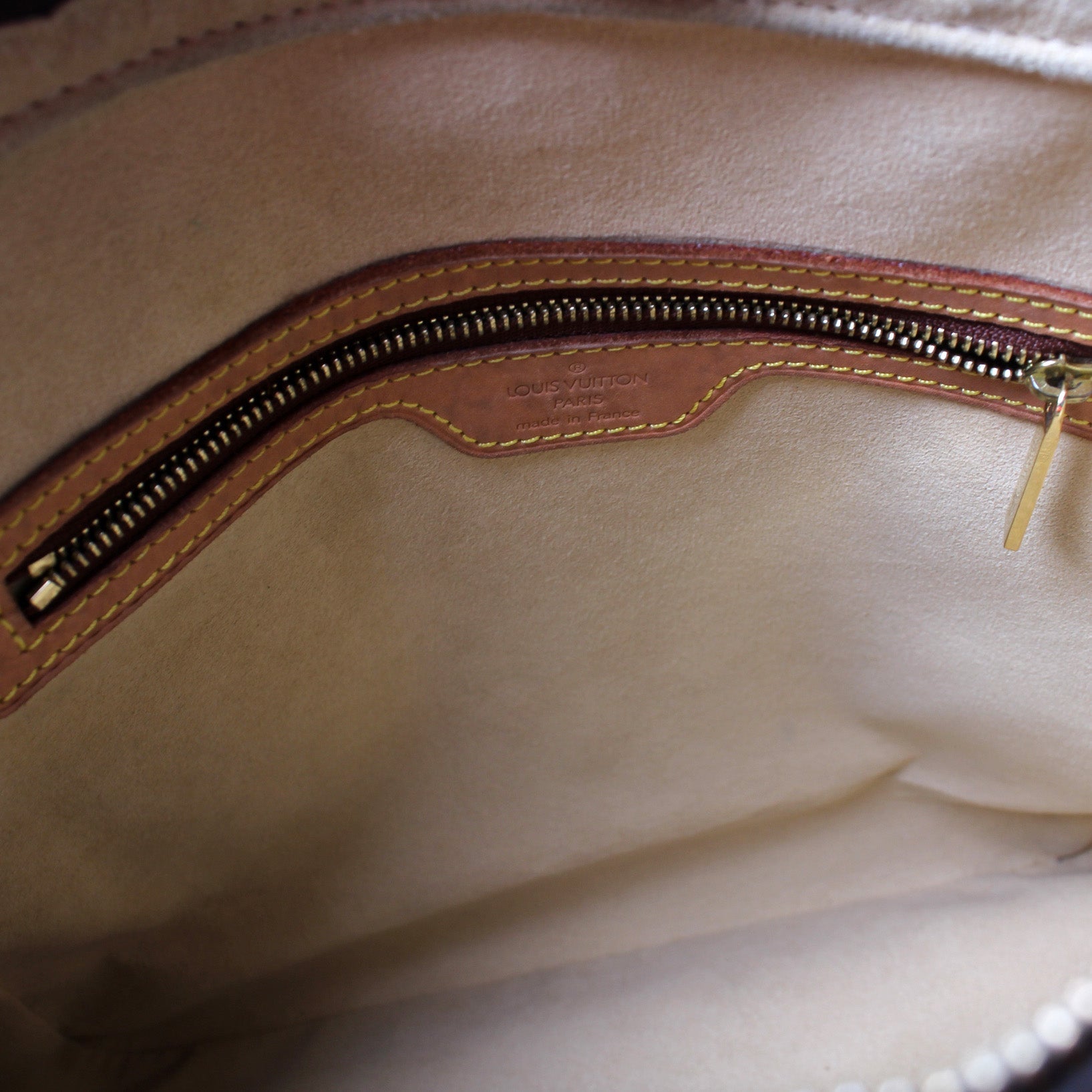 Interior: The interior is free of rips or tears. The interior features one zipper pocket and one open pocket.