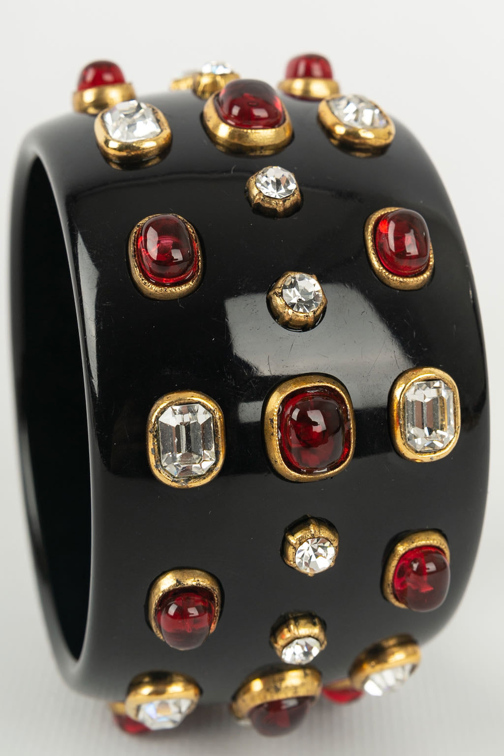 CHANEL -Manchette en bakélite noire pavée de strass et cabochons de pâte de verre. Collection 1985.