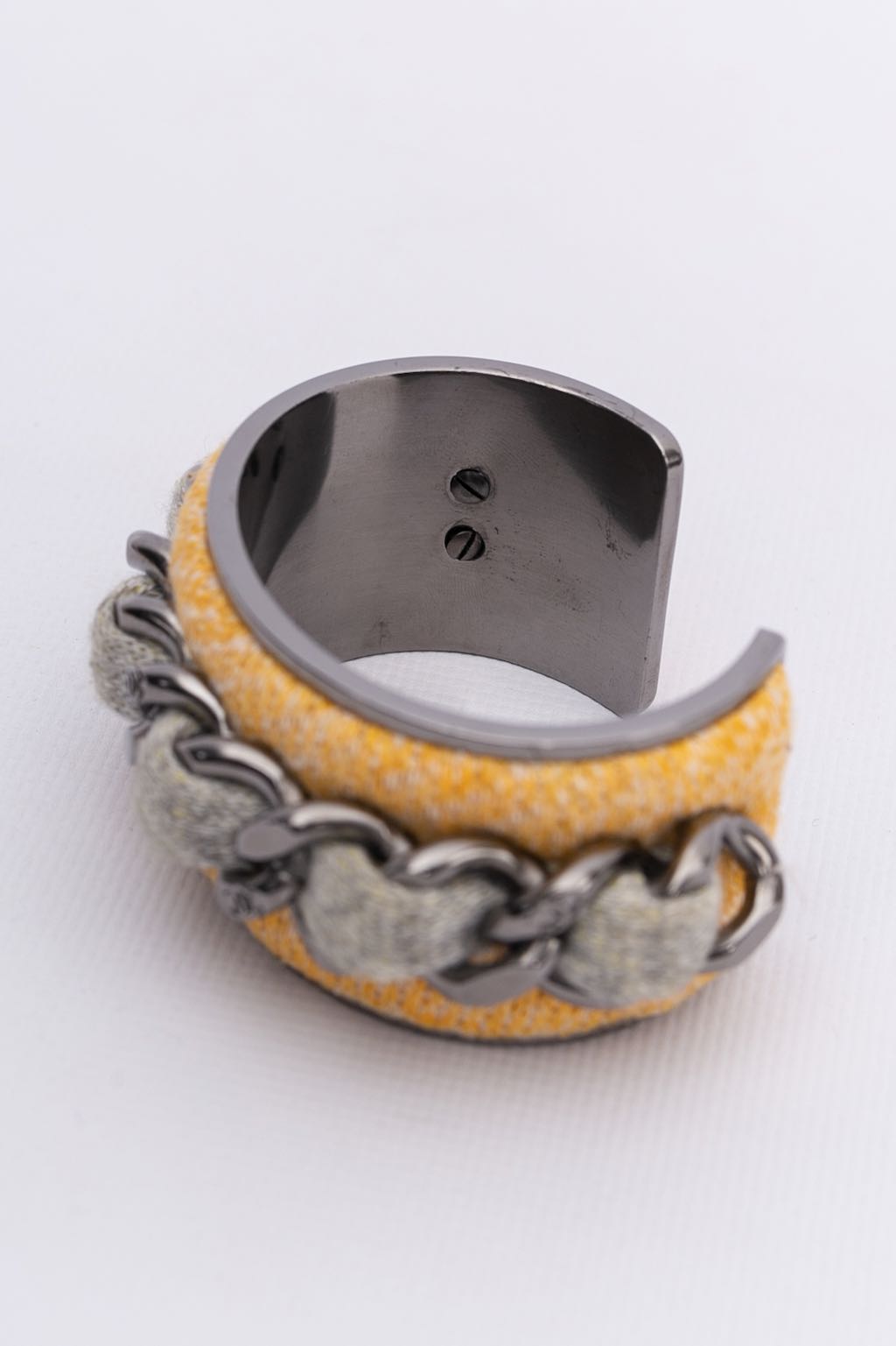 CHANEL (Défilé) Bracelet manchette en métal argenté foncé et tweed jaune et gris. Modèle non signé.