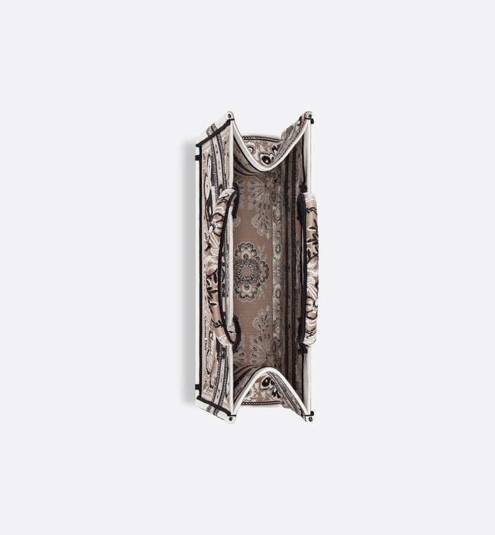 Introduced by Maria Grazia Chiuri, Creative Director of Christian Dior, the Dior Book Tote has become a staple of the Dior aesthetic. Designed to hold all the daily essentials, the style is fully embroidered with a beige multicolor Butterfly Bandana motif, combining the butterfly with the timeless bandana pattern in a graphic spirit. Adorned with the Christian Dior Paris signature on the front, the medium tote exemplifies the House's signature savoir-faire and may be carried by hand or worn over the shoulder.