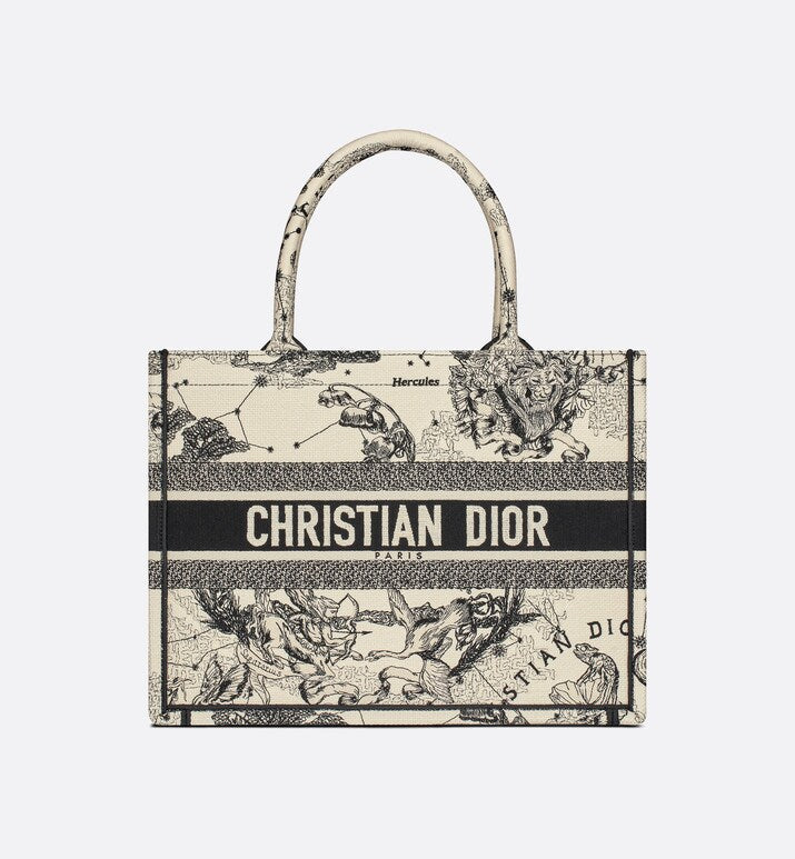 Introduced by Maria Grazia Chiuri, Creative Director of Christian Dior, the Dior Book Tote has become a staple of the Dior aesthetic. Designed to hold all the daily essentials, the style is fully embroidered with the latte and black Dior Zodiac motif created by the artist Pietro Ruffo. Adorned with the Christian Dior Paris signature on the front, the medium tote exemplifies the House's signature savoir-faire and may be carried by hand or worn over the shoulder.