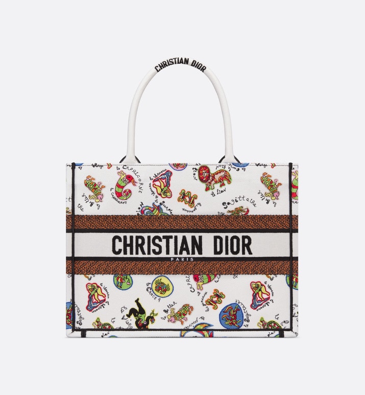 Introduced by Maria Grazia Chiuri, Creative Director of Christian Dior, the Dior Book Tote has become a staple of the Dior aesthetic. Designed to hold all the daily essentials, the style is fully embroidered with an all-over Zodiac motif, a signature of the colorful Niki de Saint Phalle capsule collection. Enhanced by a Christian Dior Paris signature on the front, the medium tote exemplifies the House's signature savoir-faire and may be carried by hand or worn over the shoulder.